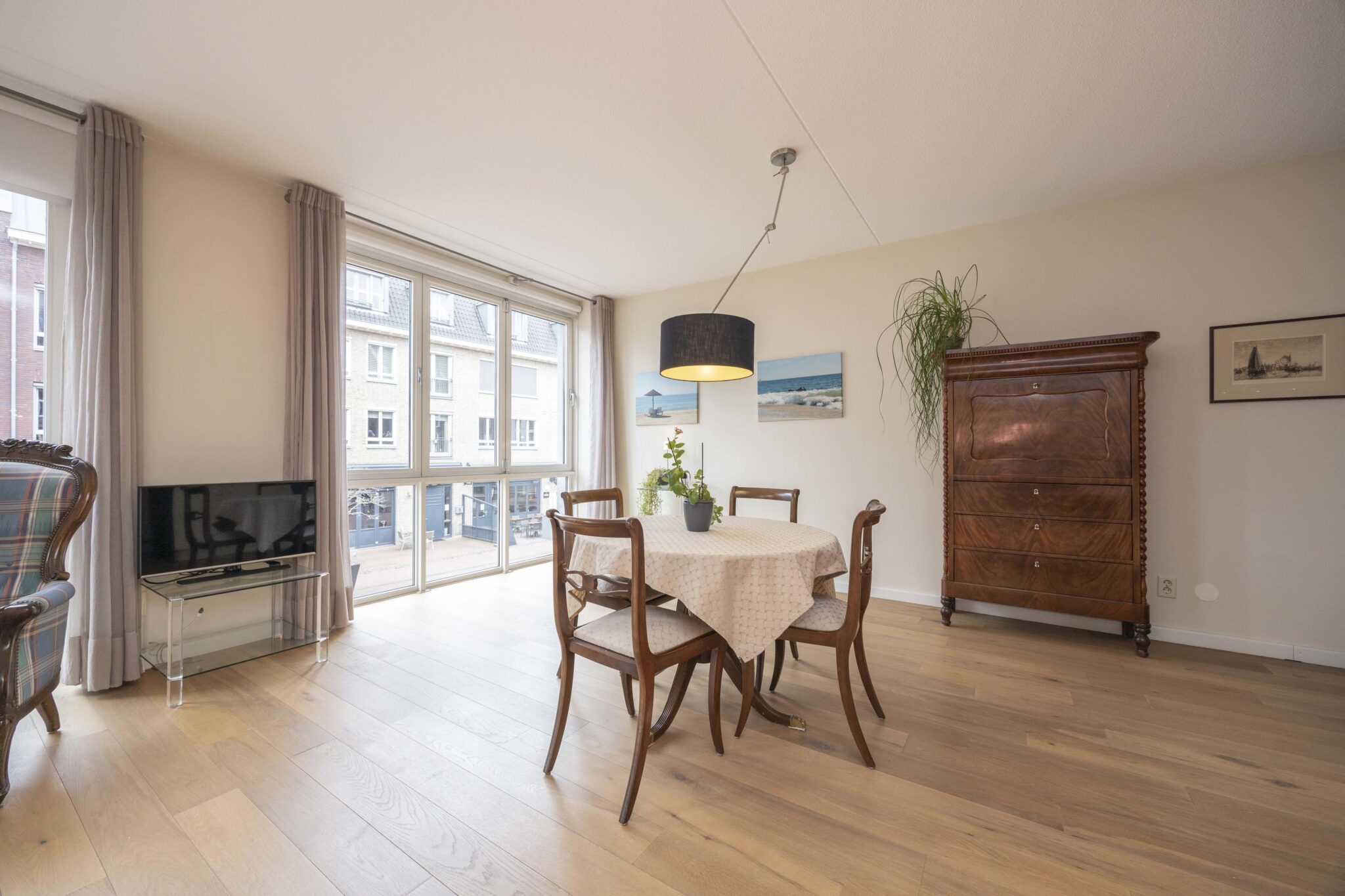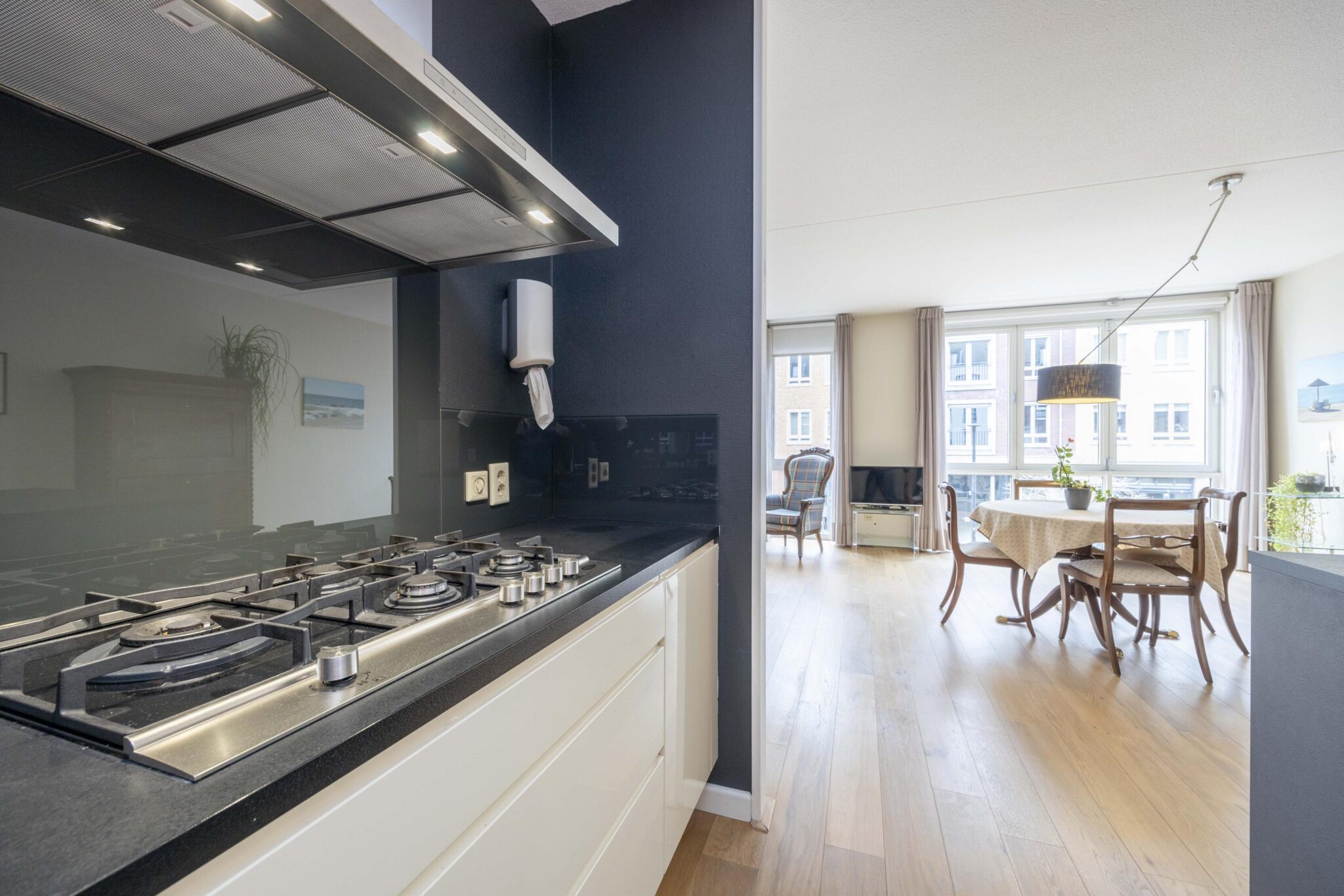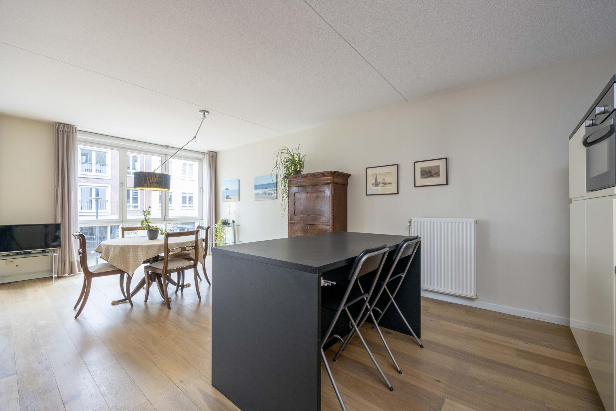 Bij binnenkomst in de living valt direct de prettige lichtinval op dankzij de raampartijen aan de zijde van het Lindeplein. Één van deze ramen betreft een harmonica raampartij die volledig geopend kan worden tijdens zonnige dagen. De leefruimte is voorzien van een nette houten parketvloer, is ruim van opzet en biedt veelzijdige indelingsmogelijkheden met aangrenzend het keukengedeelte.