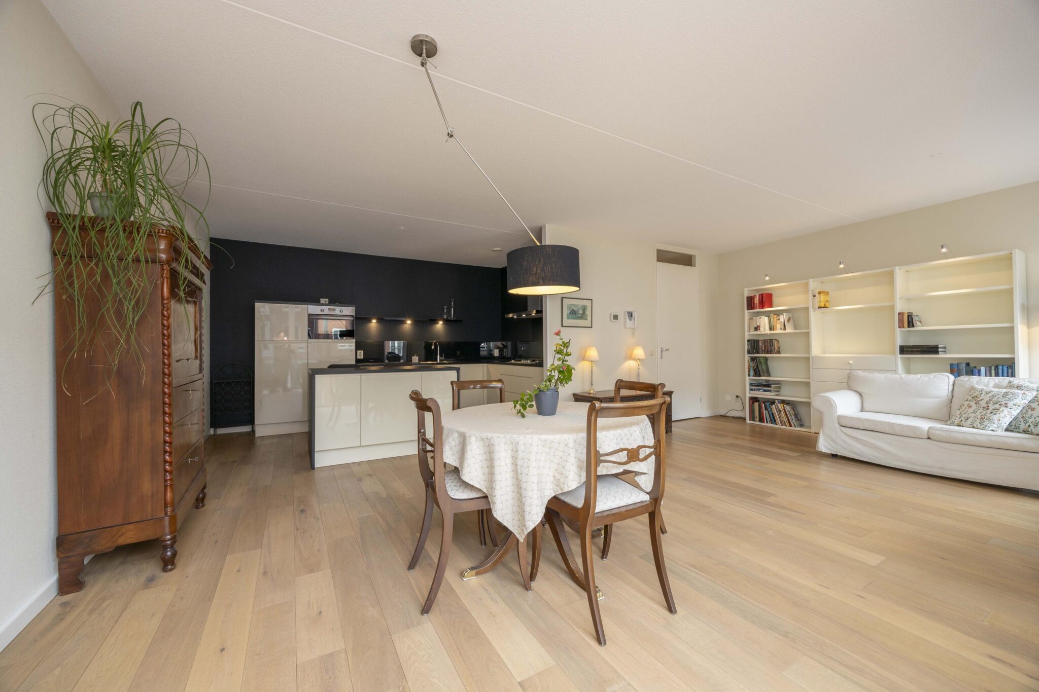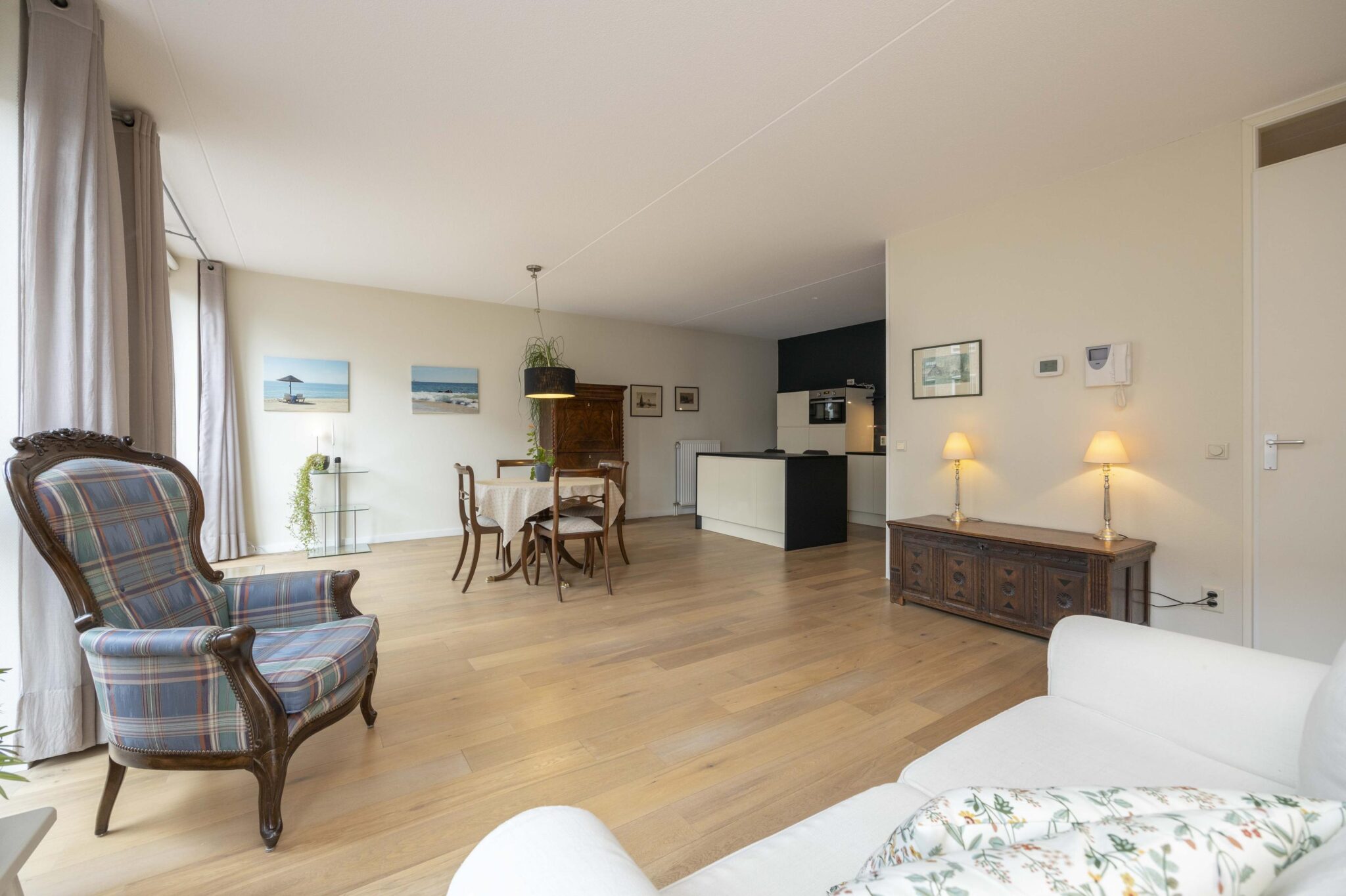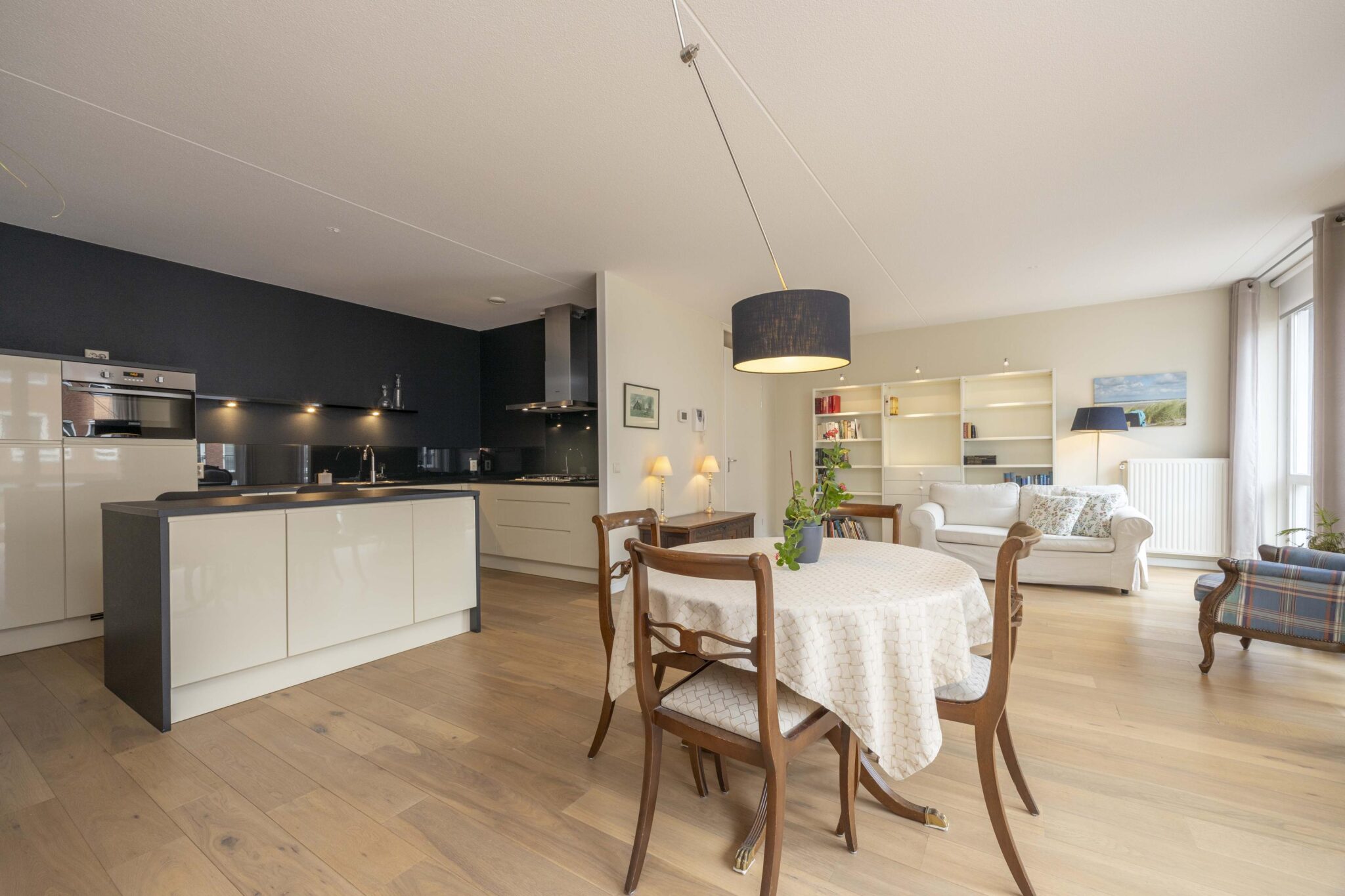 Bij binnenkomst in de living valt direct de prettige lichtinval op dankzij de raampartijen aan de zijde van het Lindeplein. Één van deze ramen betreft een harmonica raampartij die volledig geopend kan worden tijdens zonnige dagen. De leefruimte is voorzien van een nette houten parketvloer, is ruim van opzet en biedt veelzijdige indelingsmogelijkheden met aangrenzend het keukengedeelte.