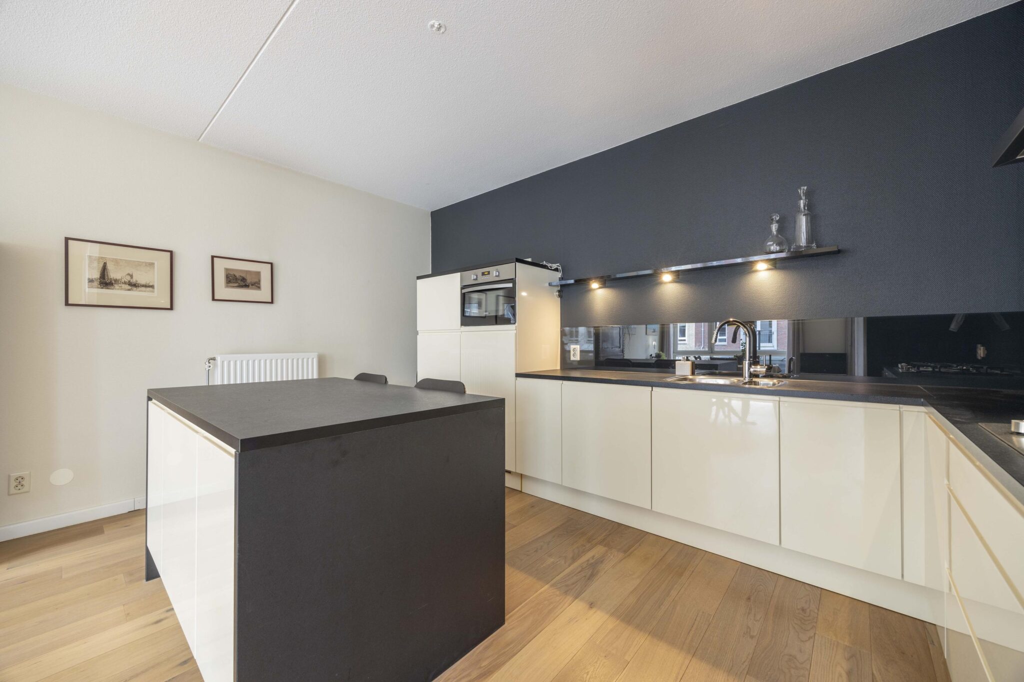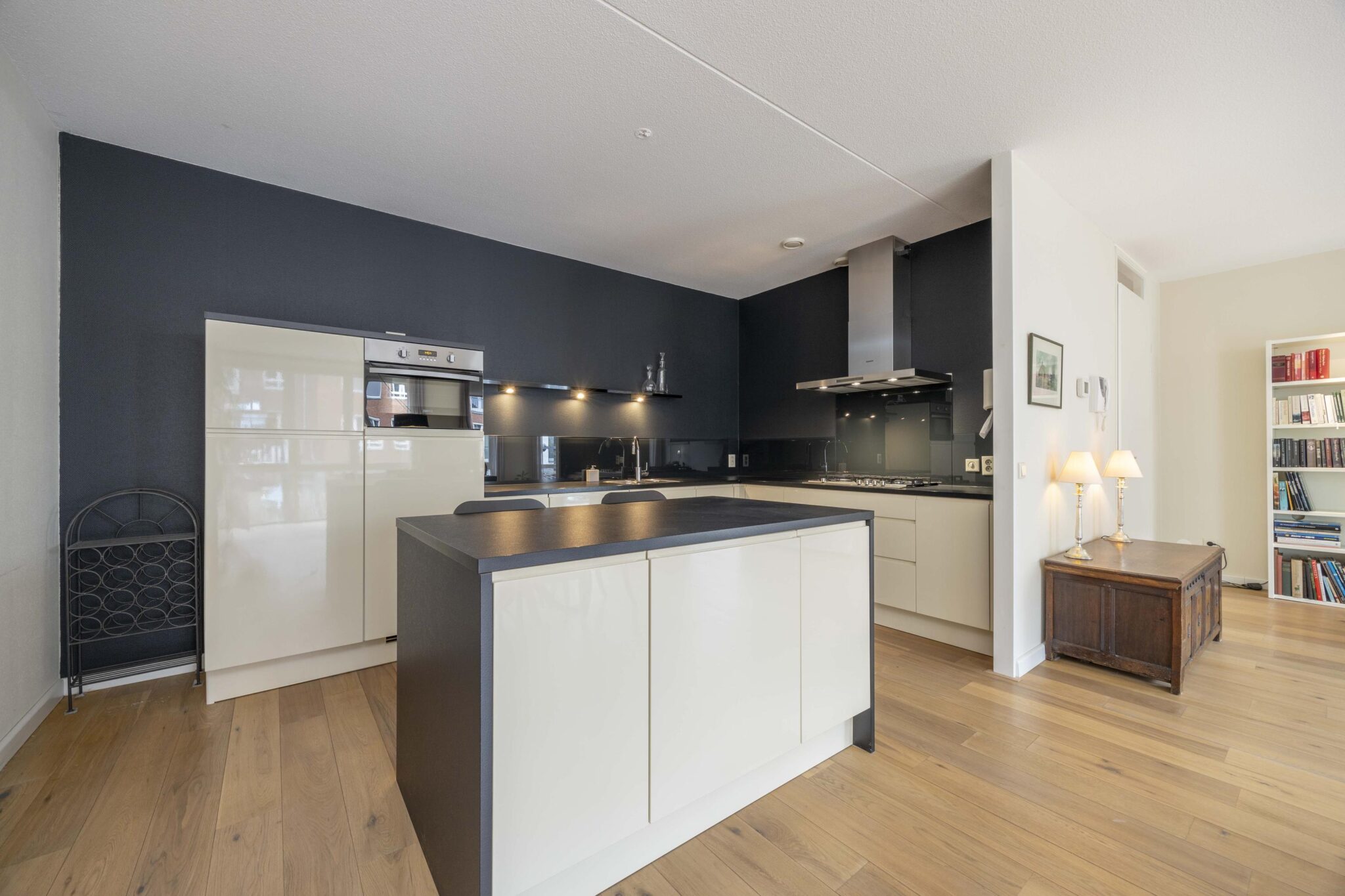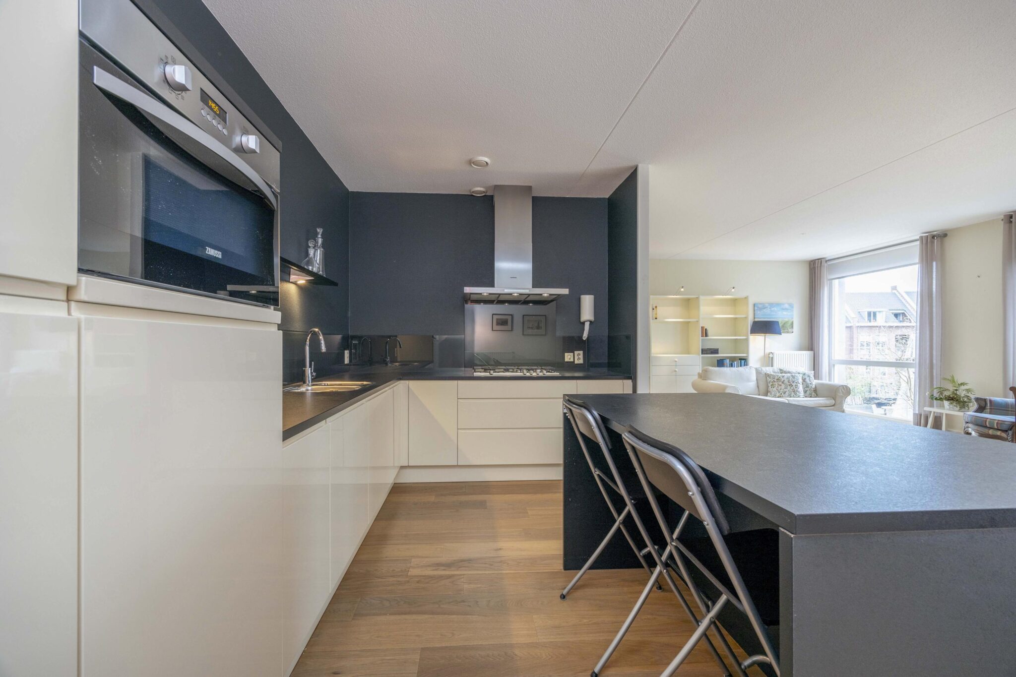 De halfopen keuken is uitgevoerd in een hoekopstelling met een centraal werkeiland en praktische zitbar. De keuken is compleet uitgerust met een 5-pits gasfornuis met afzuigkap, dubbele spoelbak, combi oven-magnetron, vaatwasser, koelkast met vriesvak en beschikt over een uitgebreide hoeveelheid kastruimte. Vanuit de zitbar geniet u van een fraai uitzicht over de living en het Lindeplein.