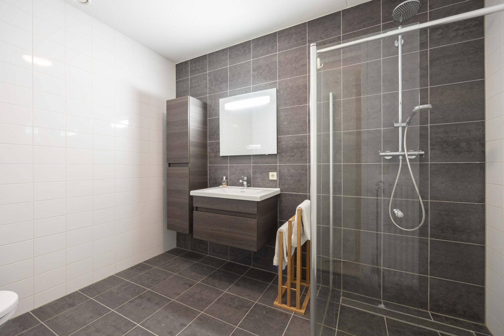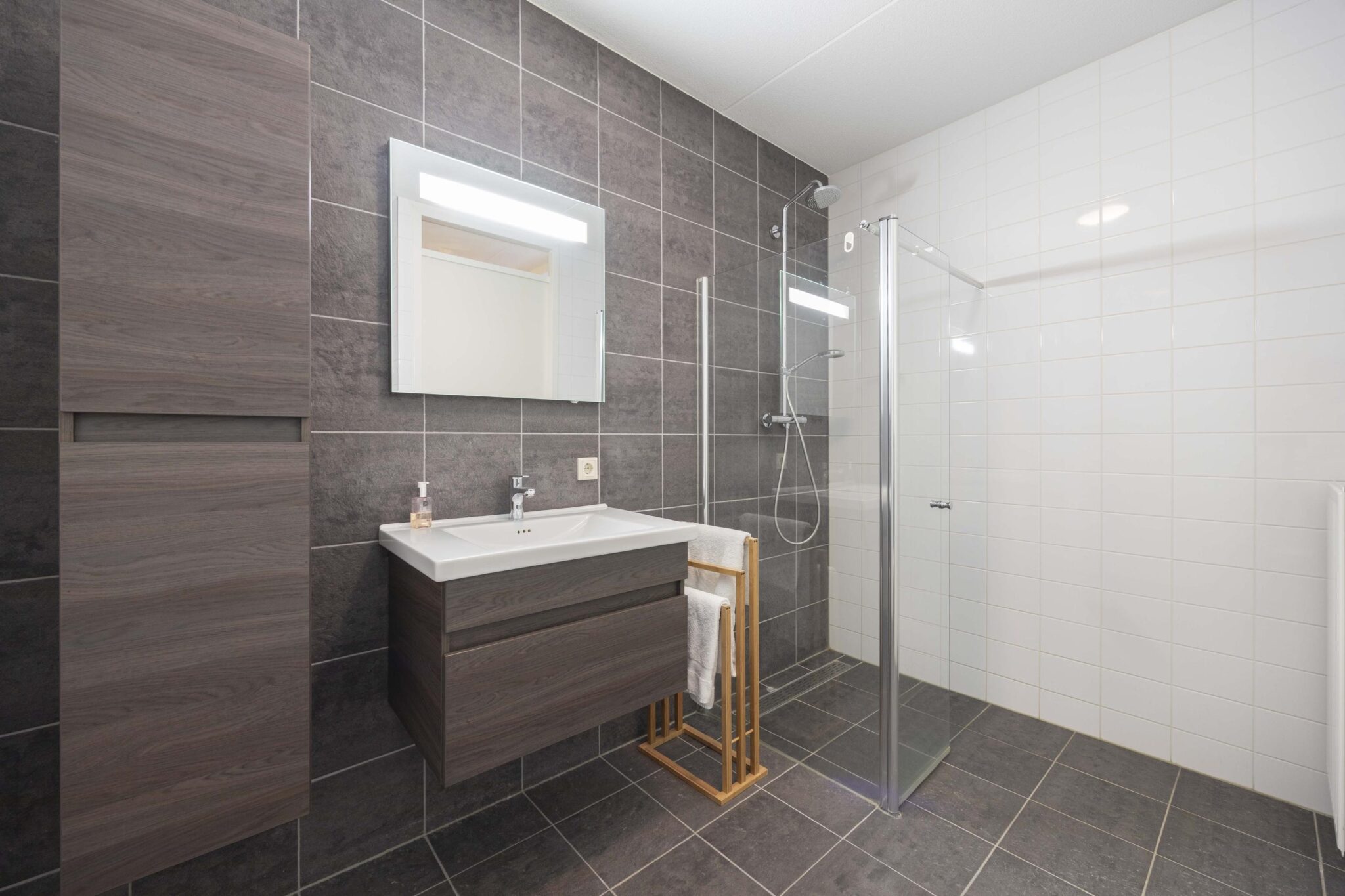 Vanuit de hal zijn eveneens de separate toiletruimte met wandcloset en fonteintje, berging met de cv-opstelling en wasvoorzieningen en de badkamer bereikbaar. De badkamer is volledig betegeld en voorzien van een ruime inloopdouche met regen- en handdouche, wastafel in meubel met daarboven een bijpassende spiegel met geïntegreerde verlichting, radiator en tot slot een wandcloset.