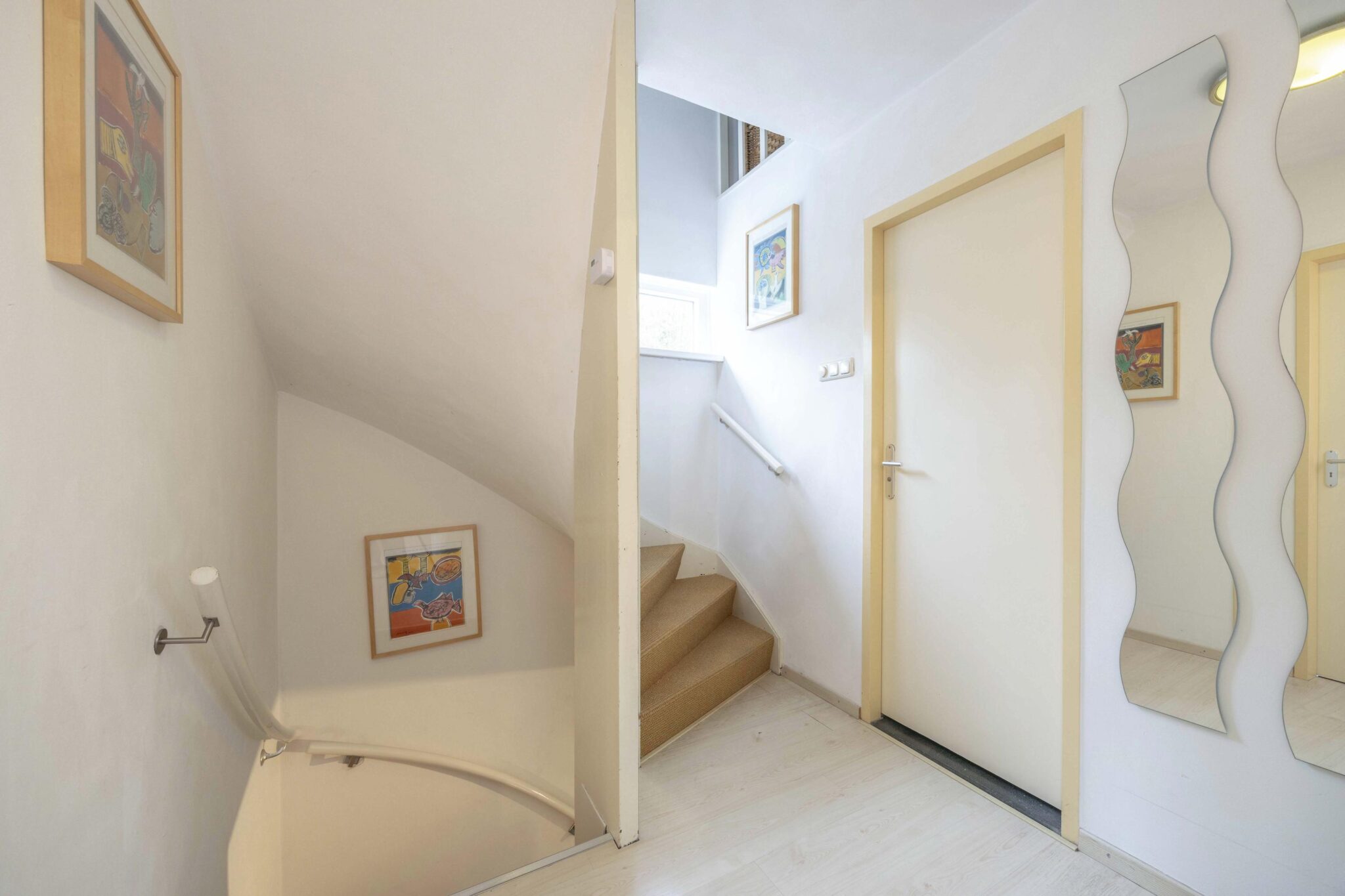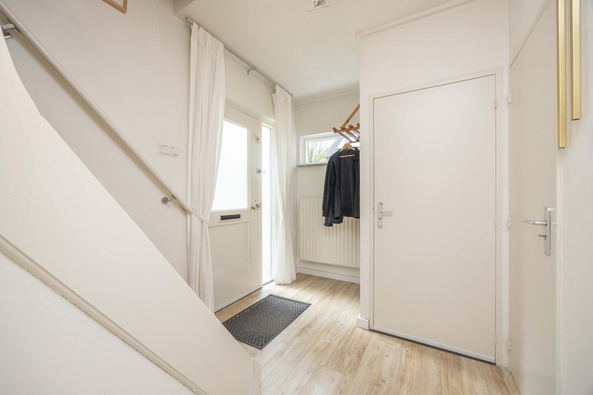 Via de voordeur onder de carport heeft u toegang tot de woning. De carport biedt plaats voor het parkeren van één auto. De entree is voorzien van een chique houtlook laminaat-vloer, doorgelegd naar de living. Via de entree heeft u toegang tot de toiletruimte met wandcloset en fonteintje, trapopgang naar de eerste verdieping, kelderkast en tot slot de living.