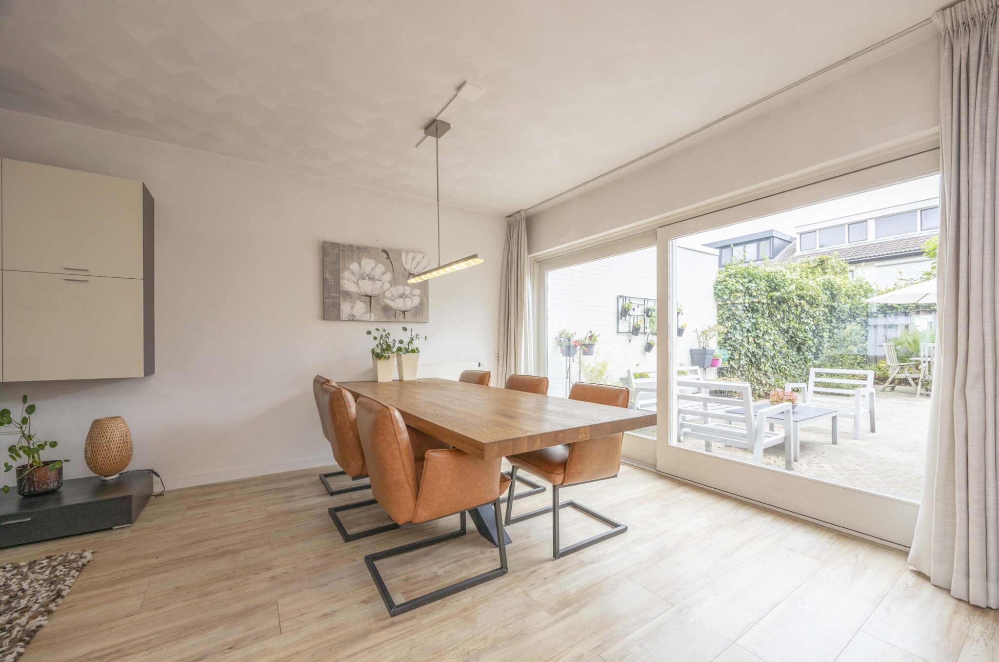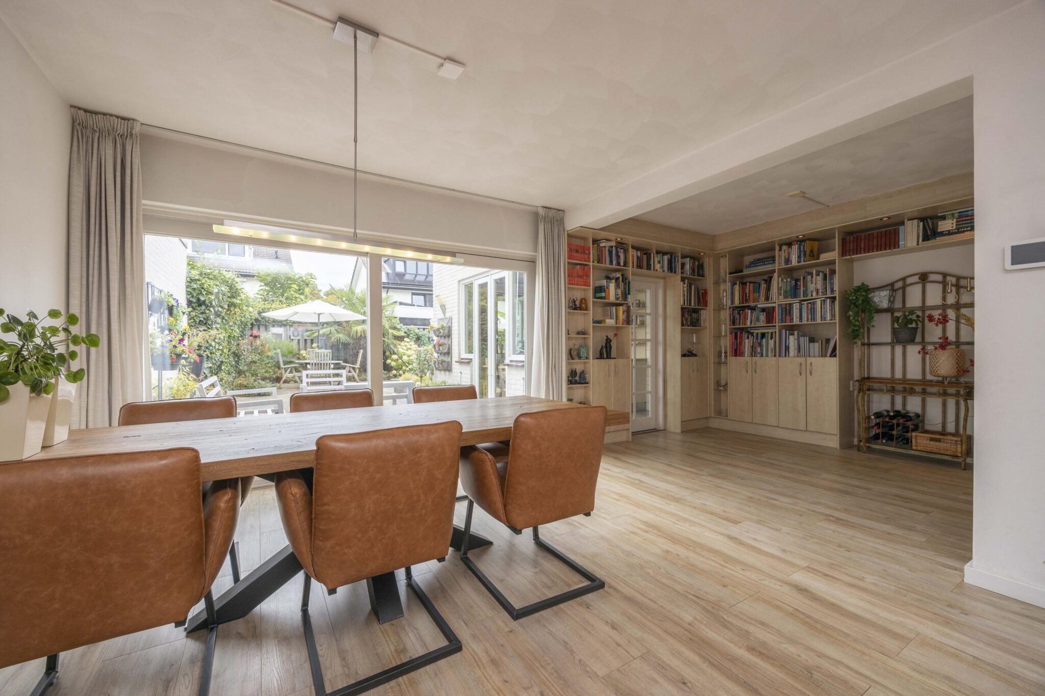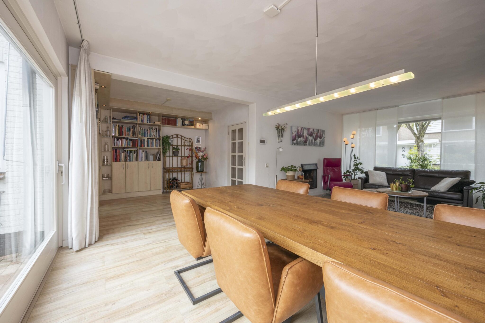 Aan de voorzijde van de living situeert zich het woonkamergedeelte met openhaard en raampartij met rolluik, aan de achterzijde een gezellig zit-/eetgedeelte met uitkijk over uw achtertuin. De living is voorzien van riante raampartijen aan zowel de voor- en achterzijde, met aan de achterzijde een schuifpui die tijdens de zomermaanden het heerlijke buitenleven naar binnen haalt. Hier profiteert u tevens van praktische opbergruimte dankzij de maatwerk kastenwanden.