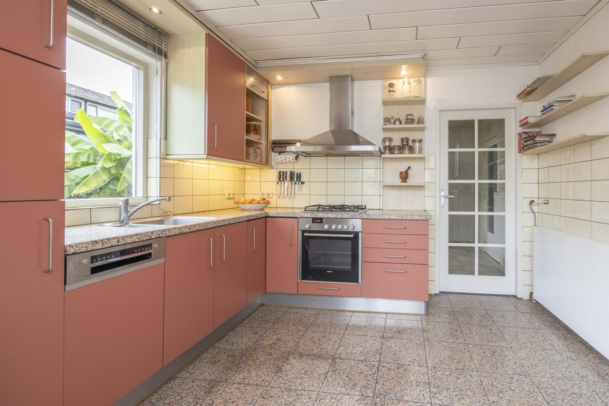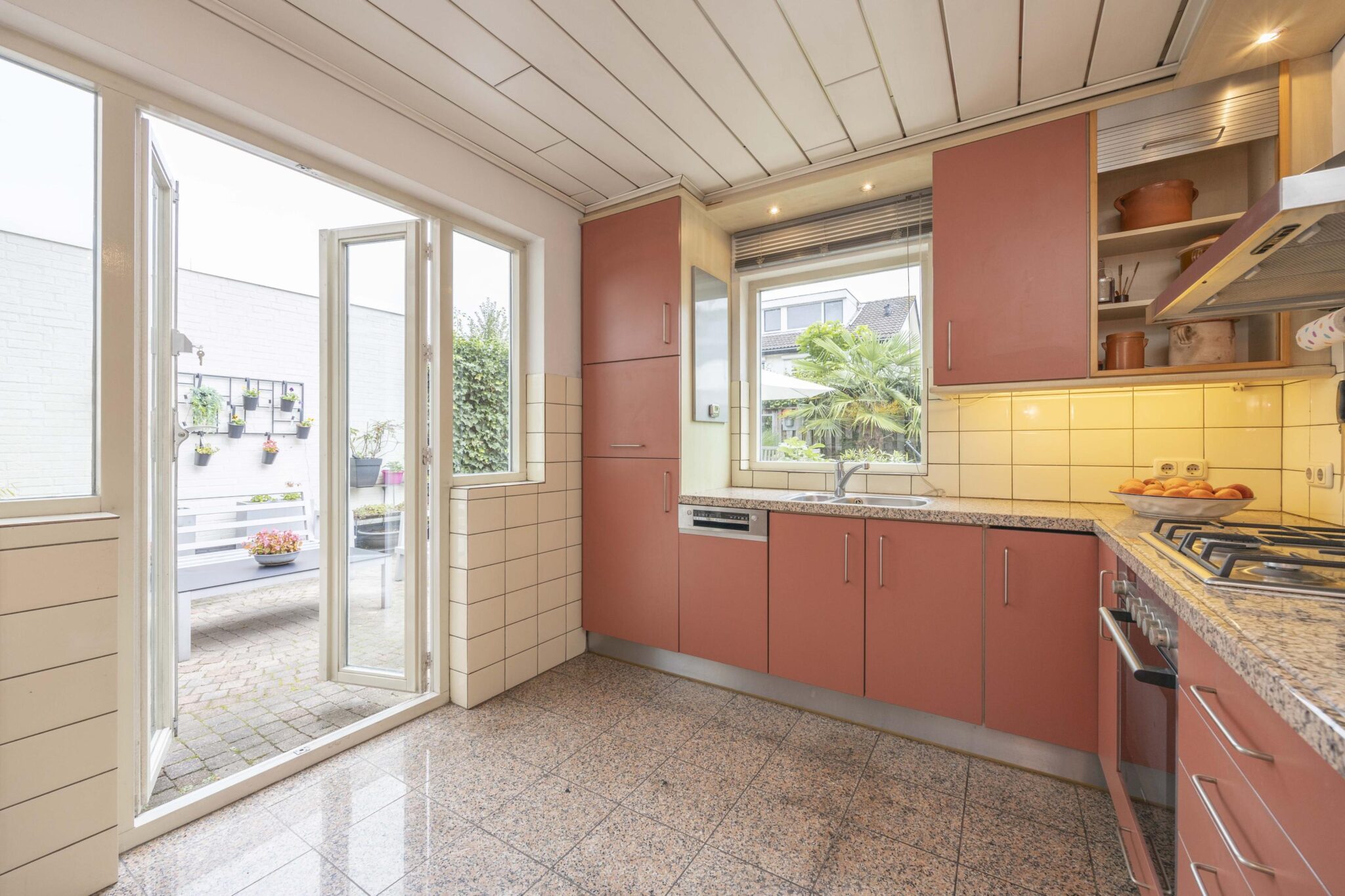 De keuken in hoekopstelling is voorzien van een granieten werkblad en omvat een vaatwasser, dubbele spoelbak, koelkast, oven, 4-pits gasfornuis met afzuigkap en diverse kastenruimte. Daarnaast bieden openslaande deuren een aangename verbinding met het terras van de tuin en heeft u middels een raam een uitkijk naar buiten. Via een toegangsdeur bereikt u de bijkeuken waar de aansluitingen voor de wasapparatuur zich situeren en u middels een toegangsdeur de achtertuin bereikt.