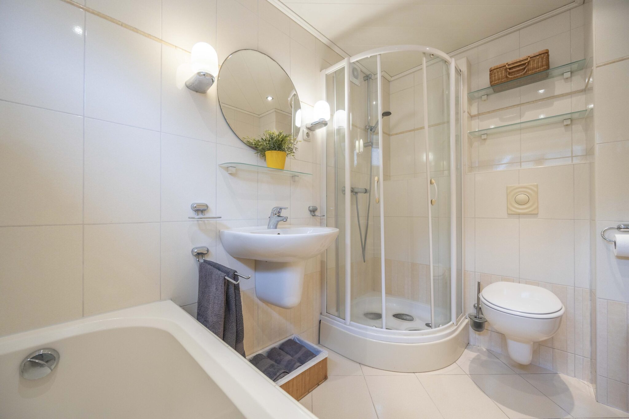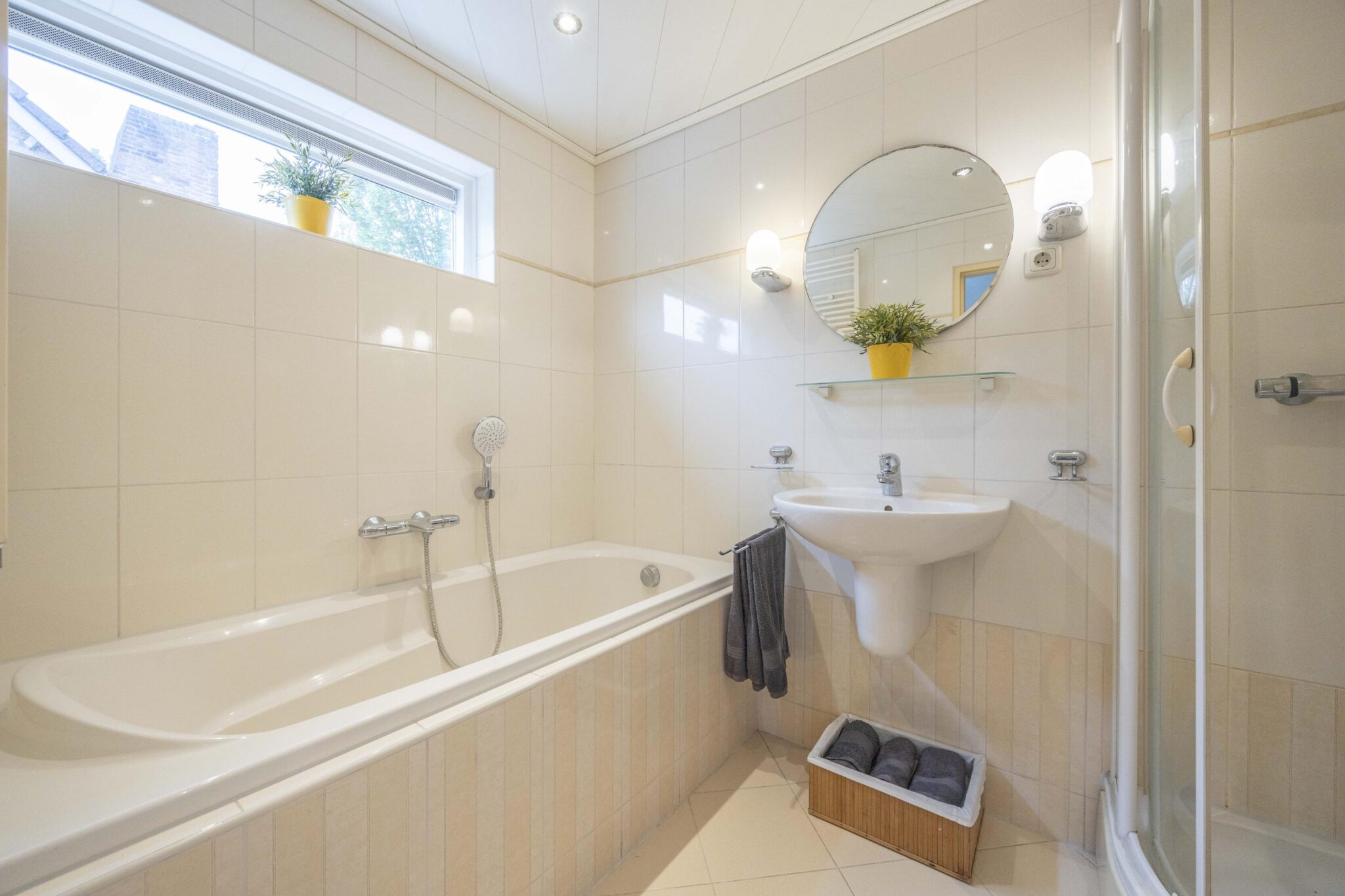 De volledig betegelde en keurig onderhouden badkamer is voorzien van een ligbad, wastafel en douche. Daarnaast is de badkamer voorzien van een raam en inbouwspots.