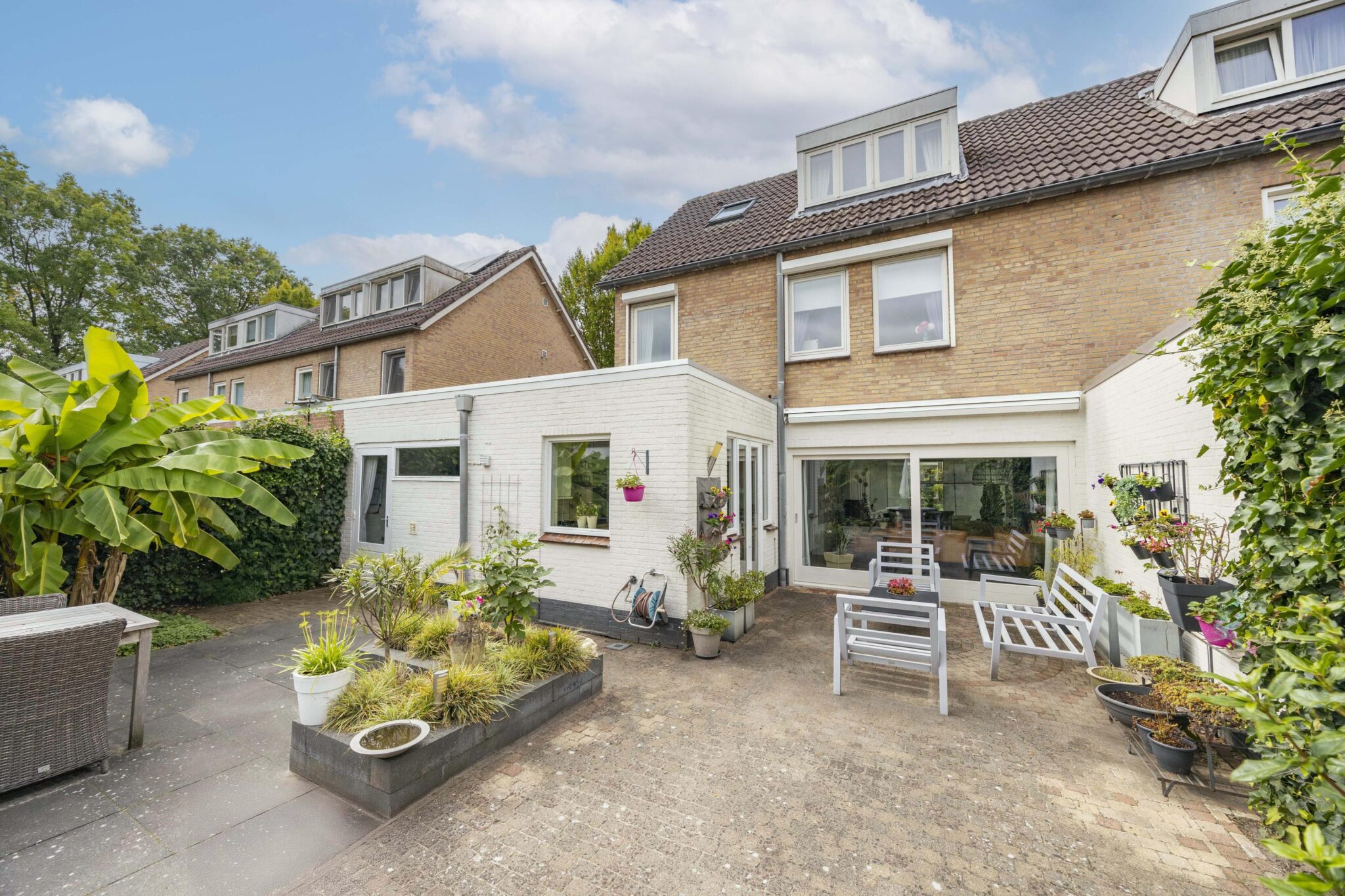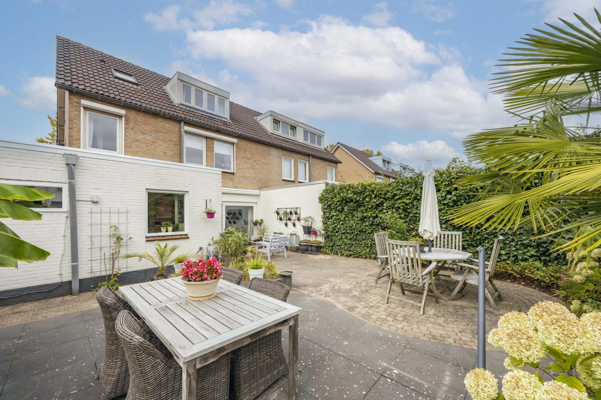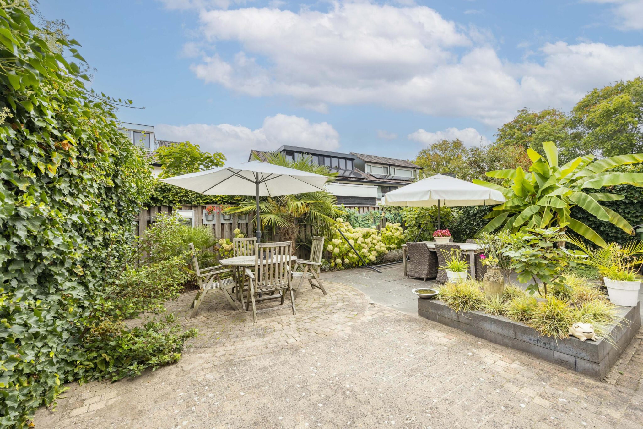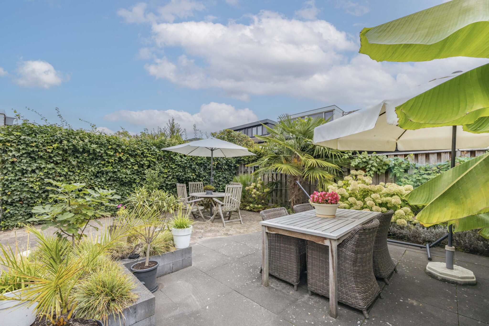 De achtertuin is rijkelijk ingericht met vaste beplanting en plantenborders, aangevuld met een eigen bananenboom en vijgenboom. Verschillende zitopstellingen maken het mogelijk om in goed gezelschap van de buitenruimte te genieten. Direct bij de schuifpui bevindt zich een terras met zonneluifel.