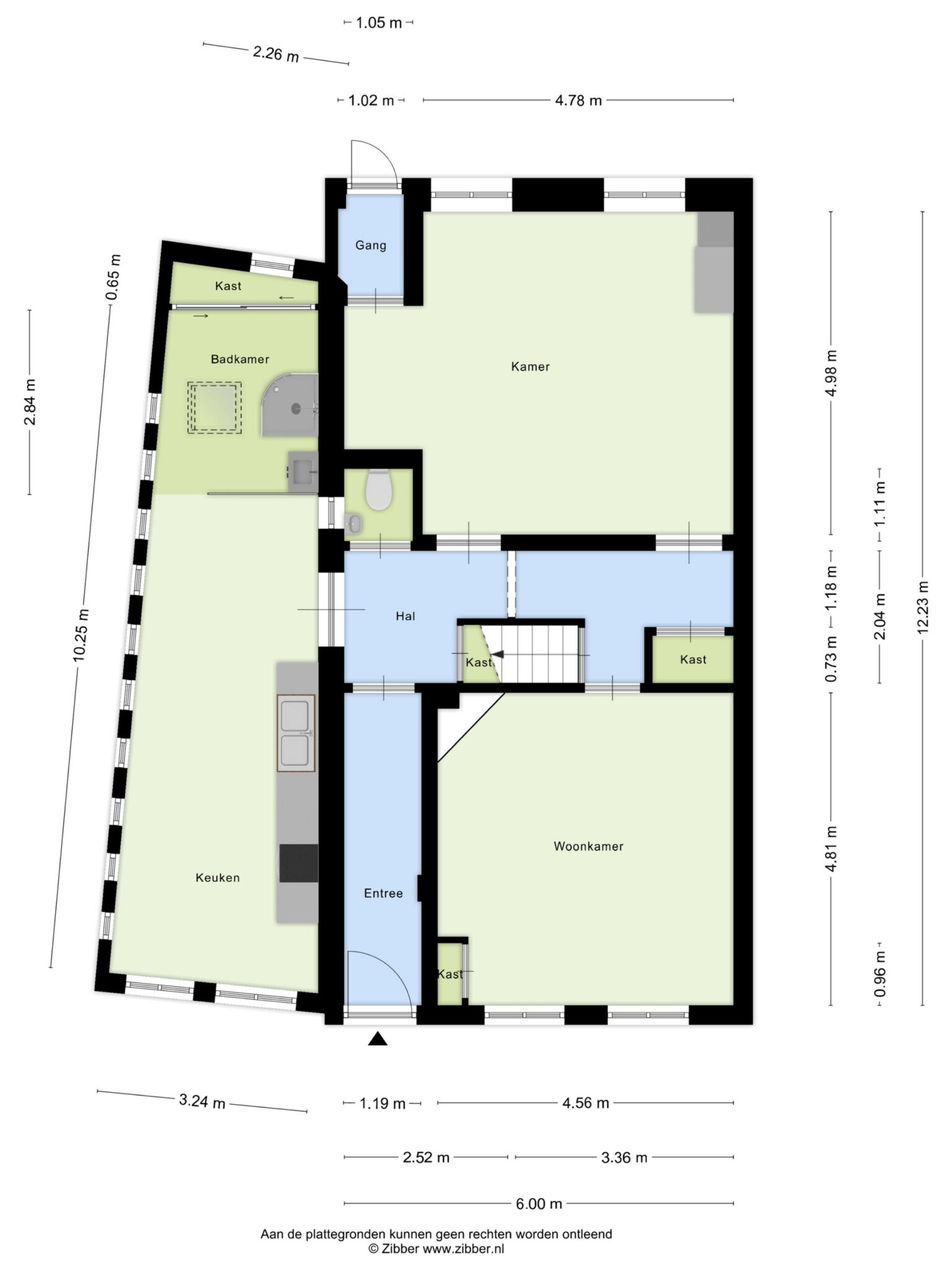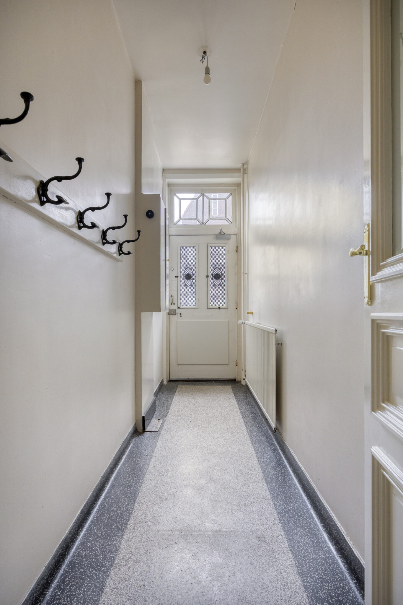 Entree naar gang met fraaie terrazovloer, garderobe en meterkast; aansluitend een hal met toegang tot de woonkeuken, toiletruimte, trapopgang naar de eerste verdieping en een ruime kamer aan de voorzijde en een kamer aan de achterzijde van de woning. In de hal bevindt zich ook een inbouwkast en een trapkast: ideale extra bergruimte.