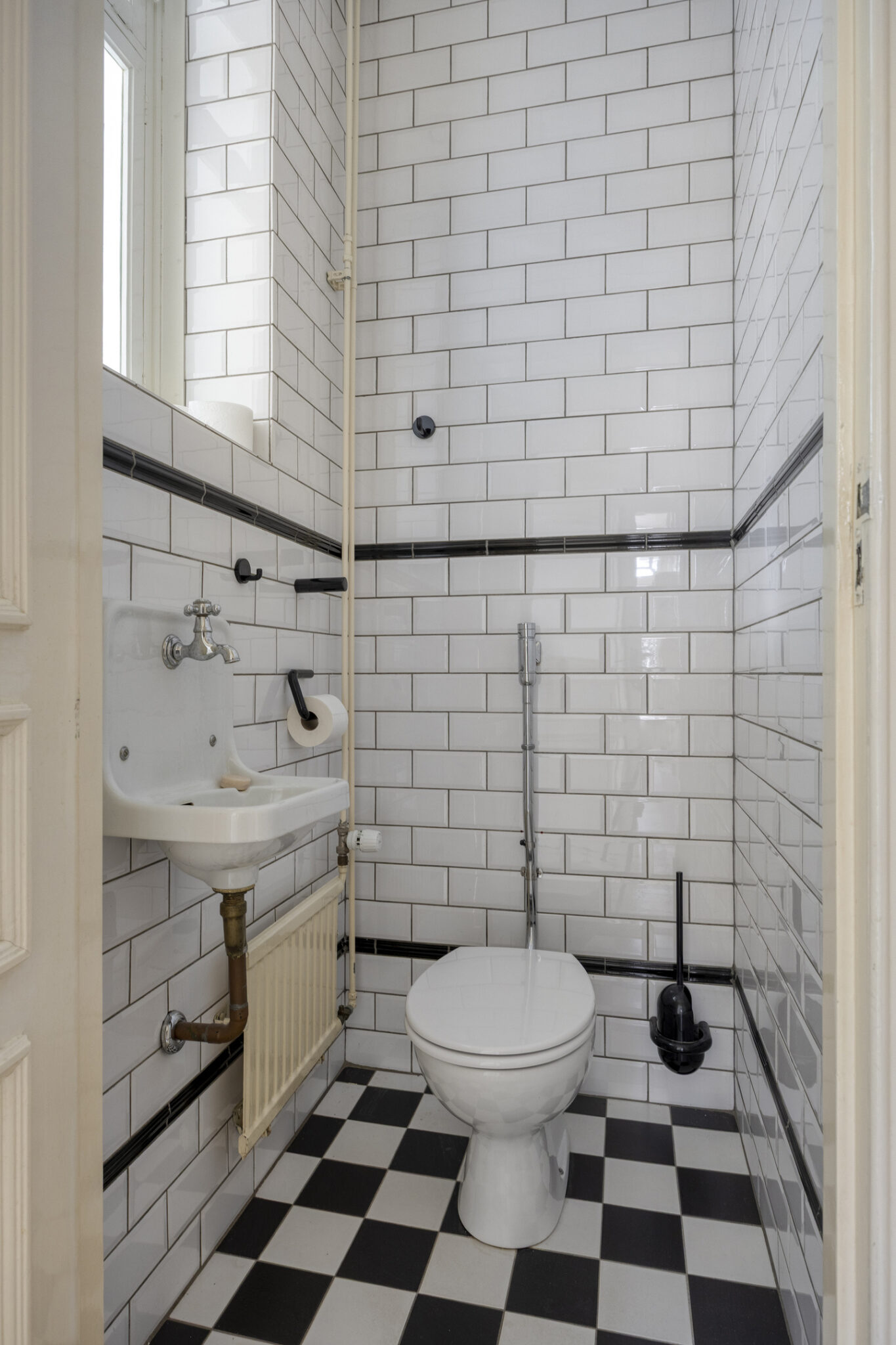 De toiletruimte is geheel betegeld en beschikt over een staand closet en fontein.