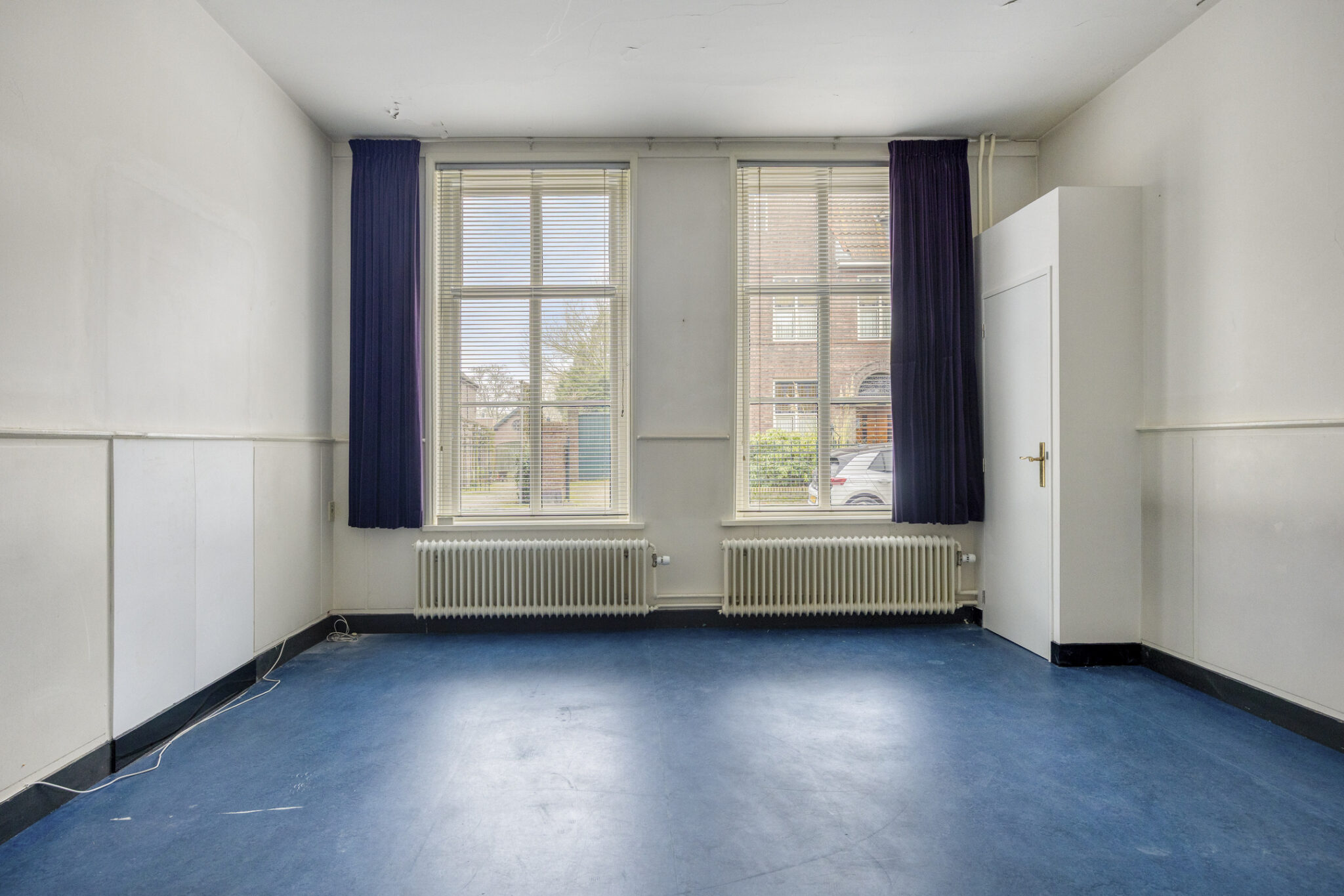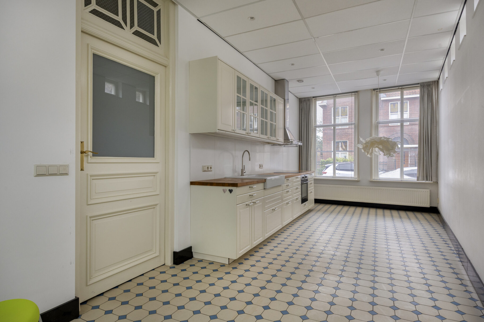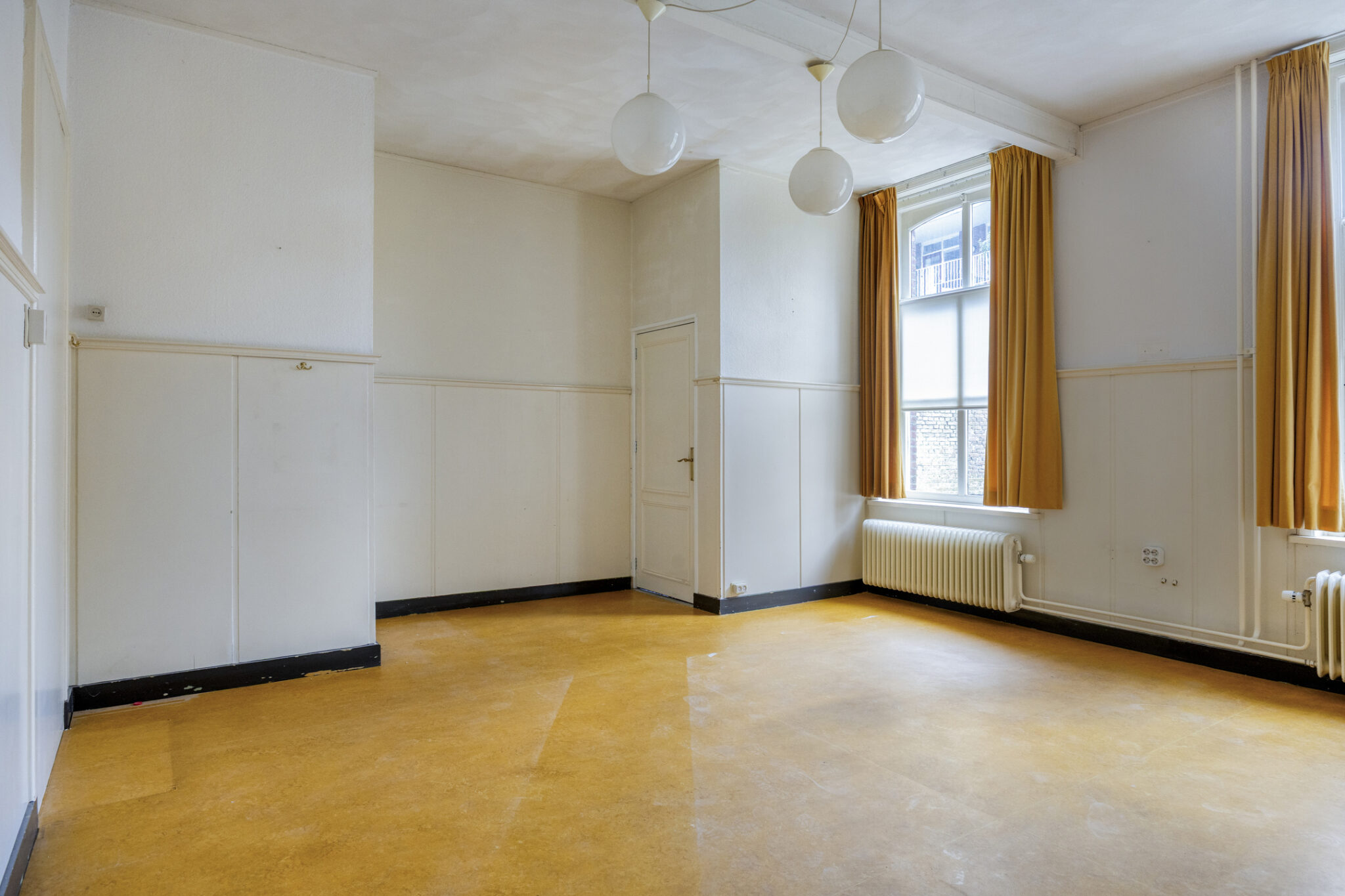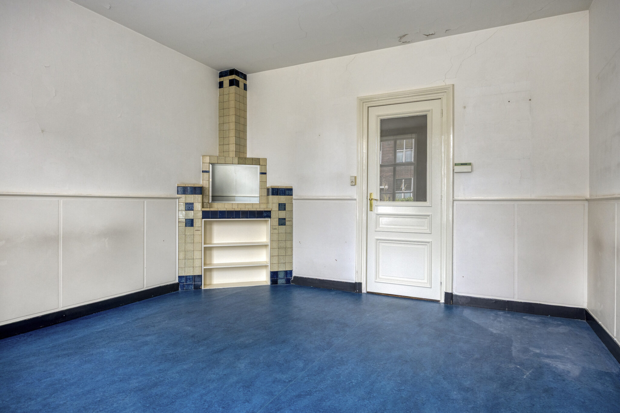 Aan de voorzijde van de woning bevindt zich een ruime kamer met grote ramen voor een prettige lichtinval; de fraaie ornamenten en de haardpartij geven het geheel een karaktervolle uitstraling.