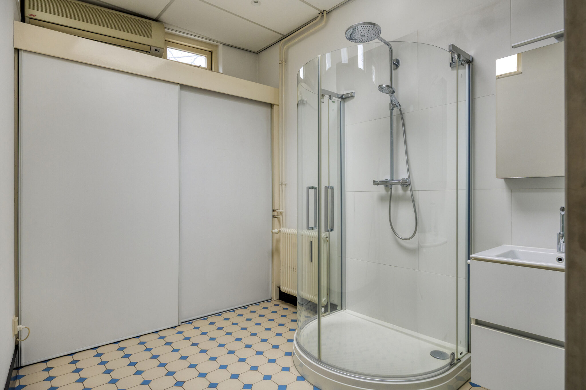 In deze ruimte bevindt zich -gescheiden door een matglazen paneel- een douchecabine met regen- en handdouche en een wastafel met wandmeubel. In een wandkast bevinden zich aansluitingen voor was- en droogapparatuur. Een dakkoepel biedt extra daglichtinval en er is tevens airconditioning aanwezig.