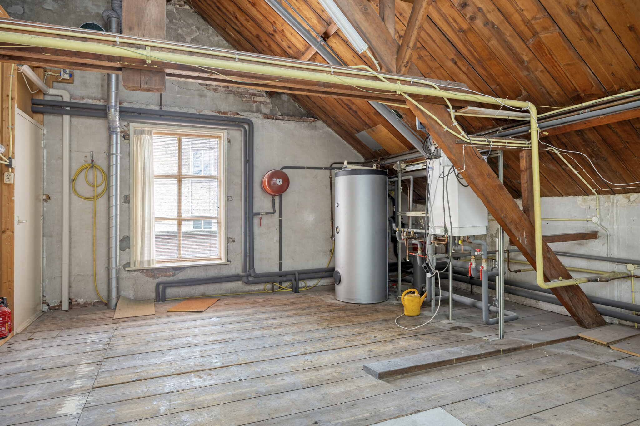 Deze kamer geeft ook toegang tot de open zolderruimte met boiler en c.v.-installatie. De boiler is aangesloten op de zonnepanelen op het platte dak, deze bieden genoeg energie voor de gehele watervoorziening van de woning.