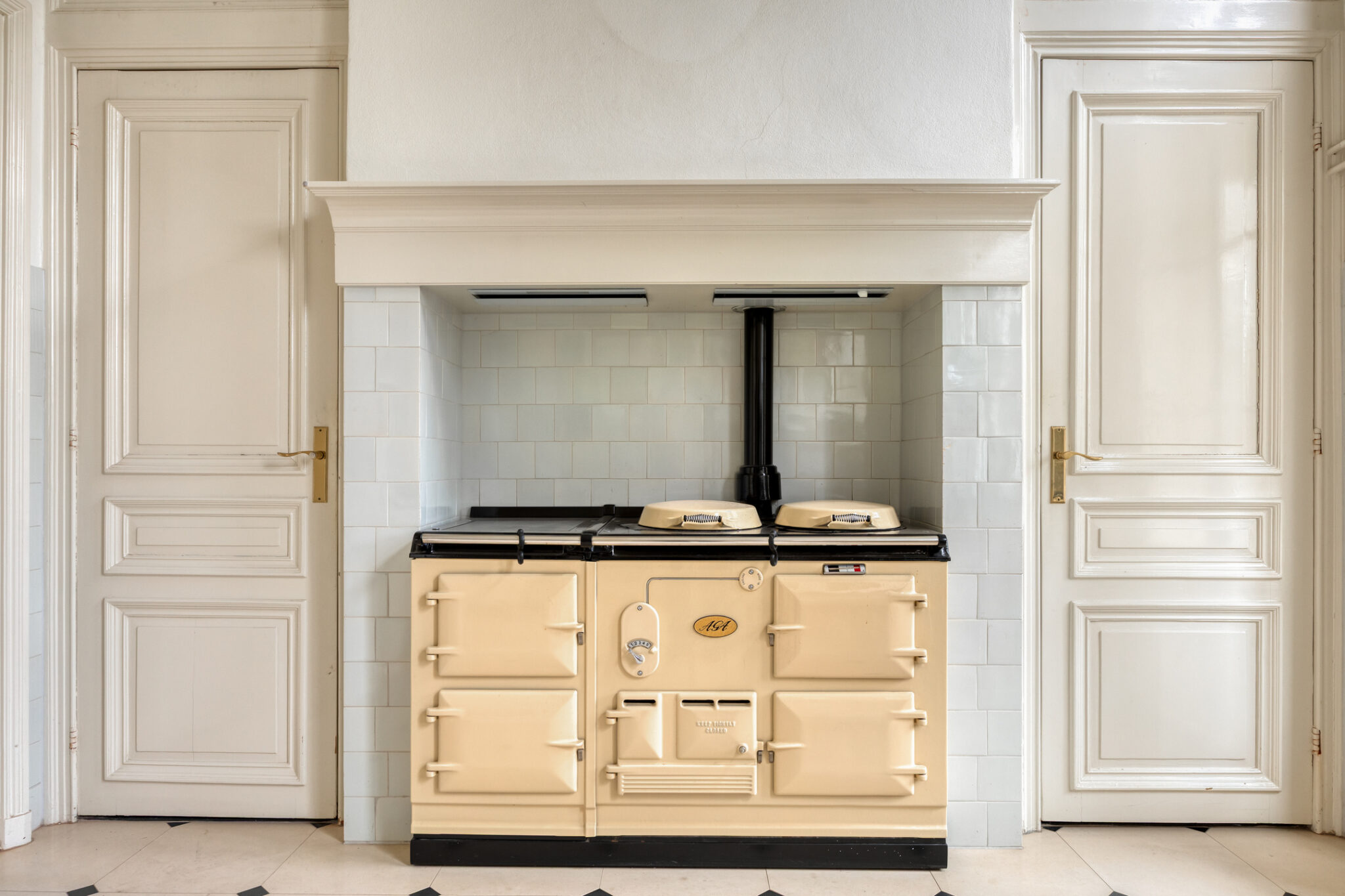 De woonkeuken heeft een natuurstenen tegelvloer met zwart-wit patroon. De keukeninrichting (2007) in hoekopstelling en separate wandopstelling heeft onder- en bovenkasten met voldoende proviand- en bergruimte en beschikt over eersteklas apparatuur: een vaatwasmachine, koelkast en vrieslades. De eyecatcher is het robuuste AGA-fornuis met maar liefst vier ovens en een afzuigunit in schouw met sierlijsten.