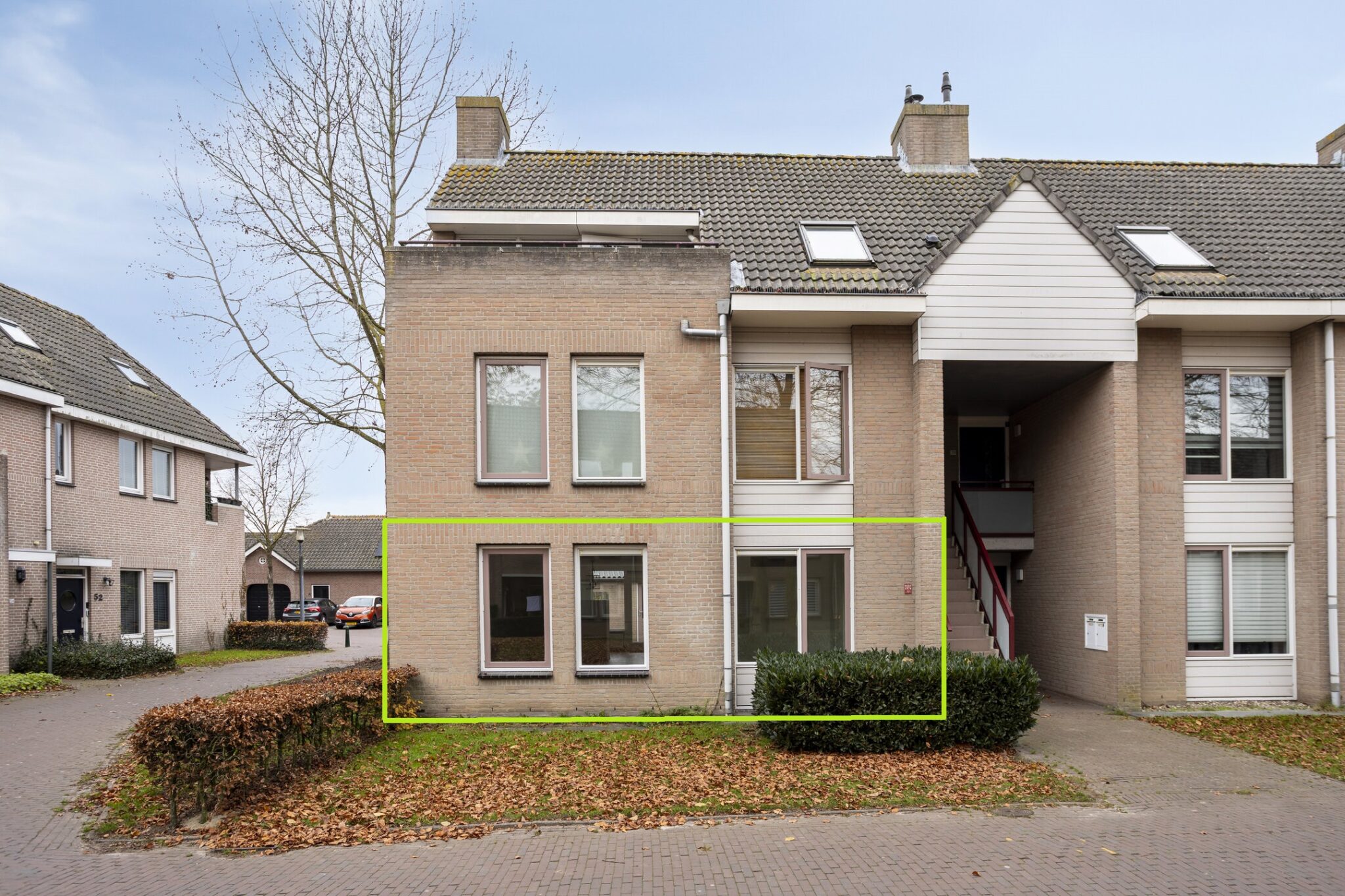 Via de overdekte entree is deze benedenwoning te betreden. Vanuit de hal zijn diverse ruimtes bereikbaar waaronder de woonkamer met open keuken en de twee slaapkamers.