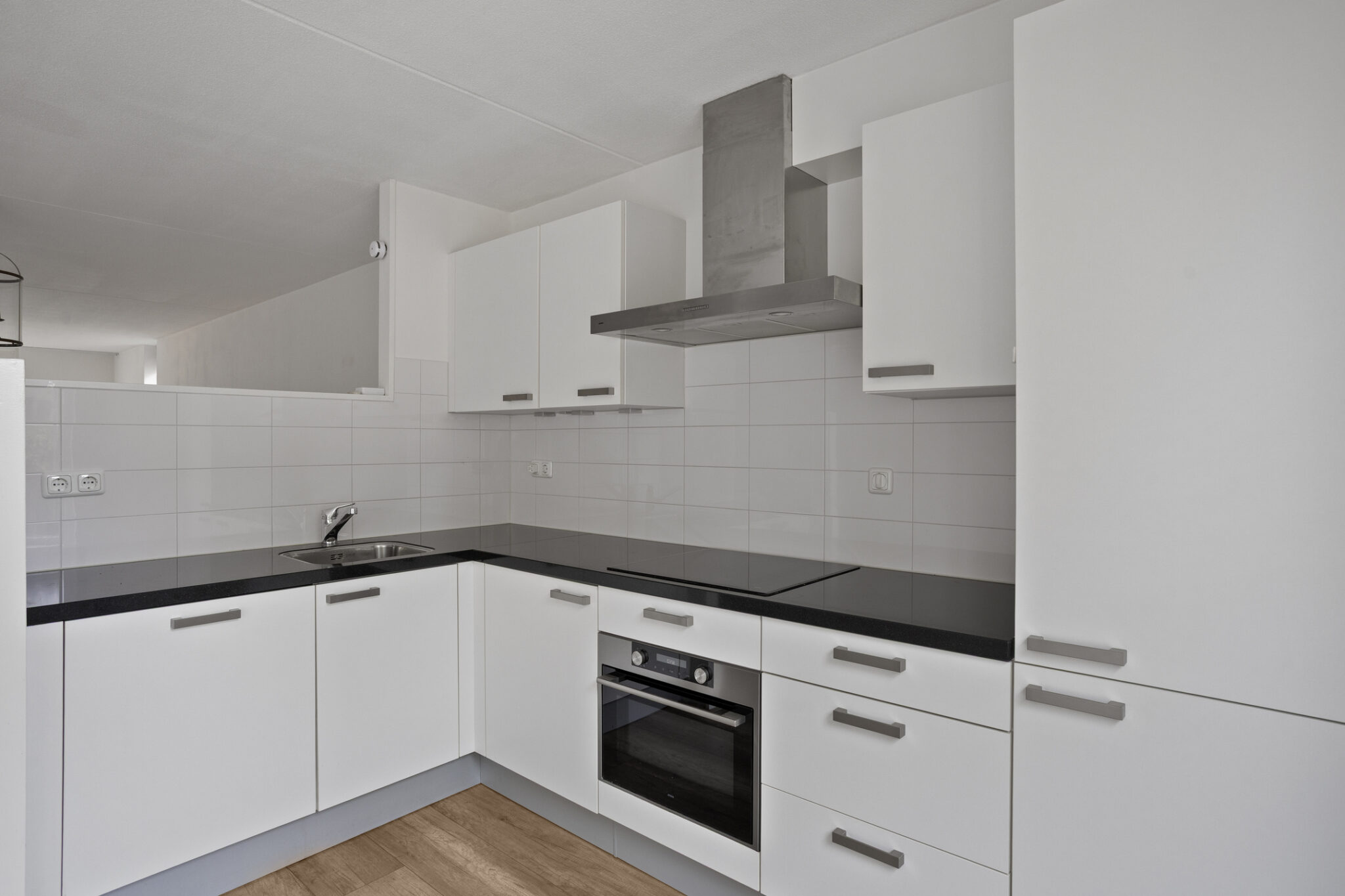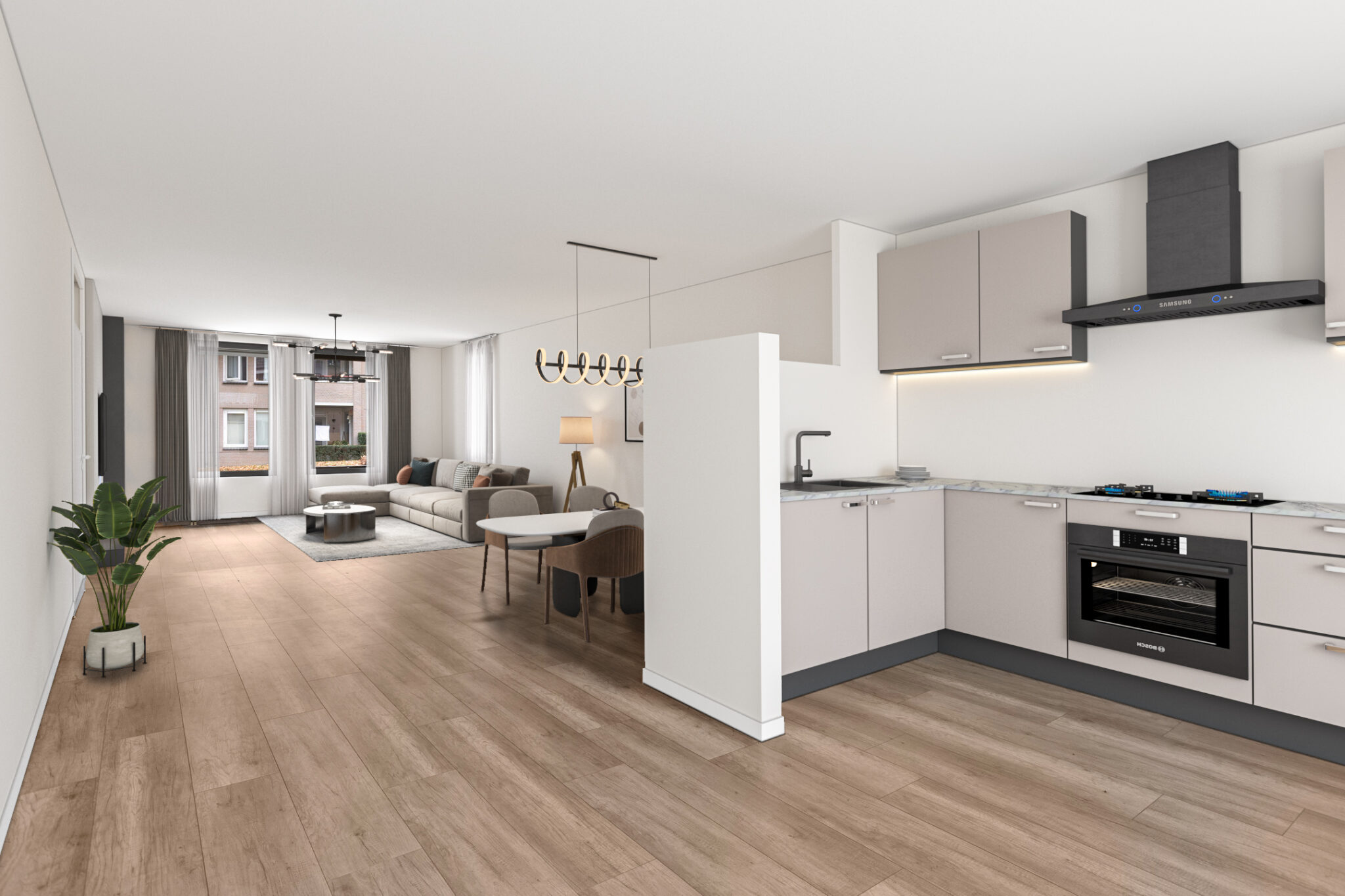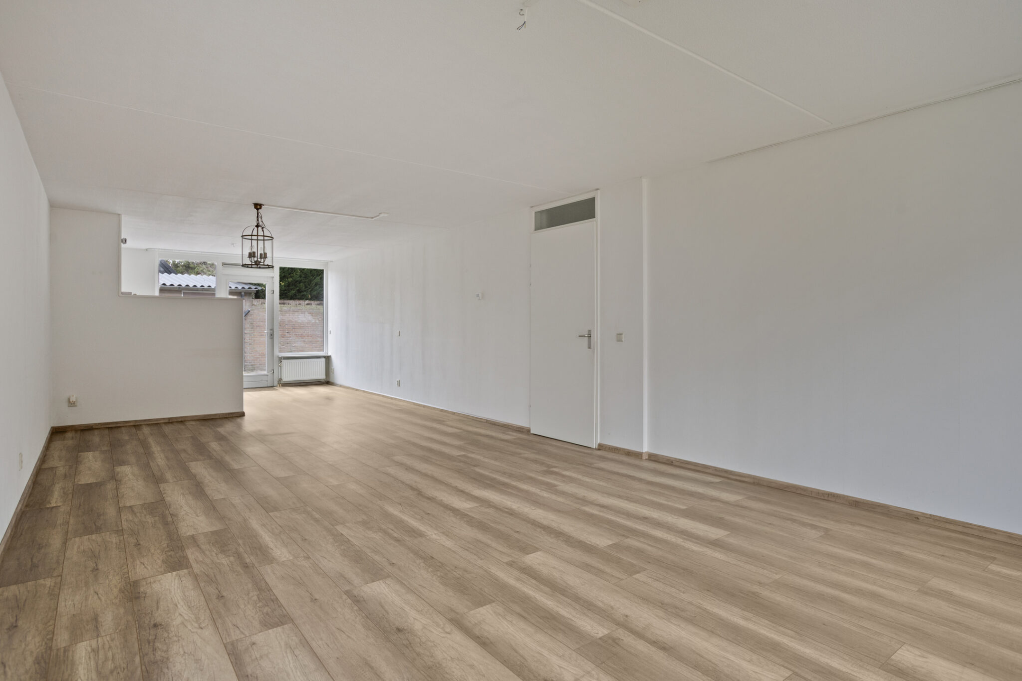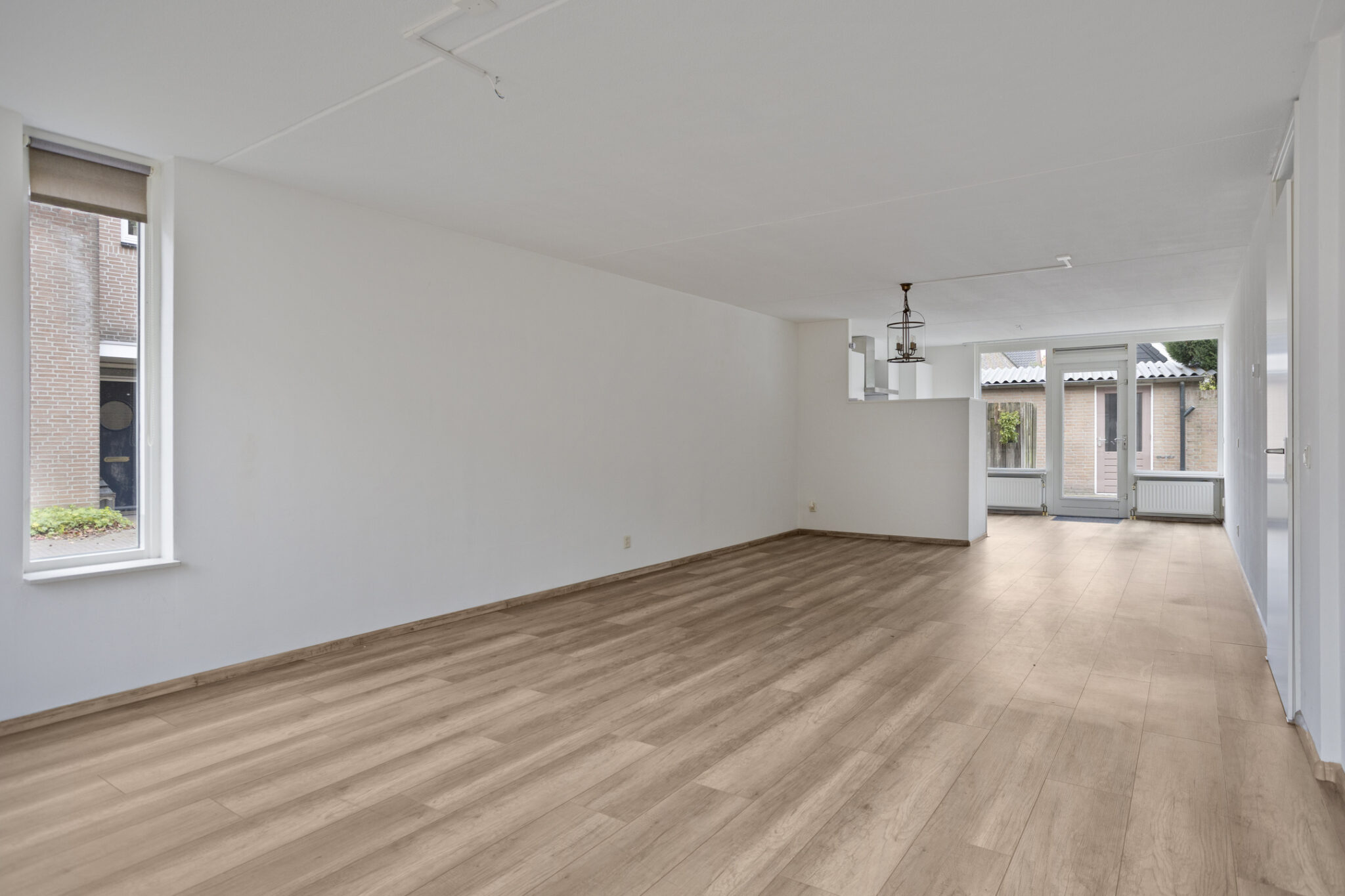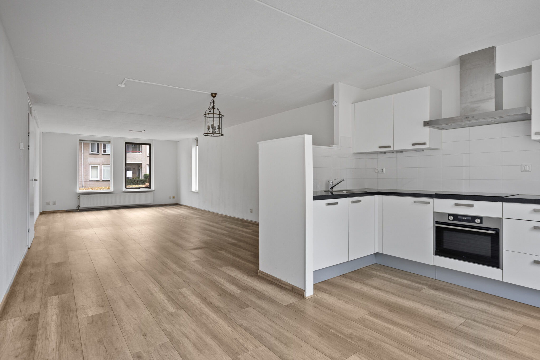 De woonkamer is een ruime kamer met veel lichtinval. Aan de voorzijde bevindt zich de zithoek, aan de achterzijde de open keuken. De open keuken is compleet uitgerust met een koel-/vriescombinatie, inductie kookplaat, afzuigkap, combi-oven en vaatwasser. Daarnaast biedt de hoekopstelling verschillende boven- en onderkasten. De gehele woonkamer is voorzien van een nette en sfeervolle laminaatvloer.