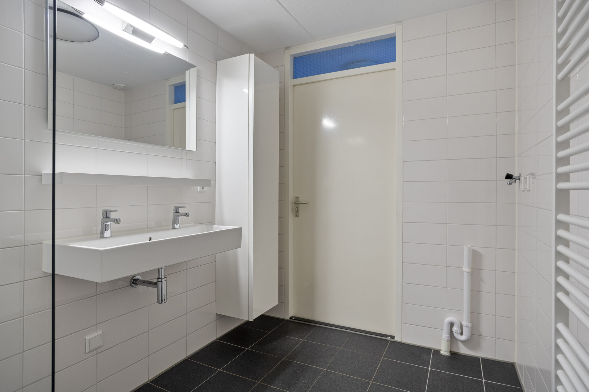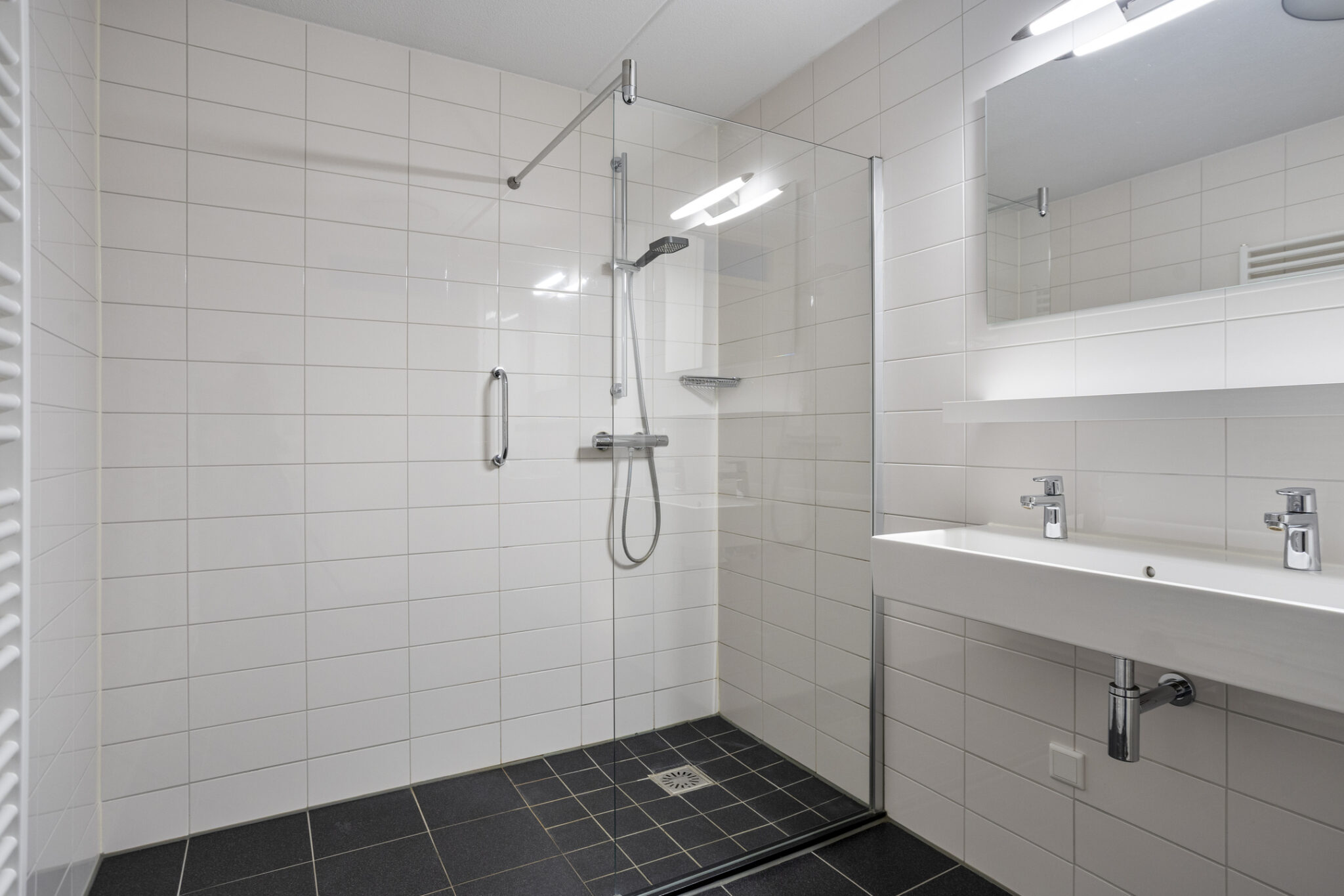 De badkamer is uitgerust met een ruime douchehoek met thermostaatkraan en een dubbele wastafel met spiegel inclusief verlichting en een kolomkast. Tevens is hier de aansluiting voor de wasmachine te vinden.
