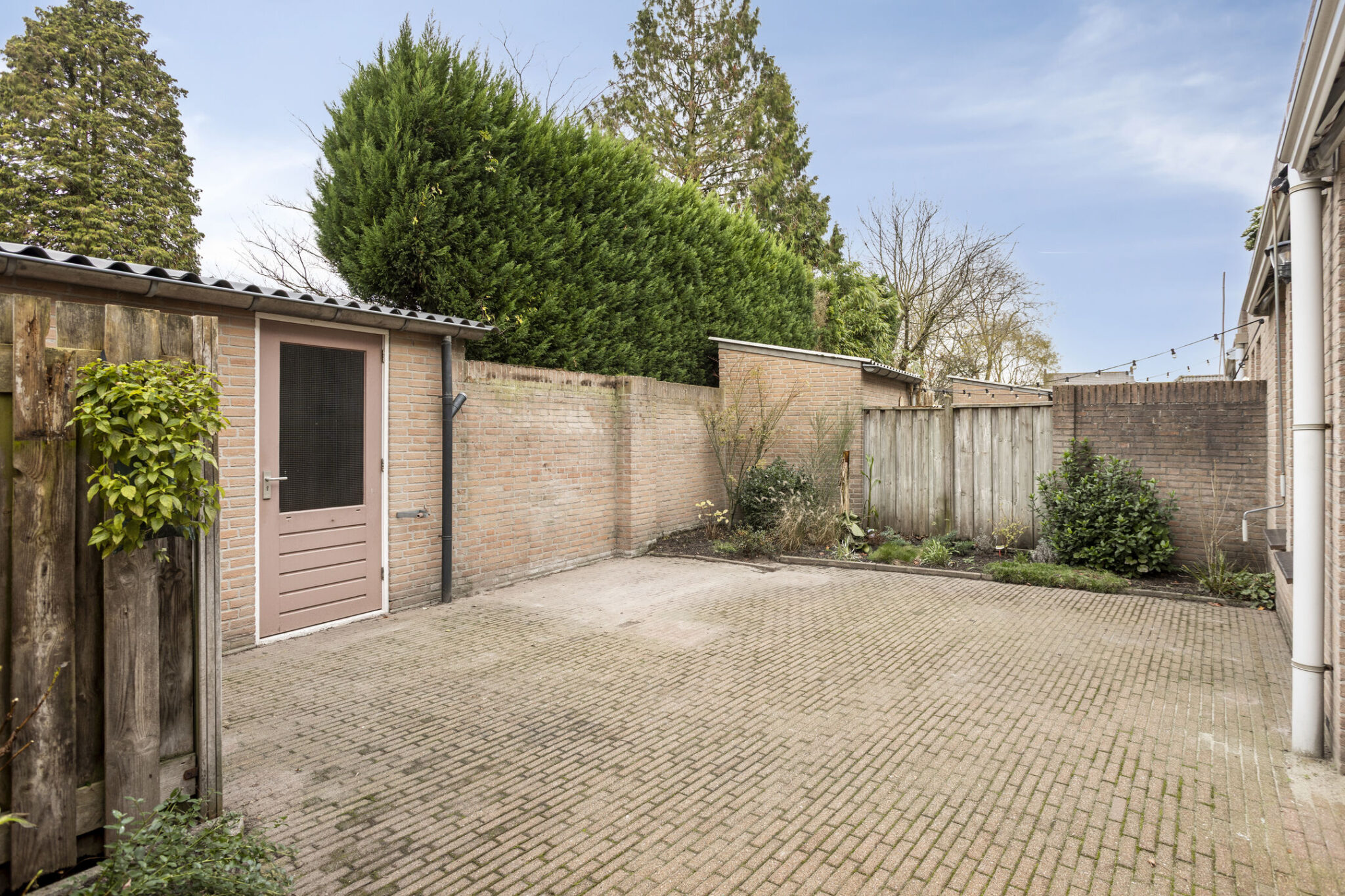 Vanuit de keuken is, via een loopdeur, de achtertuin te bereiken. Deze achtertuin is gelegen op het westen en is grotendeels voorzien van bestrating met enkele plantenborders. Een vrijstaand stenen berging, welke direct vanuit de tuin te betreden is, zorgt voor de nodige opbergruimte. De poort naar achterom en een buitenkraantje maken deze tuin compleet.