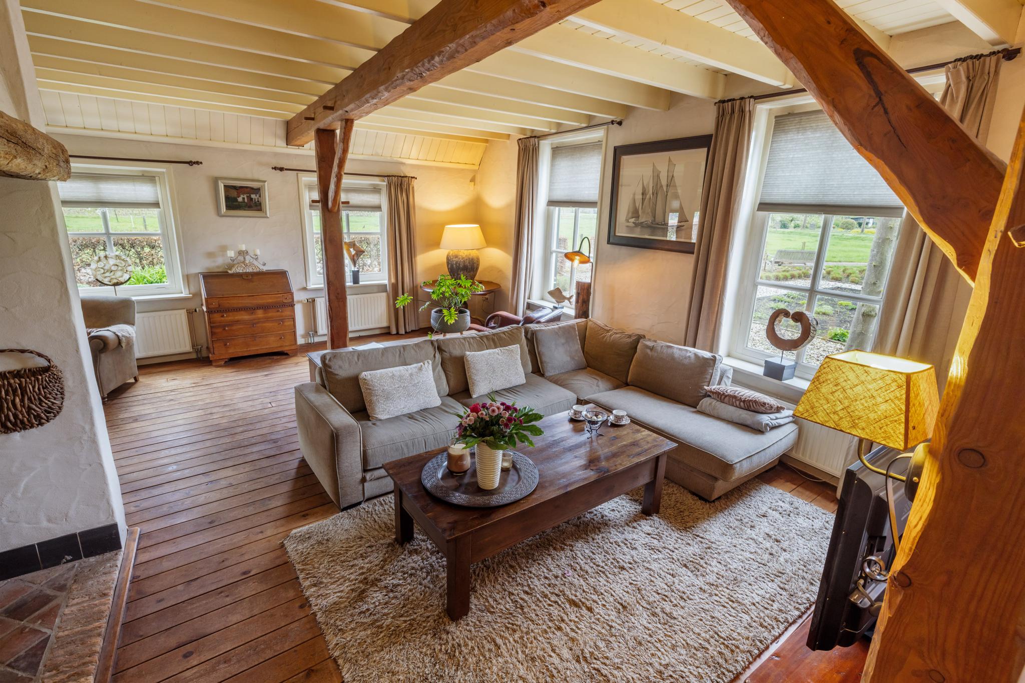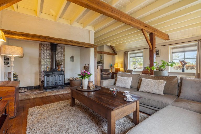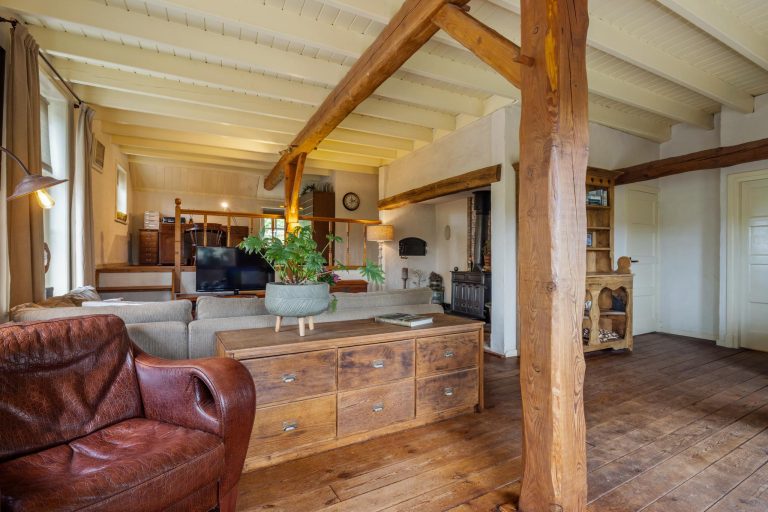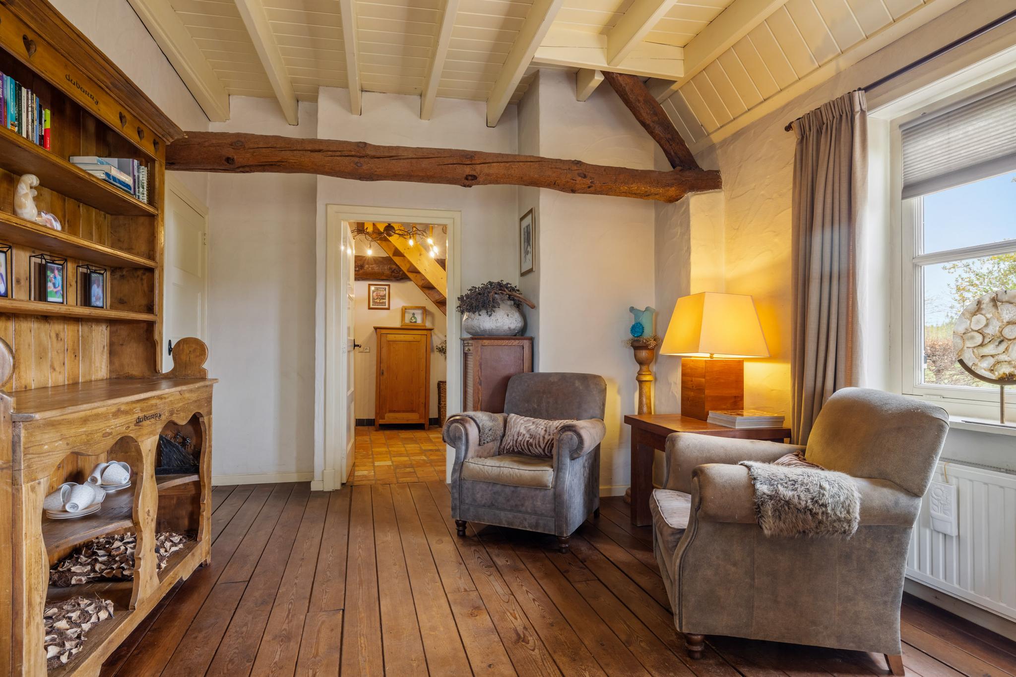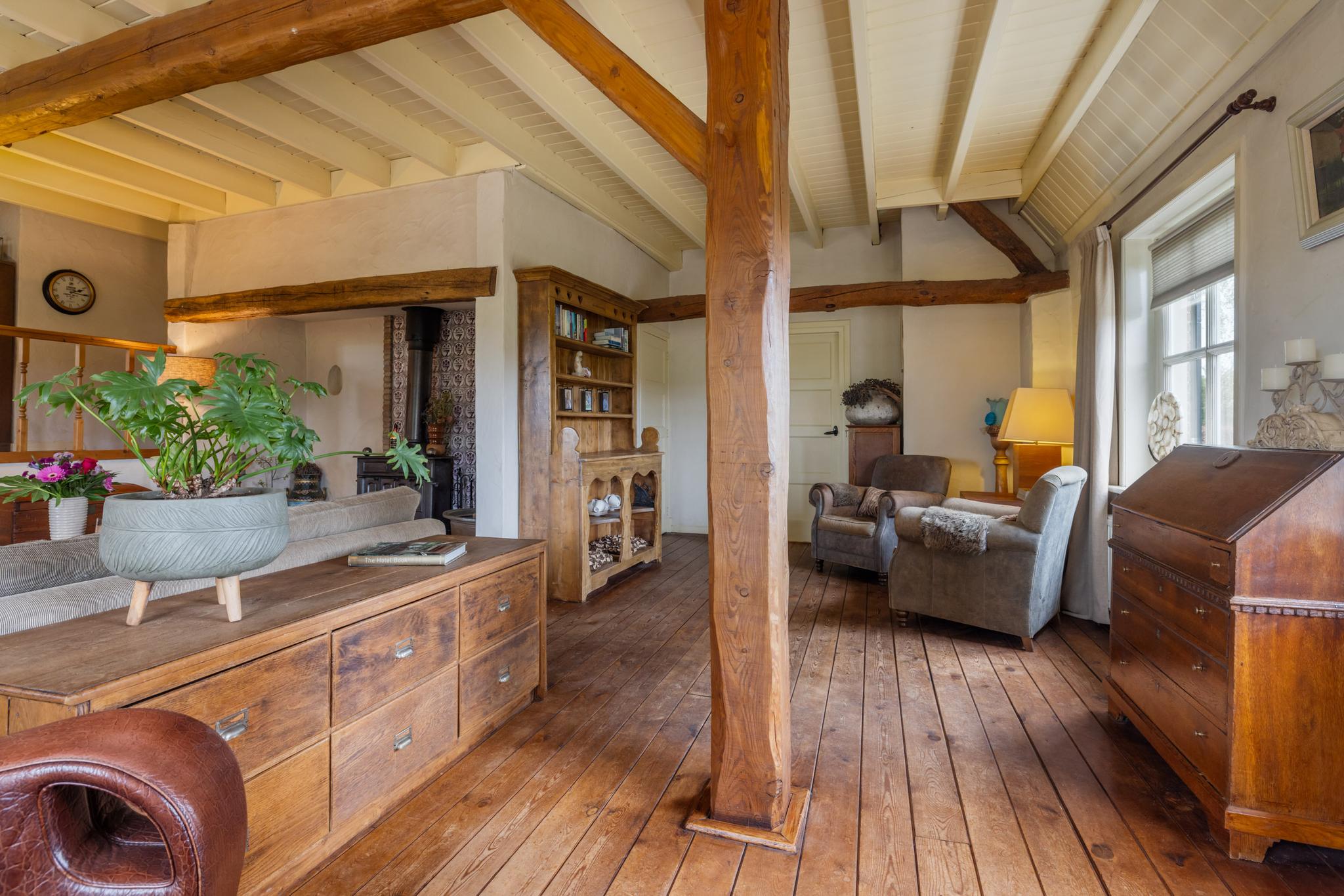 Vanuit de hal zijn verschillende vertrekken te bereiken. Wanneer je het leefgedeelte binnenstapt valt direct de royale ruimte, fijne indeling en de keurige afwerking op. De woonkamer met opkamer is sfeervol en de originele schouw en houten vloer voegen extra charme toe. Tevens heb je rondom een rustgevend uitzicht waardoor je in elk seizoen een prachtig uitzicht hebt. Wat een warm welkom.