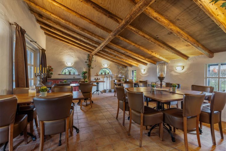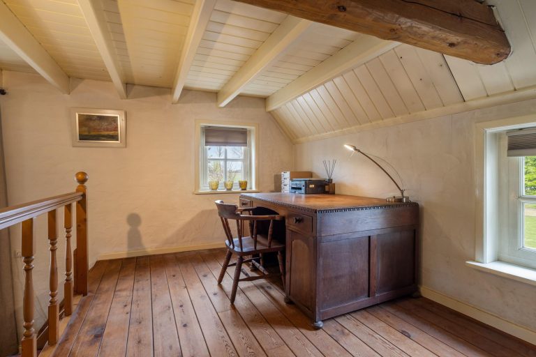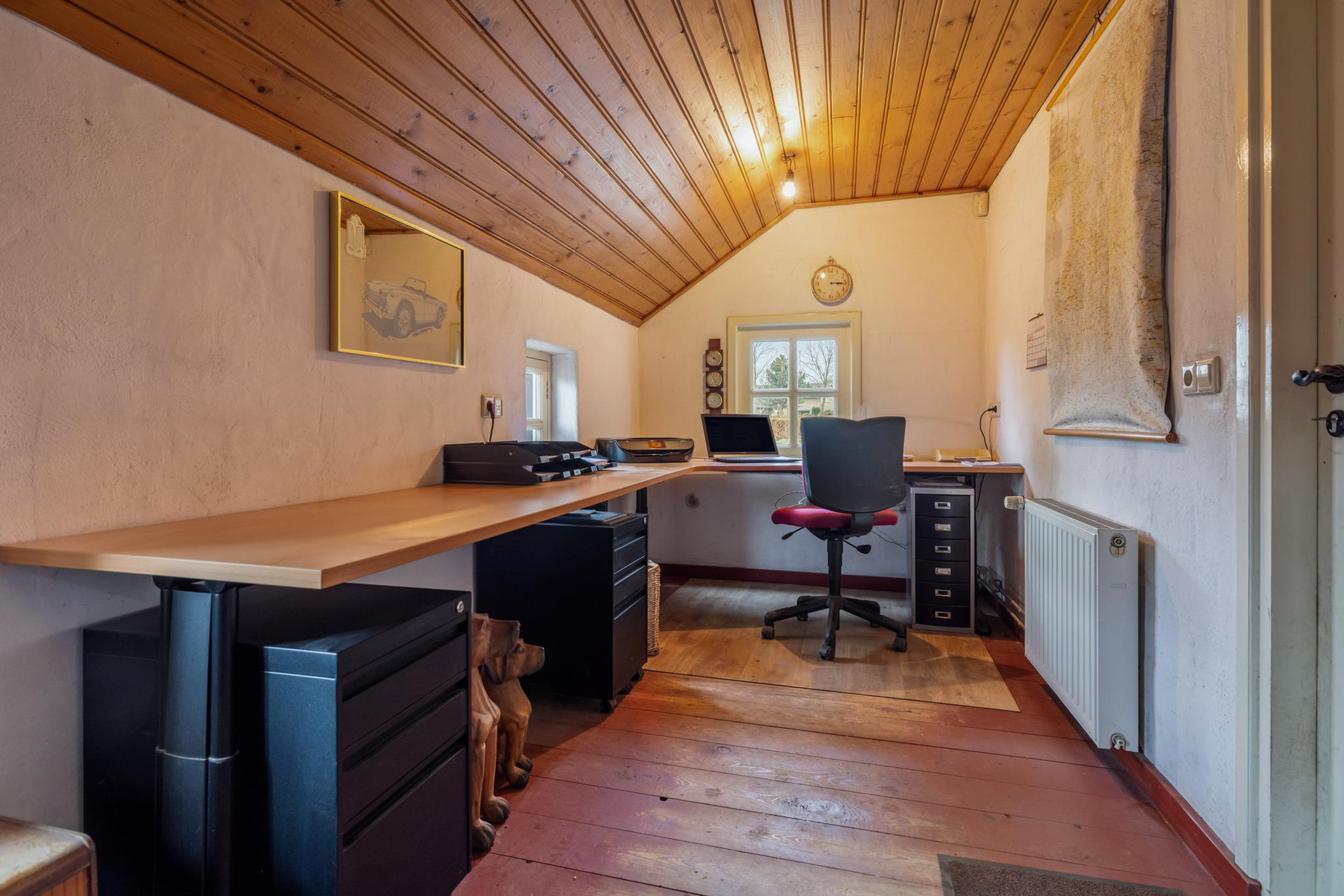 Garage – grenzend aan de woonboerderij – is eveneens multifunctioneel en inpandig te bereiken direct vanuit de woning. Aan de voorzijde van de woning, bevindt zich een aparte kantoorruimte met toegang vanuit de garage. Ook hier zijn mooie halfronde raampjes met prachtig uitzicht.