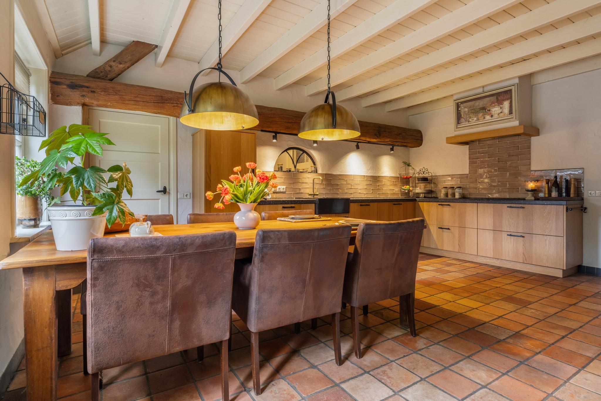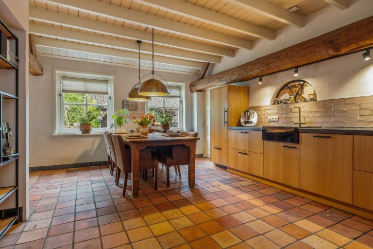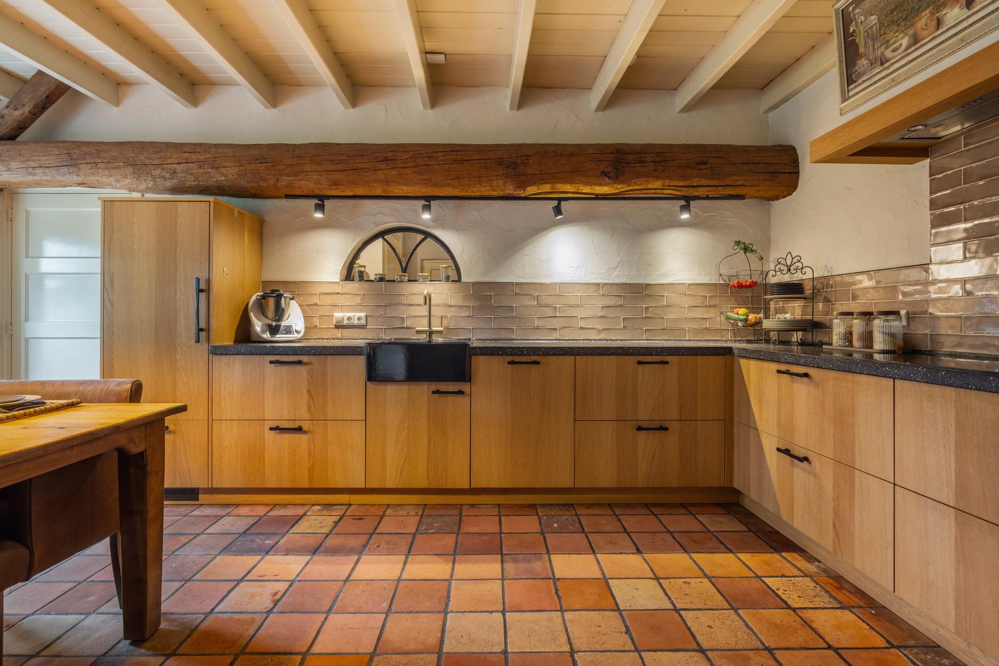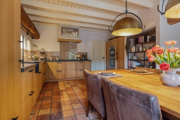 De keuken is het hart van de woning. Hier wordt geleefd, gekookt en gegeten. Dit is een plek voor ieder moment van de dag. De woonkeuken is een perfecte plek om familie en vrienden te ontvangen. Geniet hier van de fijne momenten onder het genot van een uitgebreid diner of een gezellige borrel. De eikenhouten keuken is geplaatst in een L-vorm en is voorzien van een inductiekookplaat, koelkast, Quooker en vaatwasser. Aan de andere zijde zijn maatwerkkasten gerealiseerd met ruimte voor de oven en een combi-oven/magnetron. Leuk detail is de houten balk met opbouwspots en het stalen boerderijraampje. De prachtige plavuizen vloer maakt de keuken compleet. Via de keuken is eveneens de opkamer te bereiken, en toegang tot de kelder.