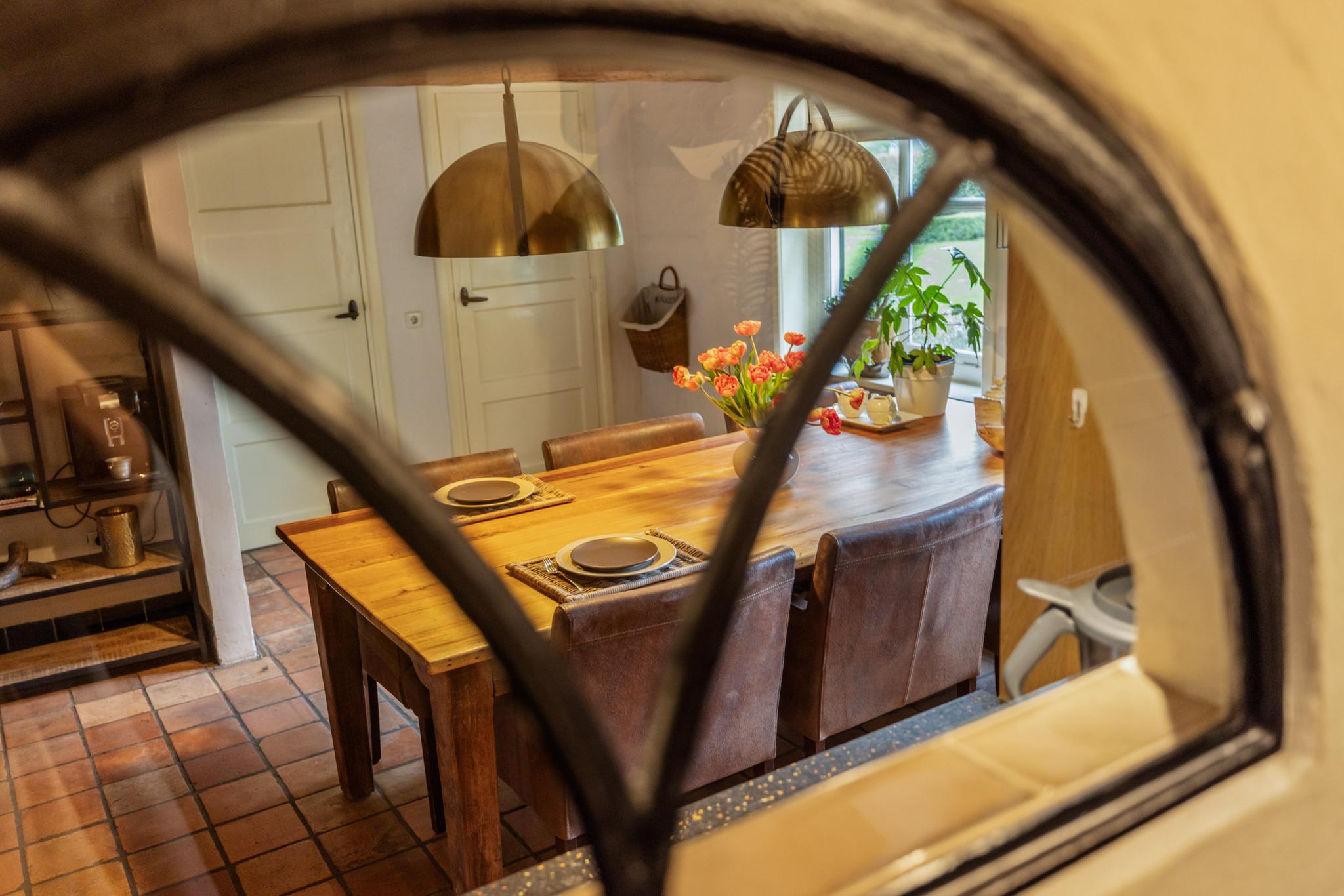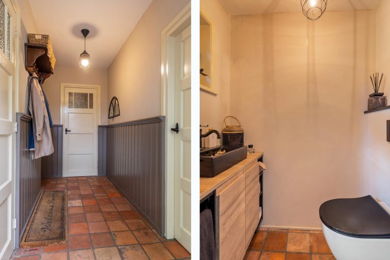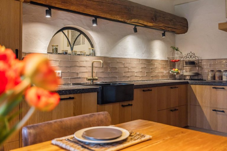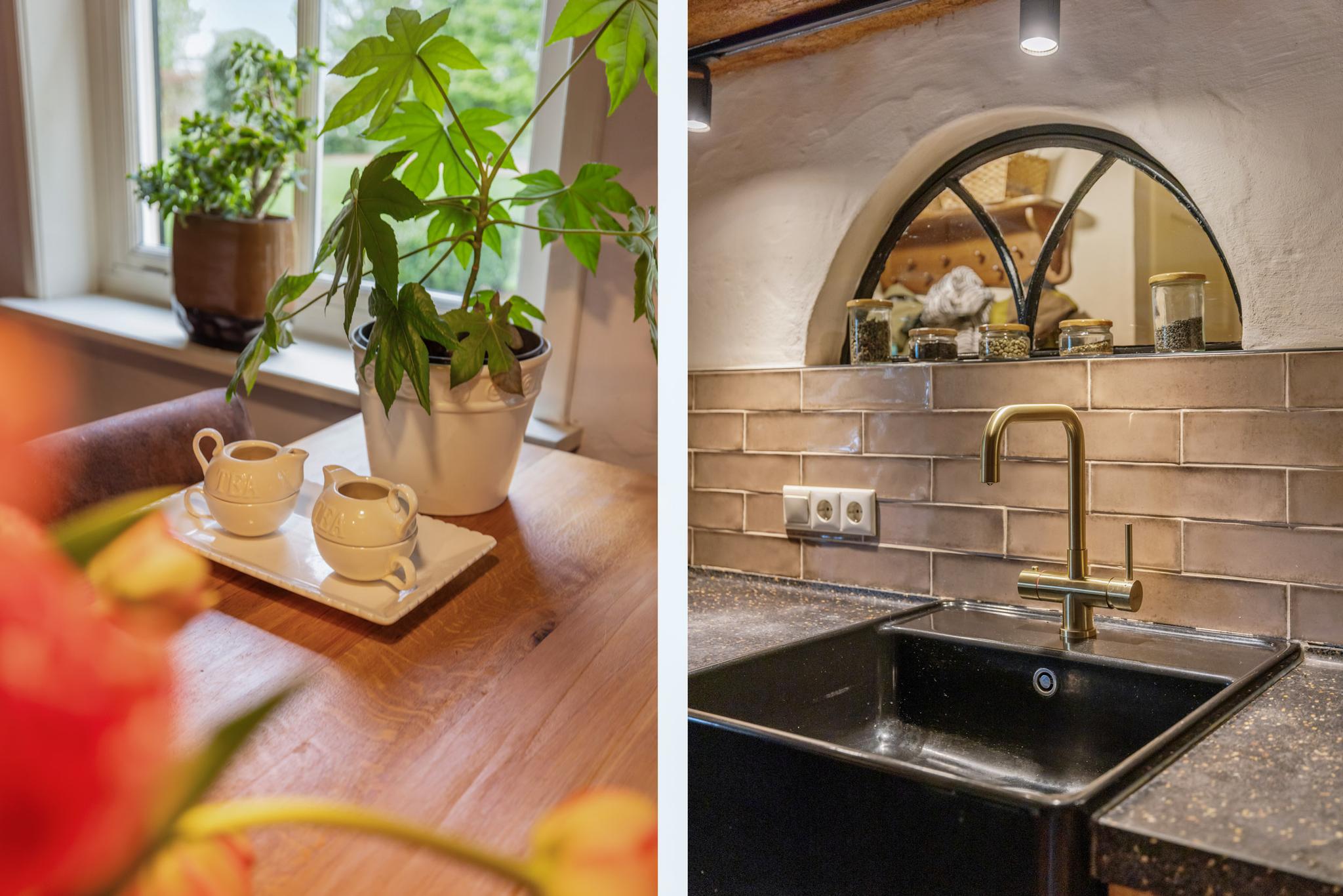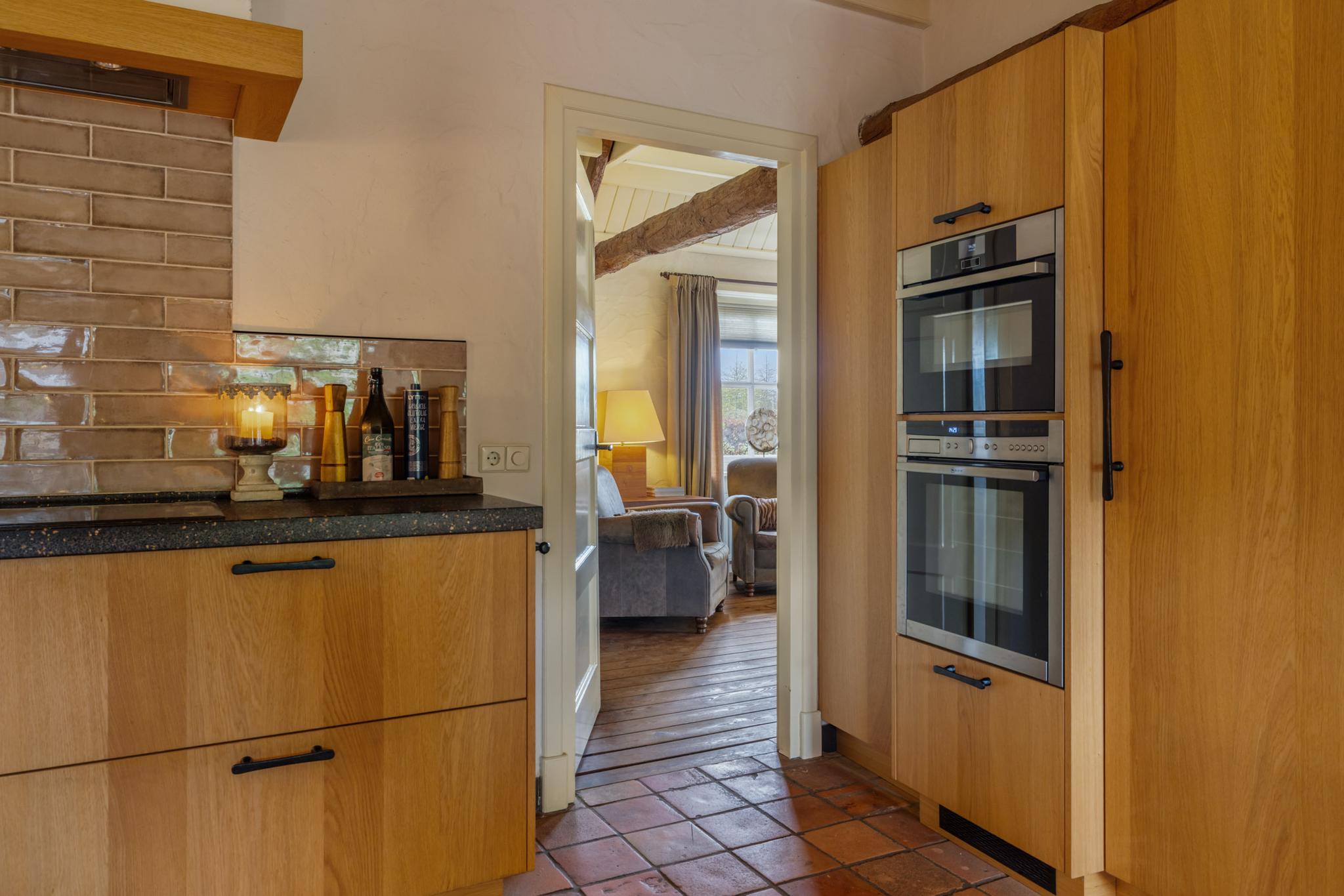 De keuken is het hart van de woning. Hier wordt geleefd, gekookt en gegeten. Dit is een plek voor ieder moment van de dag. De woonkeuken is een perfecte plek om familie en vrienden te ontvangen. Geniet hier van de fijne momenten onder het genot van een uitgebreid diner of een gezellige borrel. De eikenhouten keuken is geplaatst in een L-vorm en is voorzien van een inductiekookplaat, koelkast, Quooker en vaatwasser. Aan de andere zijde zijn maatwerkkasten gerealiseerd met ruimte voor de oven en een combi-oven/magnetron. Leuk detail is de houten balk met opbouwspots en het stalen boerderijraampje. De prachtige plavuizen vloer maakt de keuken compleet. Via de keuken is eveneens de opkamer te bereiken, en toegang tot de kelder.