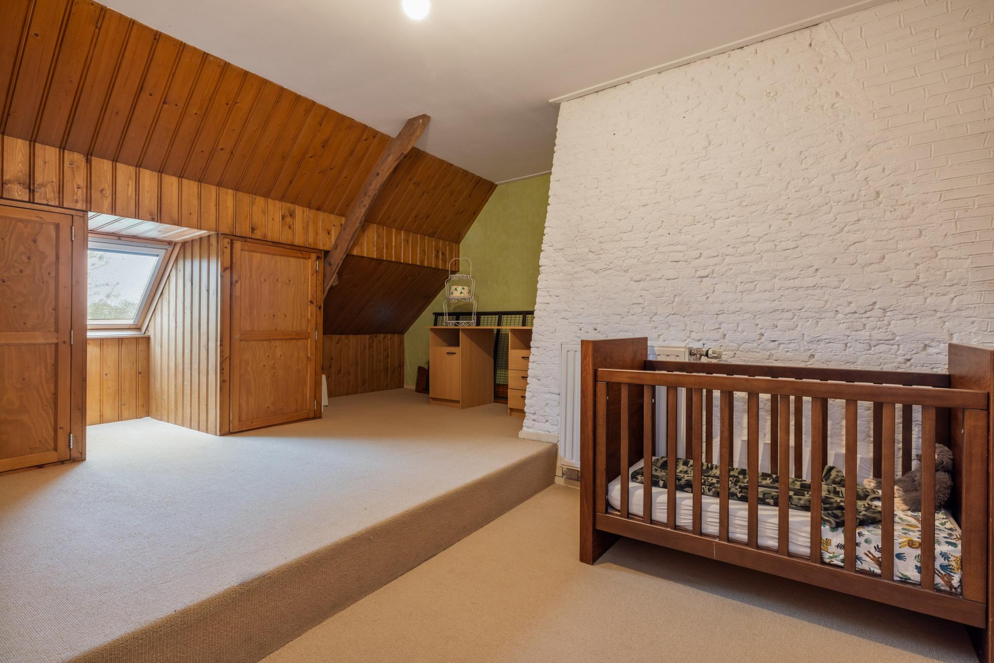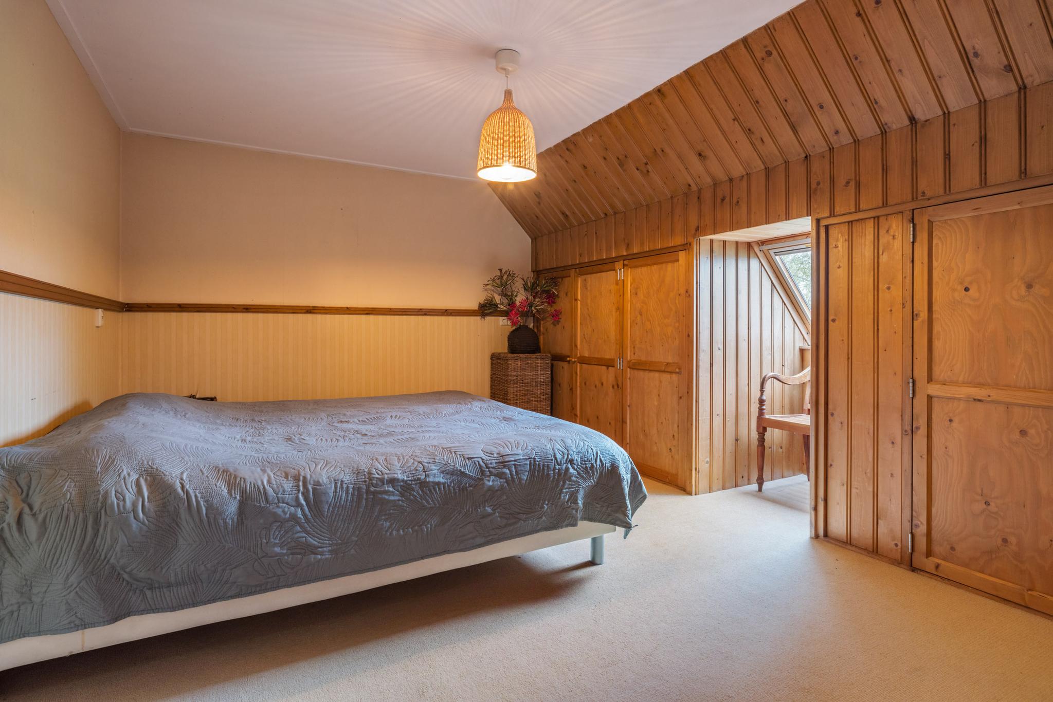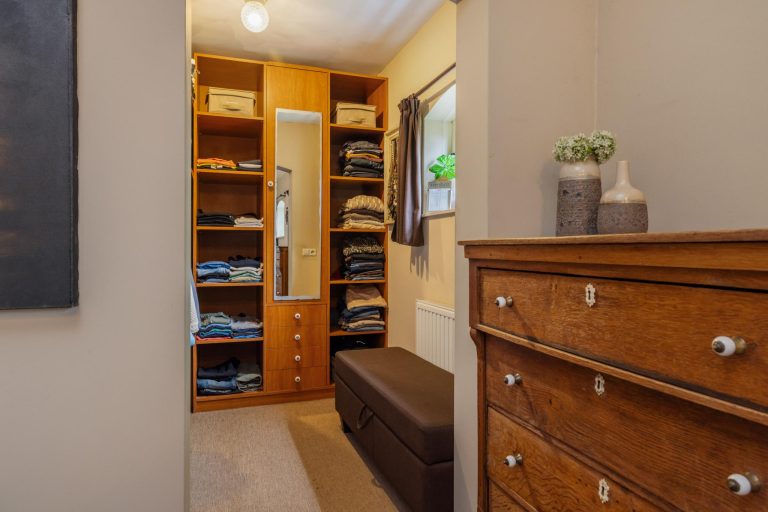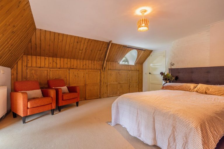 De indeling is praktisch en knus, met twee slaapkamers aan de voorzijde en een derde slaapkamer aan de achterzijde. Alle kamers hebben opvallende ronde raampjes, die zorgen voor een unieke uitstraling. Wat deze verdieping extra bijzonder maakt, zijn de op maat gemaakte inbouwkasten die over de gehele verdieping zorgen voor veel opbergruimte en een stijlvolle afwerking.