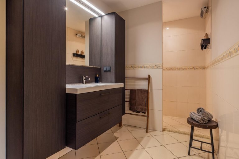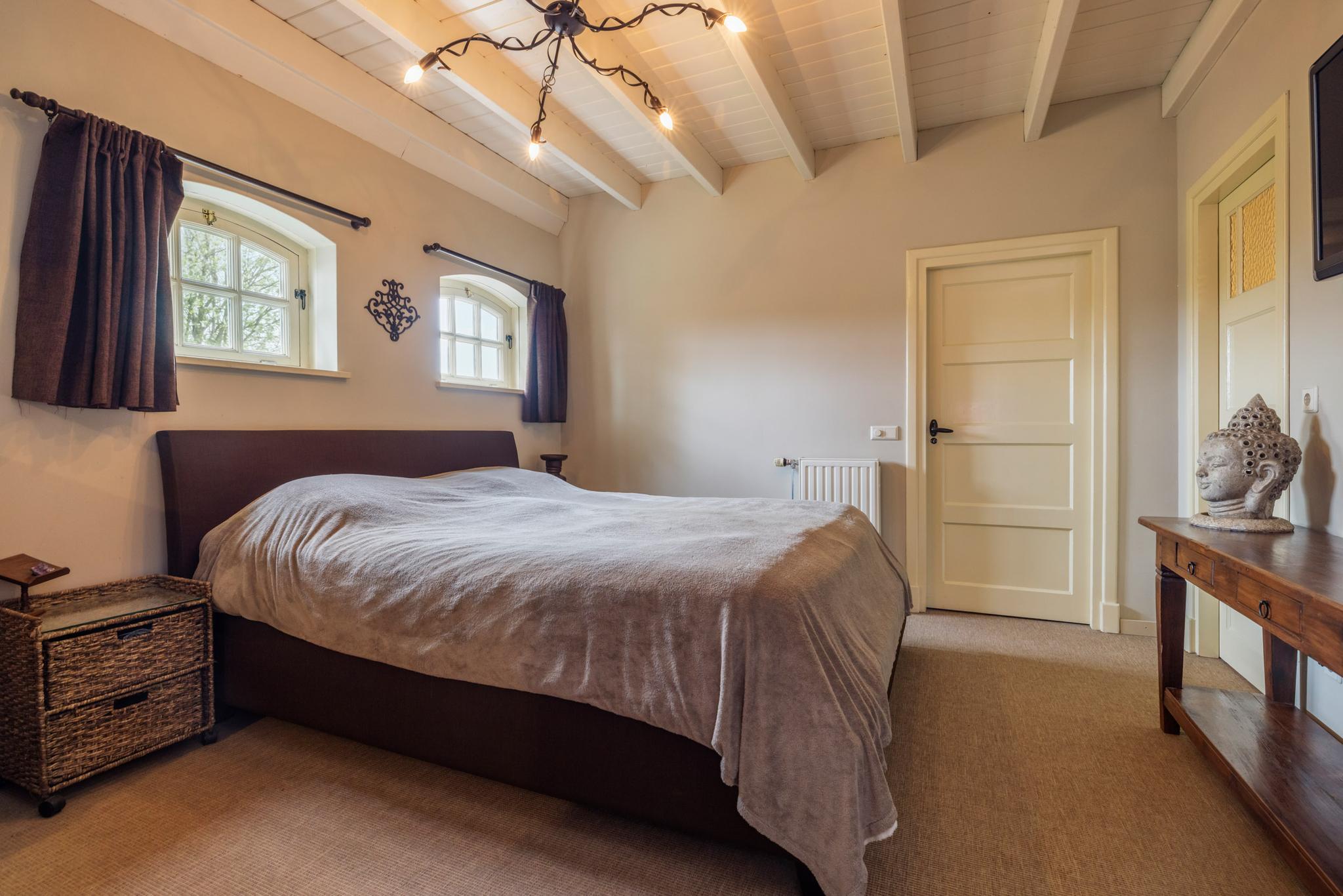 De slaapkamer op de begane grond met de badkamer ensuite beschikt over een inloopkast. De badkamer is voorzien van een wastafel en inloopdouche.