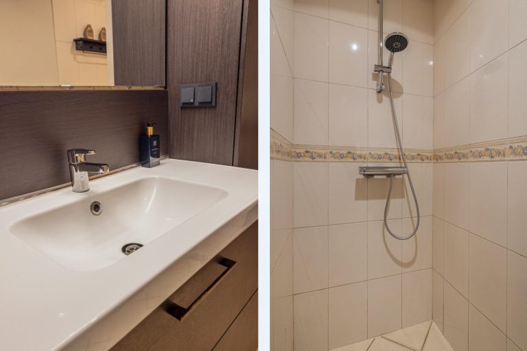 De badkamer is voorzien van een ligbad met douchemogelijkheid, een wastafel en een toilet.