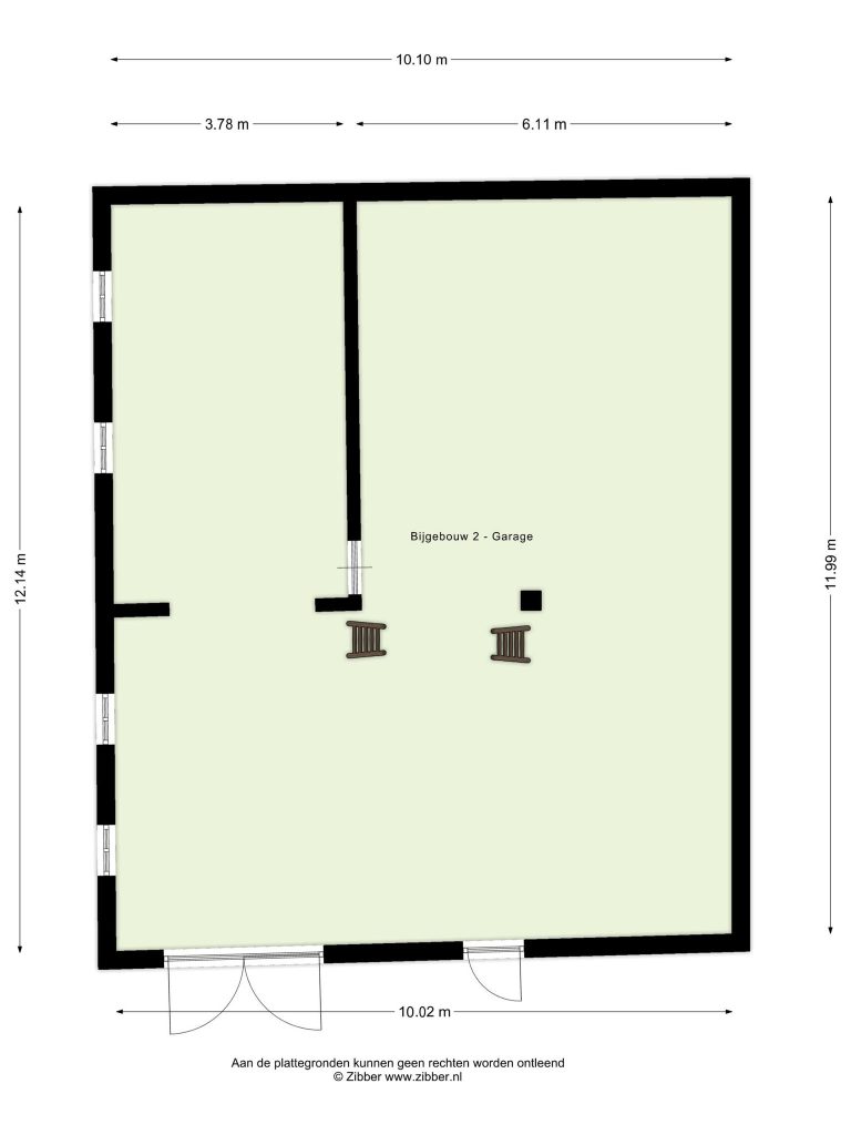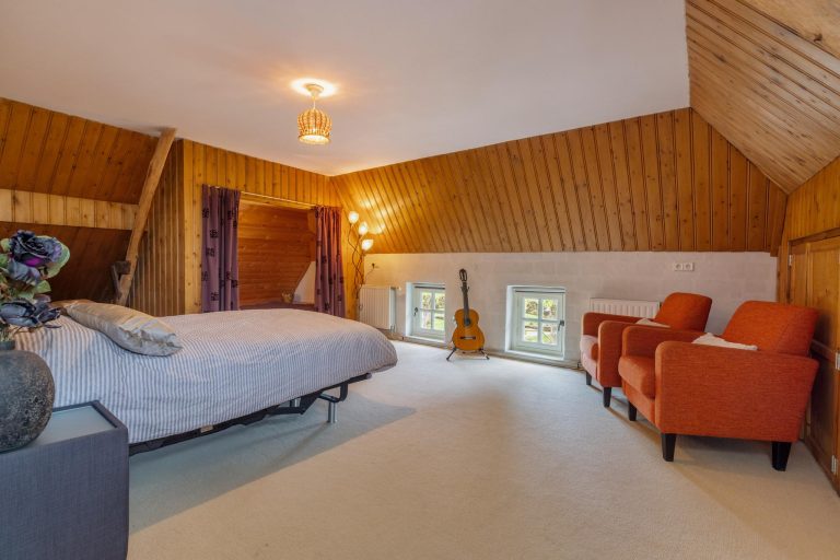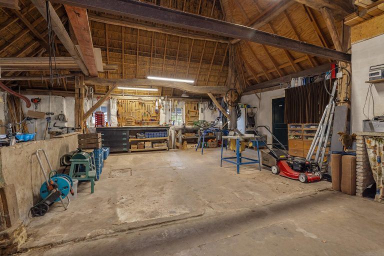 Bijgebouw 2 – de schuur – een ideale multifunctionele ruimte. Door de grote dubbele deuren is het mogelijk om bijvoorbeeld te klussen aan auto’s maar ook een camper te stallen. De dubbele vide zorgt voor extra opslagruimte.