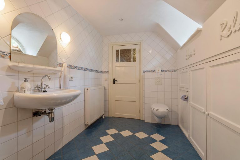 Het achterportaal geeft toegang tot het separate toilet met op maat gemaakt meubel, technische ruimte met de opstelling van de c.v.-combiketel (Nefit Ecomline, 1999), bijkeuken met wasmachine- en drogeraansluiting en inpandige garage. Tevens is hier toegang tot de eerste badkamer met aansluitend een ruime slaapkamer.