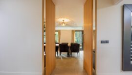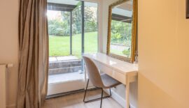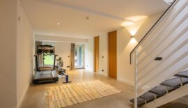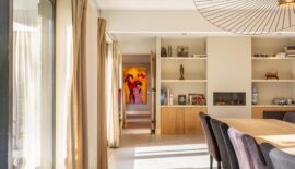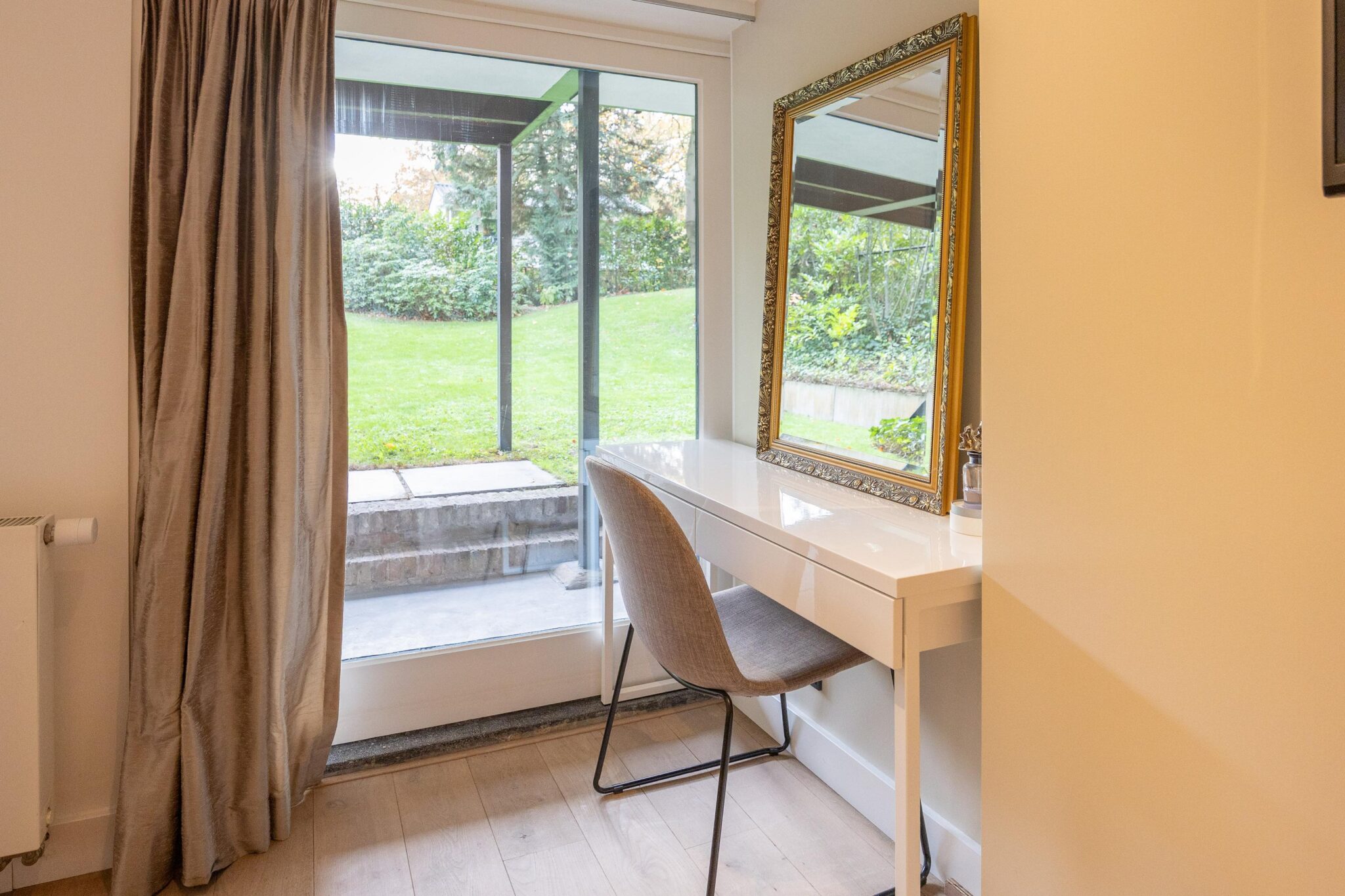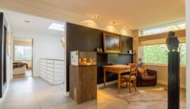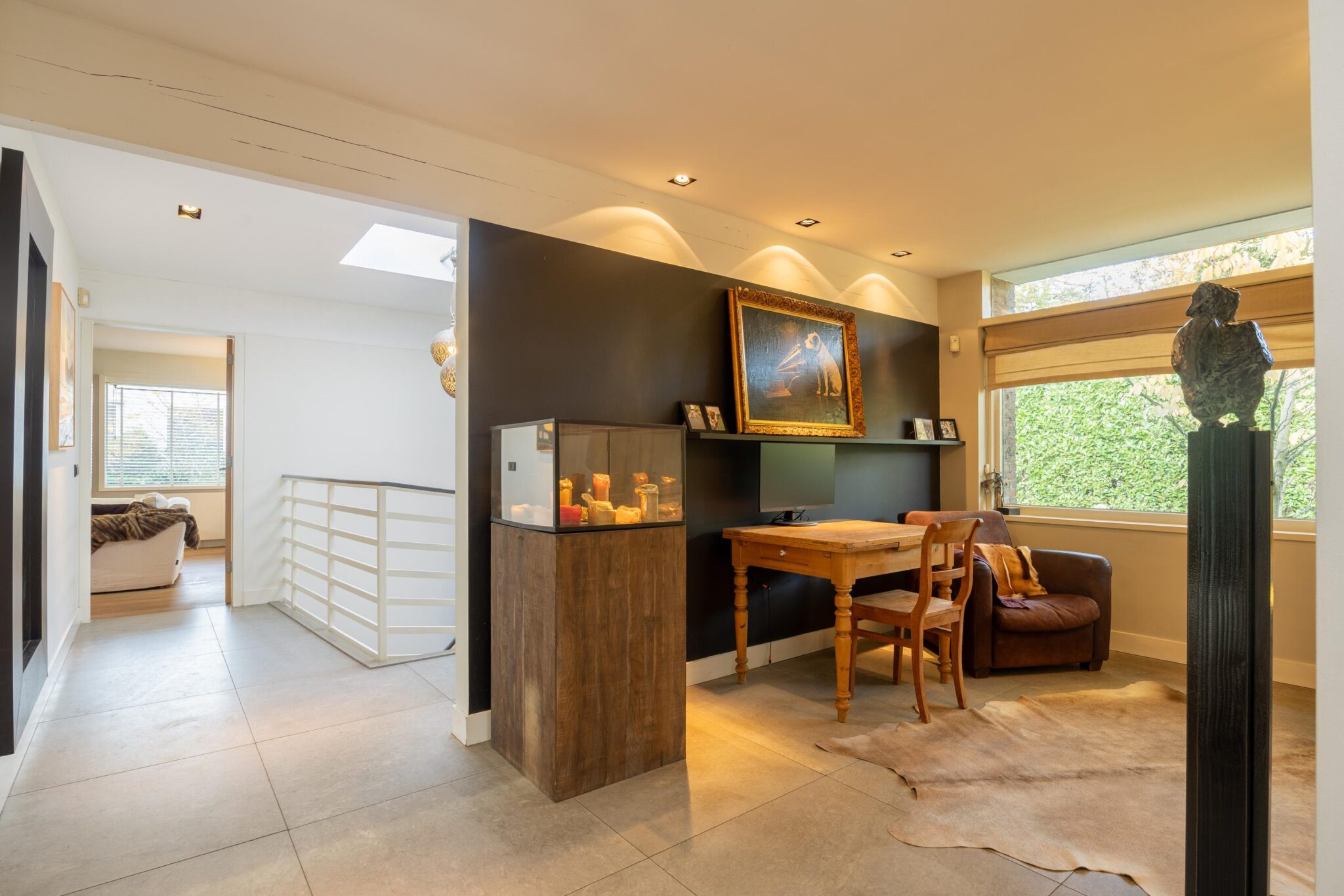 De natuurstenen vloer met vloerverwarming, welke per zone te regelen is, loopt door in een groot deel van de woning en geeft de hal meteen een warme en uitnodigende uitstraling. Aan de voorzijde ligt een multifunctionele ruimte die zich uitstekend leent voor een lees- of speelhoek. Aan de achterzijde bevindt zich de kantoorruimte, rustig gelegen en met zicht op de tuin.