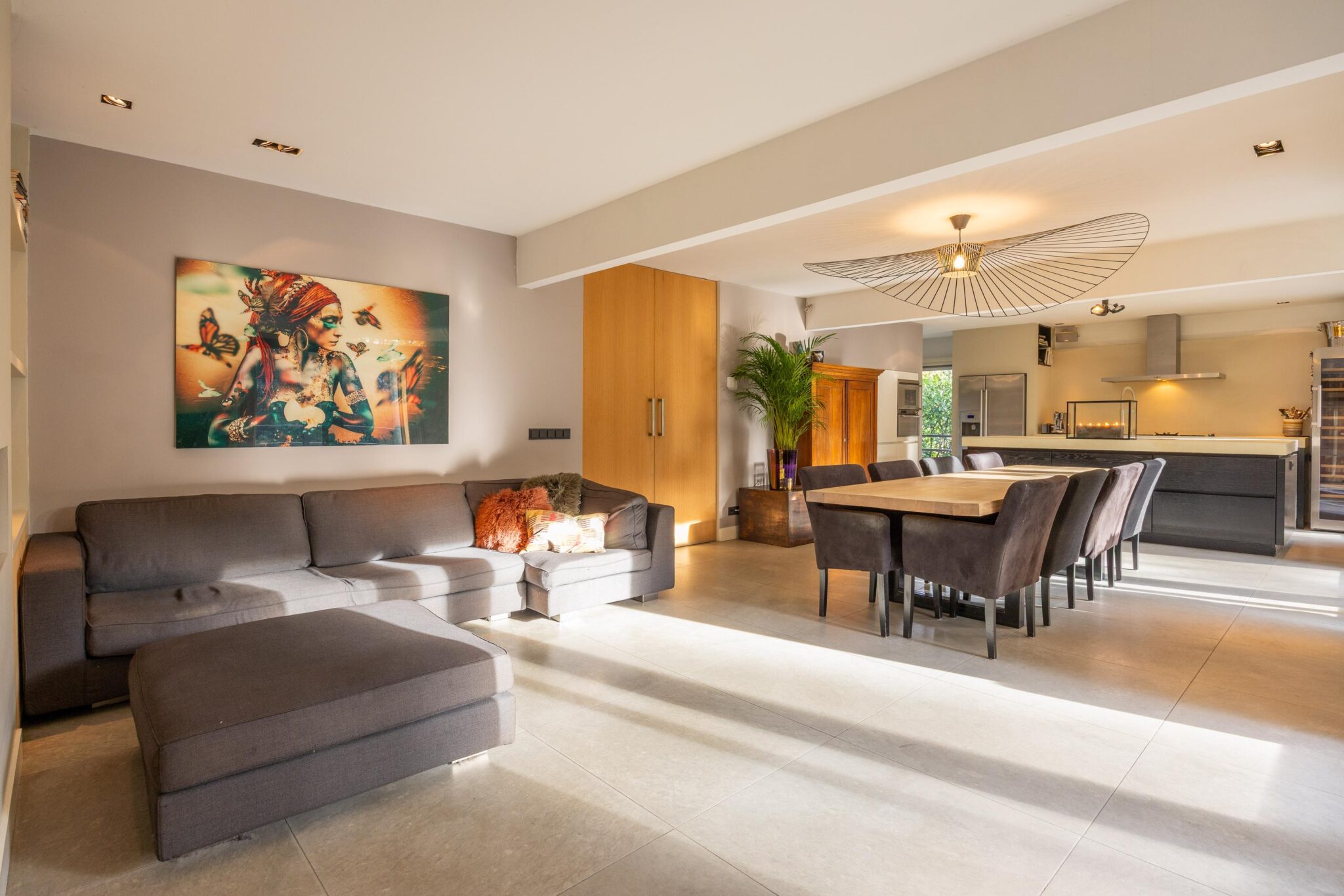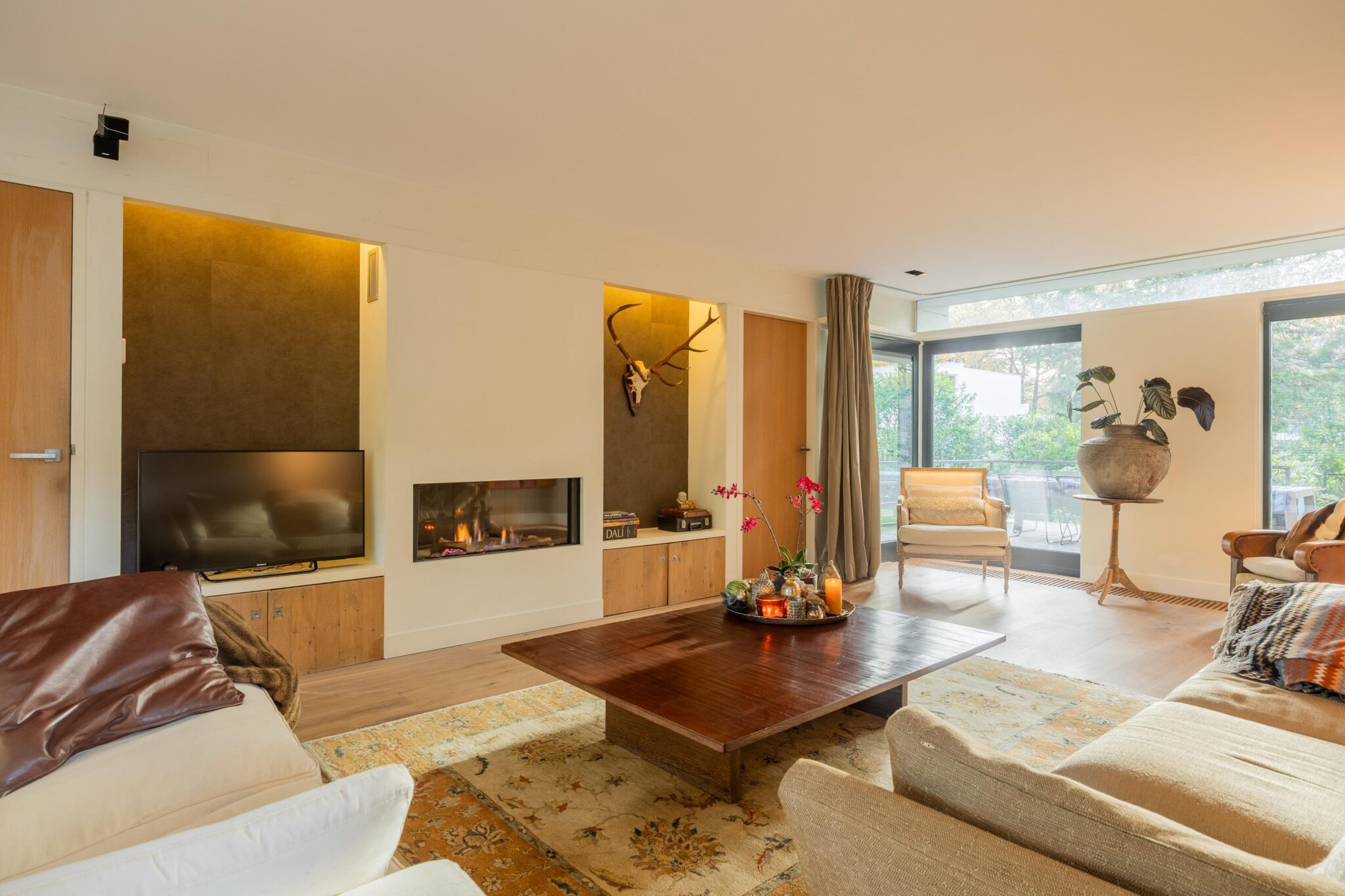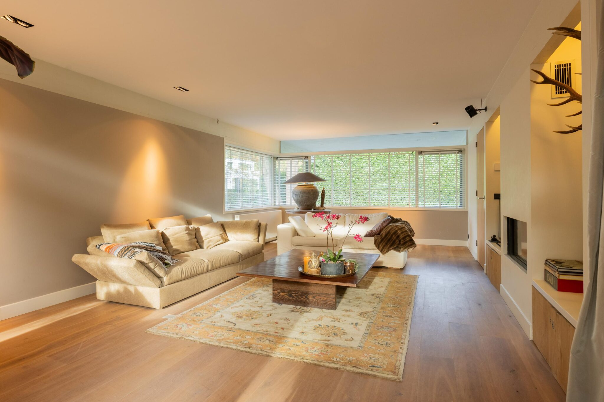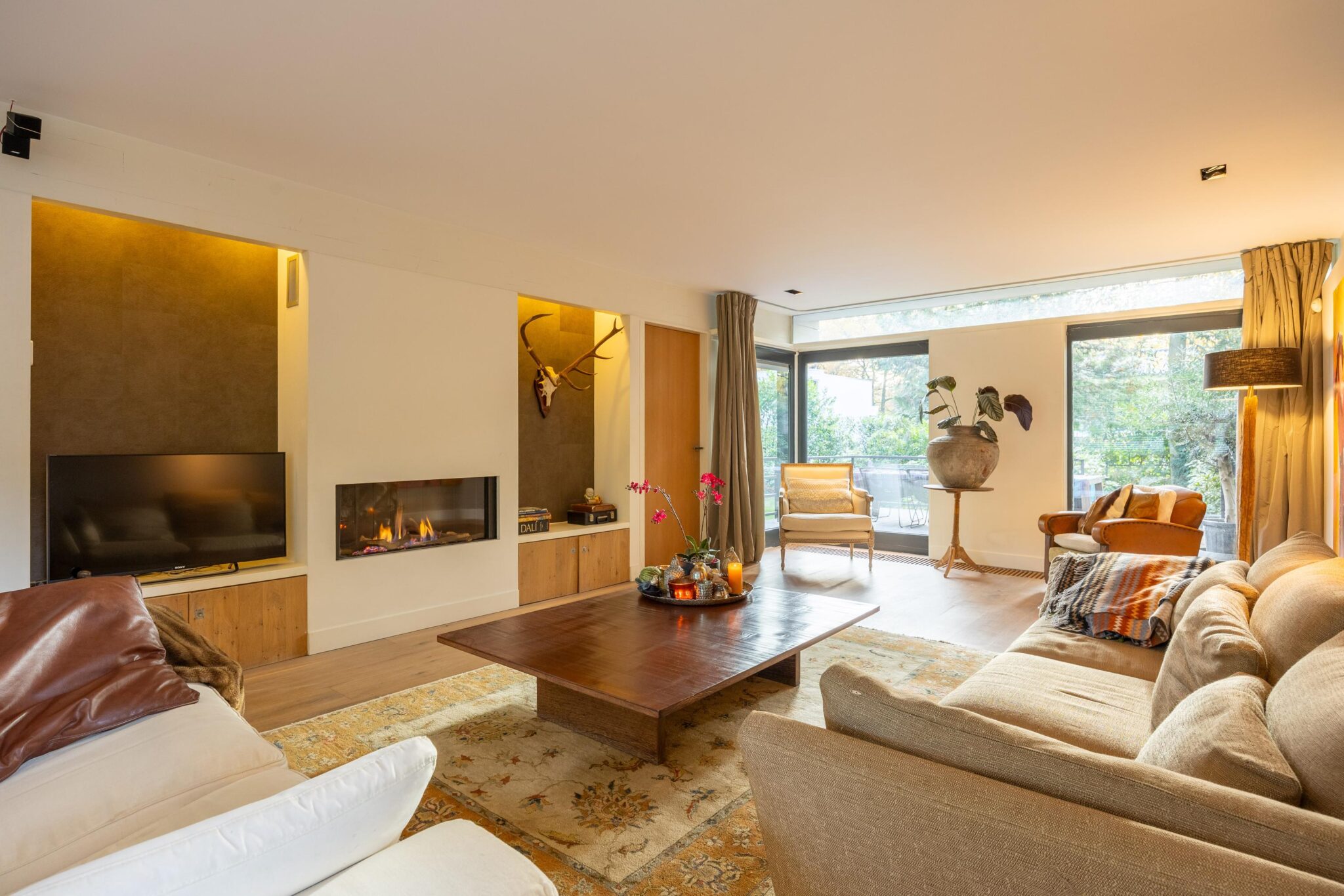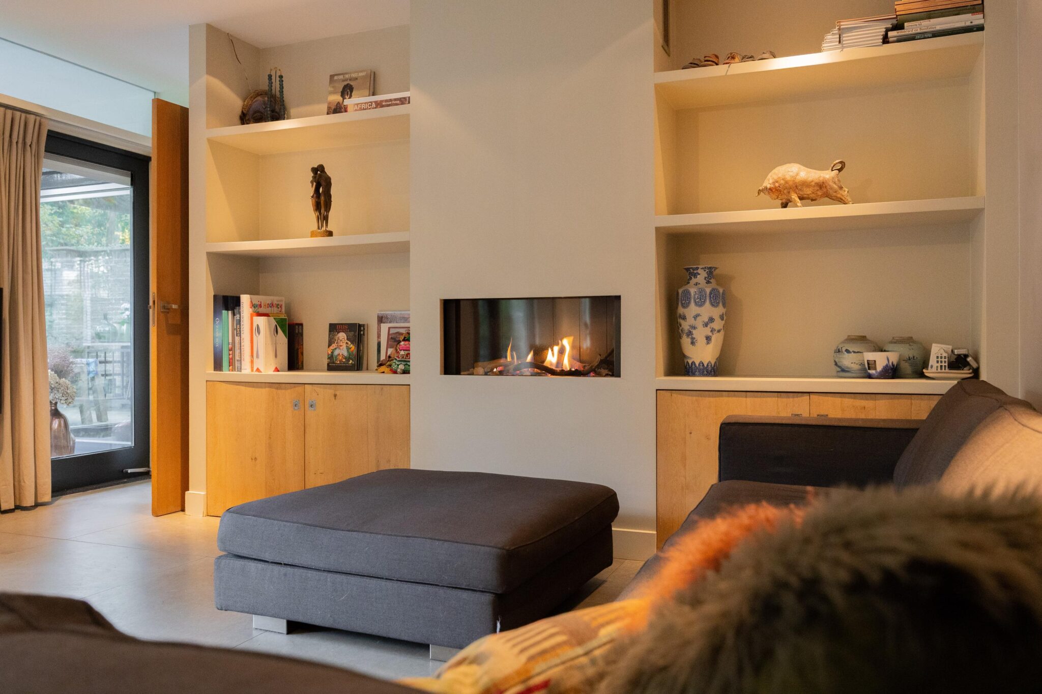 Grenzend aan de woonkeuken ligt de royale living. Grote raampartijen zorgen voor veel licht en bieden uitzicht op zowel het terras aan de achterzijde als de oprit aan de voorzijde. De houten vloer, de sfeervolle gashaard en de ruime opzet creëren een warme, uitnodigende omgeving voor dagelijkse momenten én bijzondere gelegenheden.