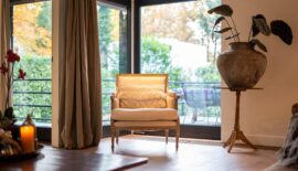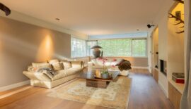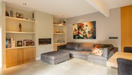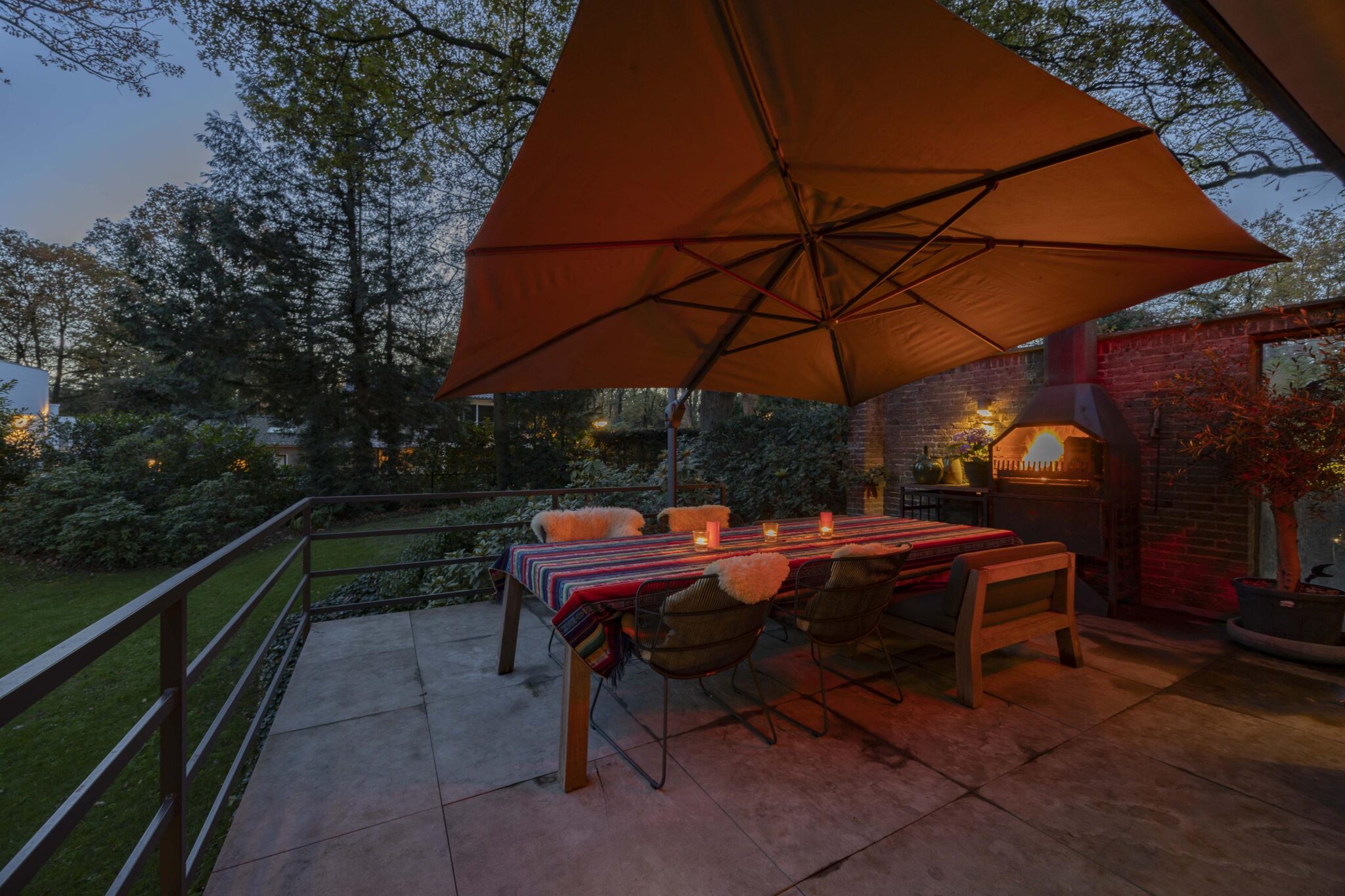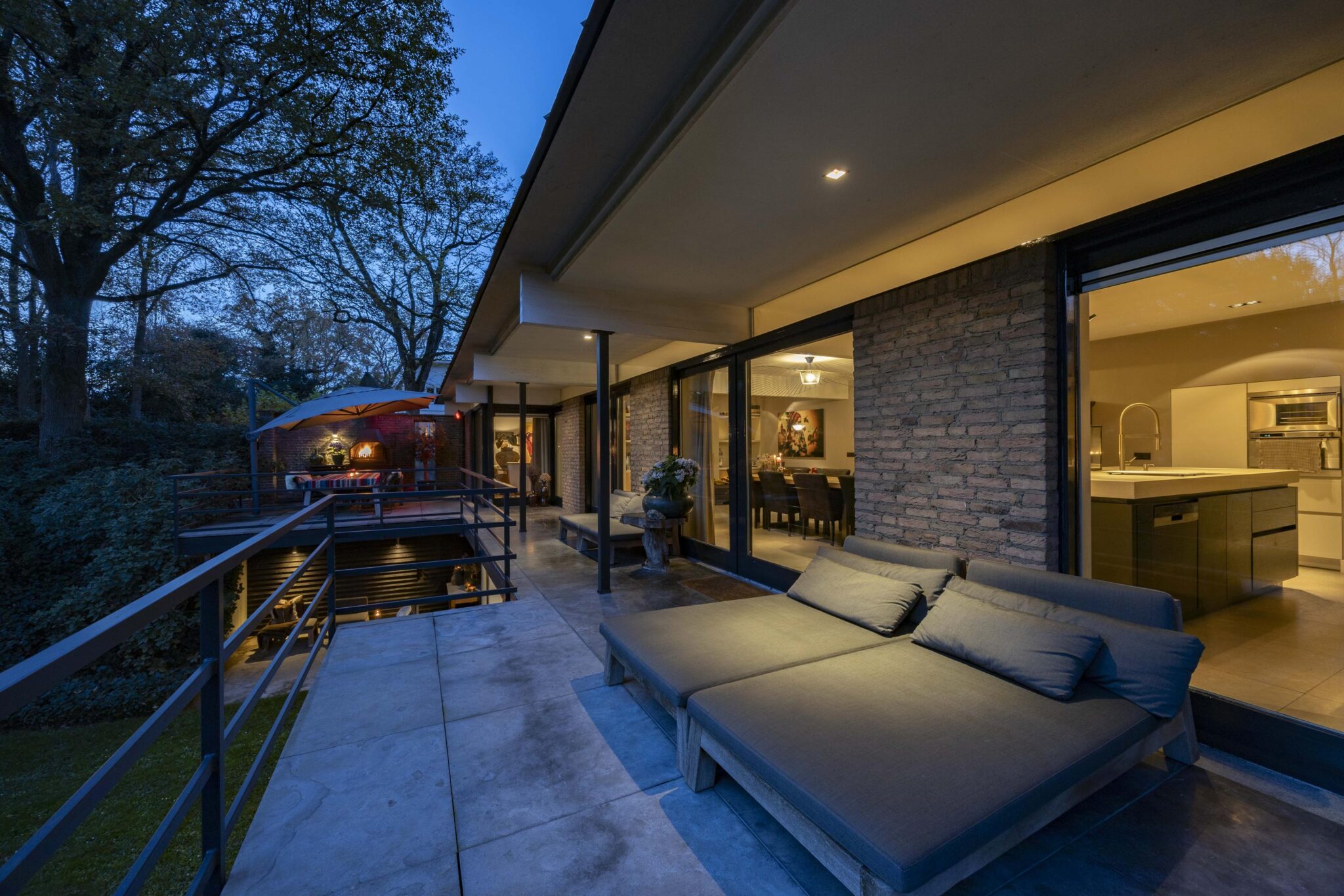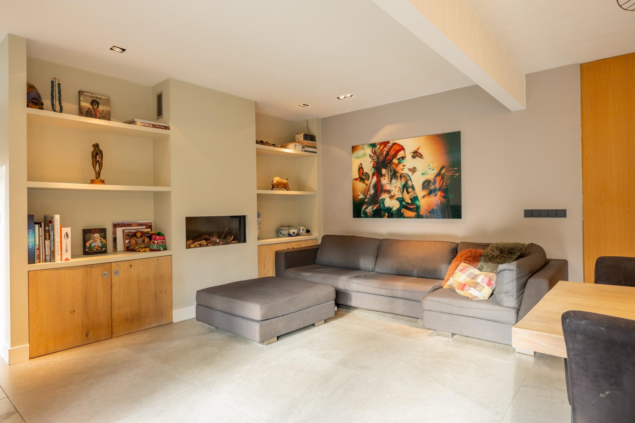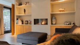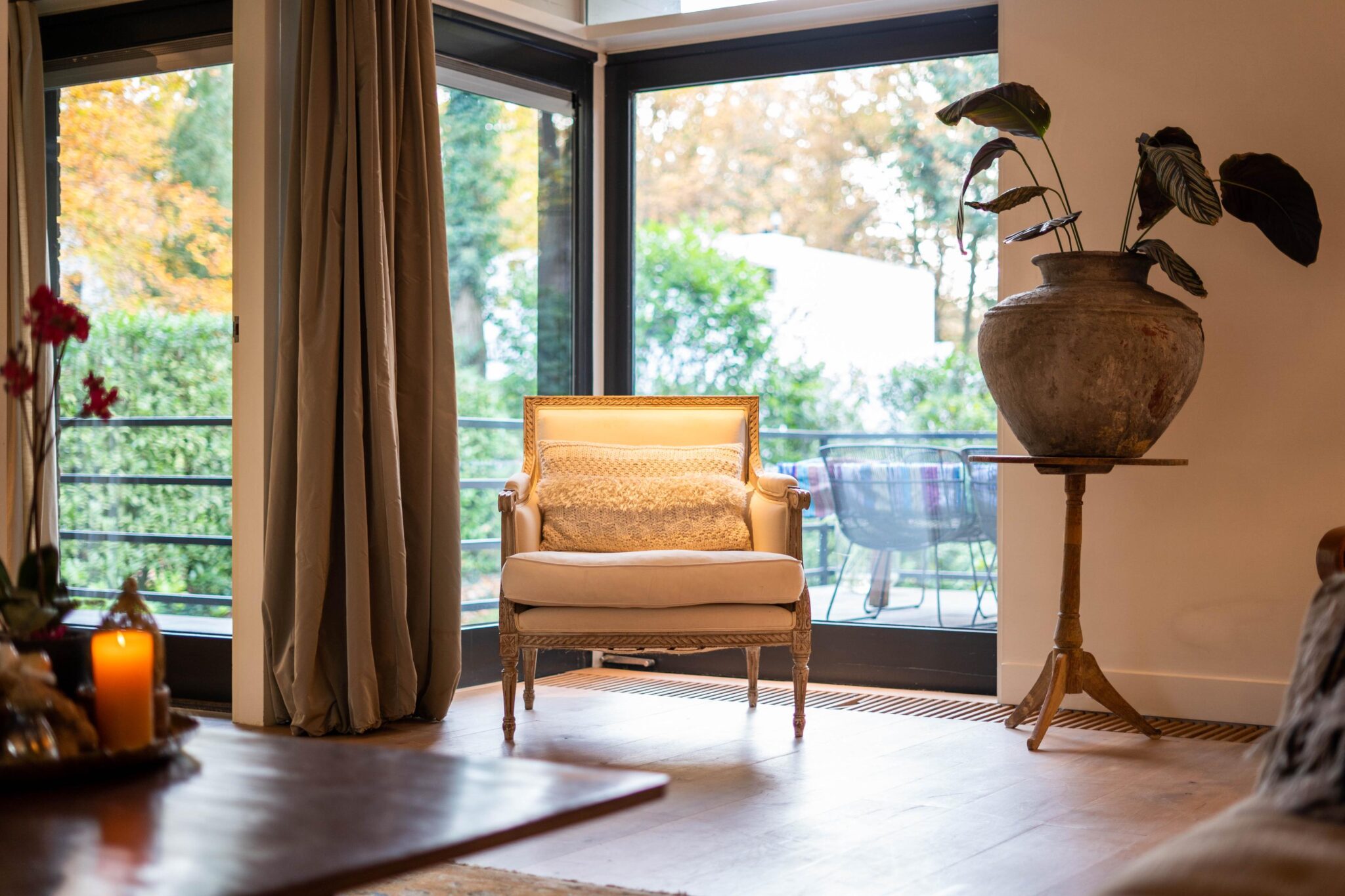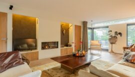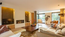 Grenzend aan de woonkeuken ligt de royale living. Grote raampartijen zorgen voor veel licht en bieden uitzicht op zowel het terras aan de achterzijde als de oprit aan de voorzijde. De houten vloer, de sfeervolle gashaard en de ruime opzet creëren een warme, uitnodigende omgeving voor dagelijkse momenten én bijzondere gelegenheden.