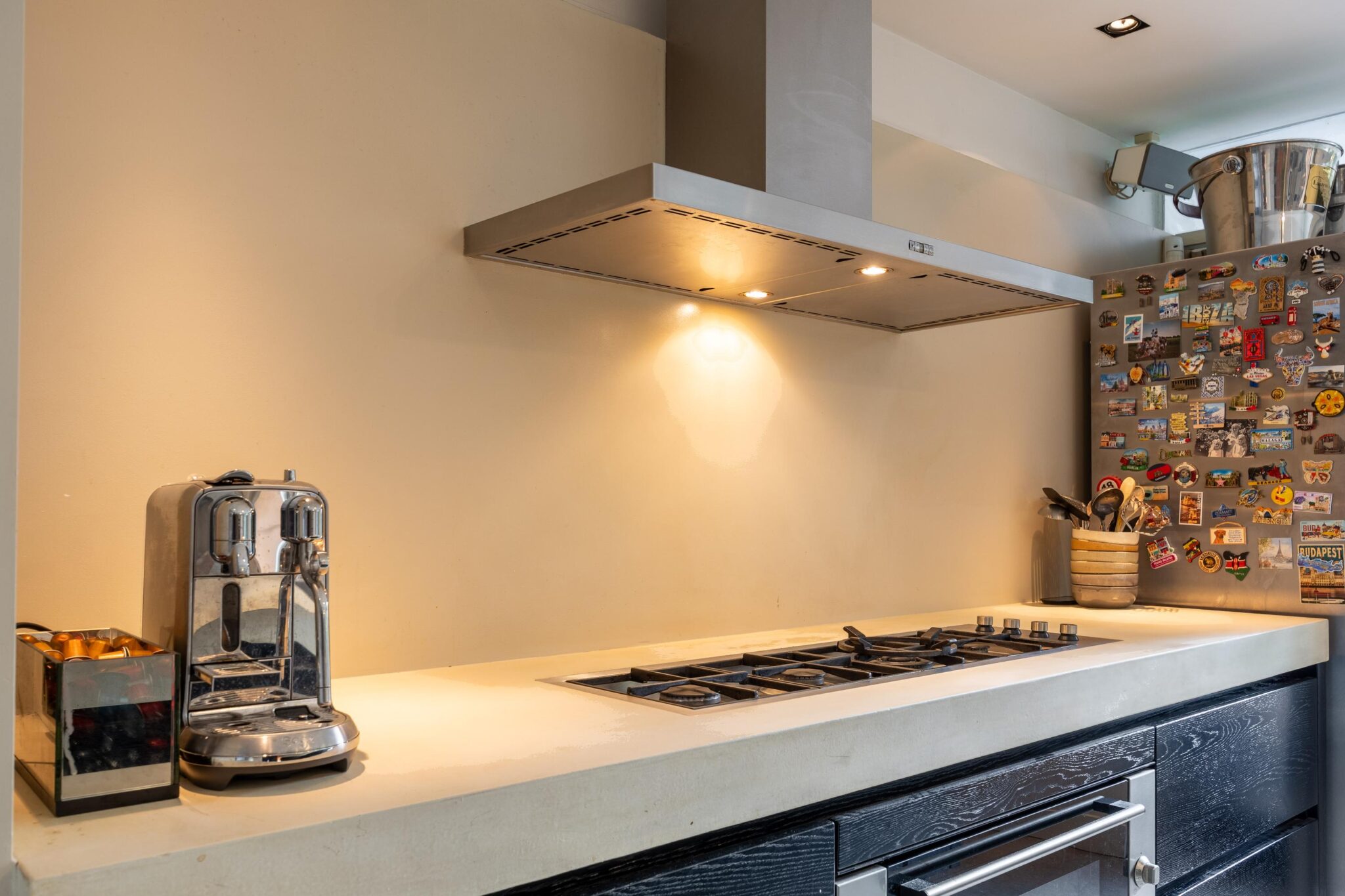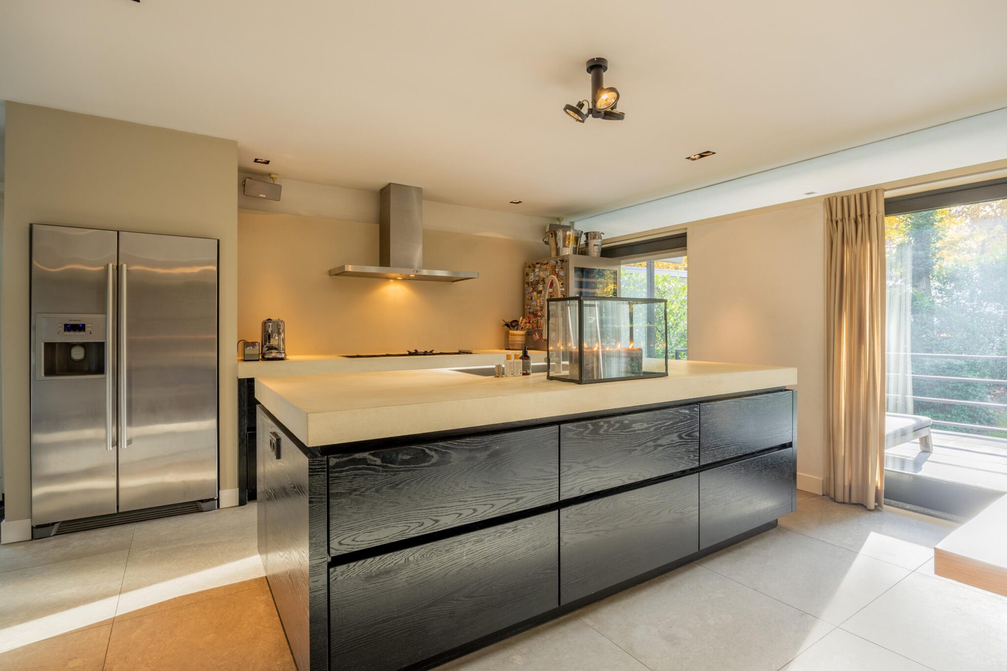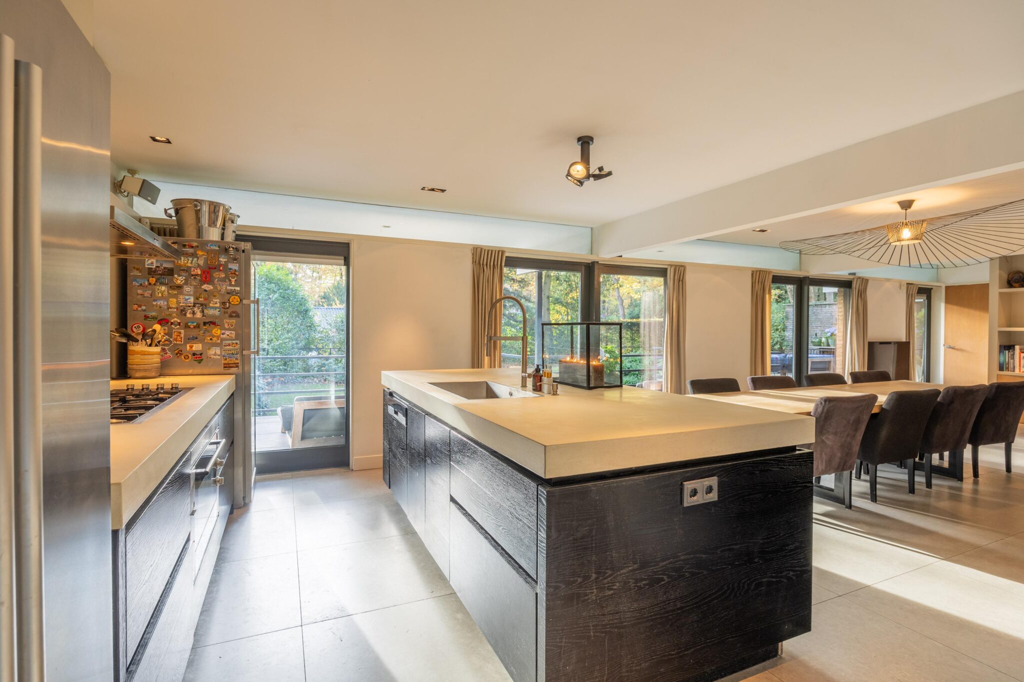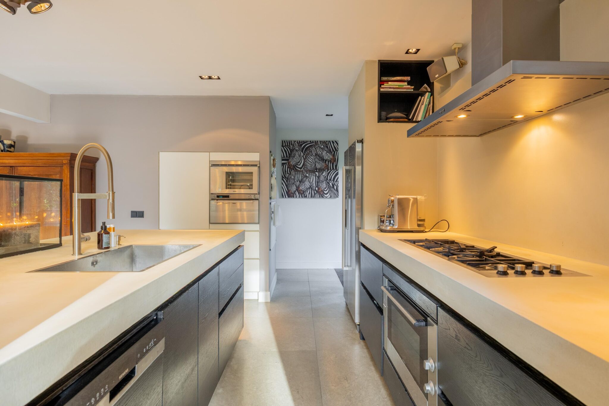 Meerdere schuifpuien verbinden de ruimte met het brede balkon en de tuin. De moderne keukenopstelling is uitgevoerd in een stijlvol kleurenpalet en voorzien van hoogwaardige apparatuur waaronder een stoomoven, gaskookplaat met oven, afzuigkap, vaatwasser en een Amerikaanse koelkast. Het royale stenen werkblad maakt het geheel compleet. Aangrenzend bevindt zich de praktische bijkeuken.