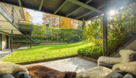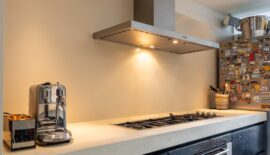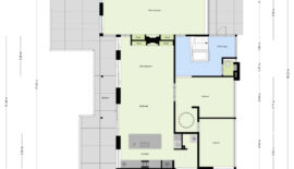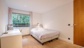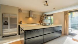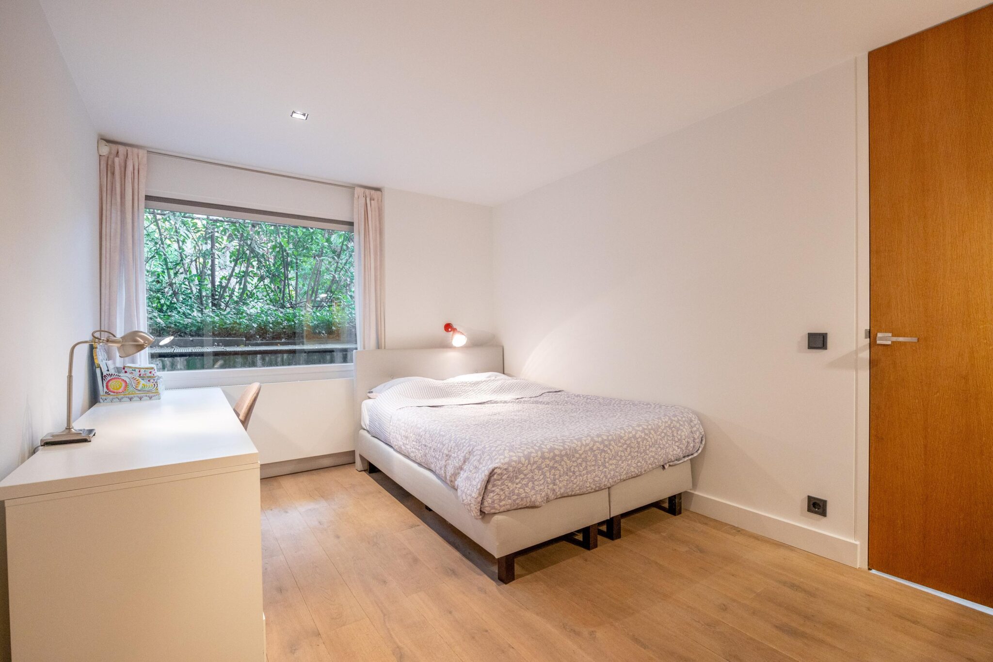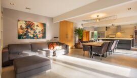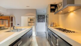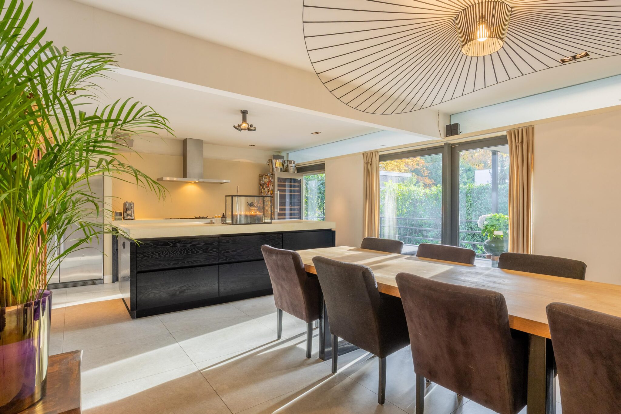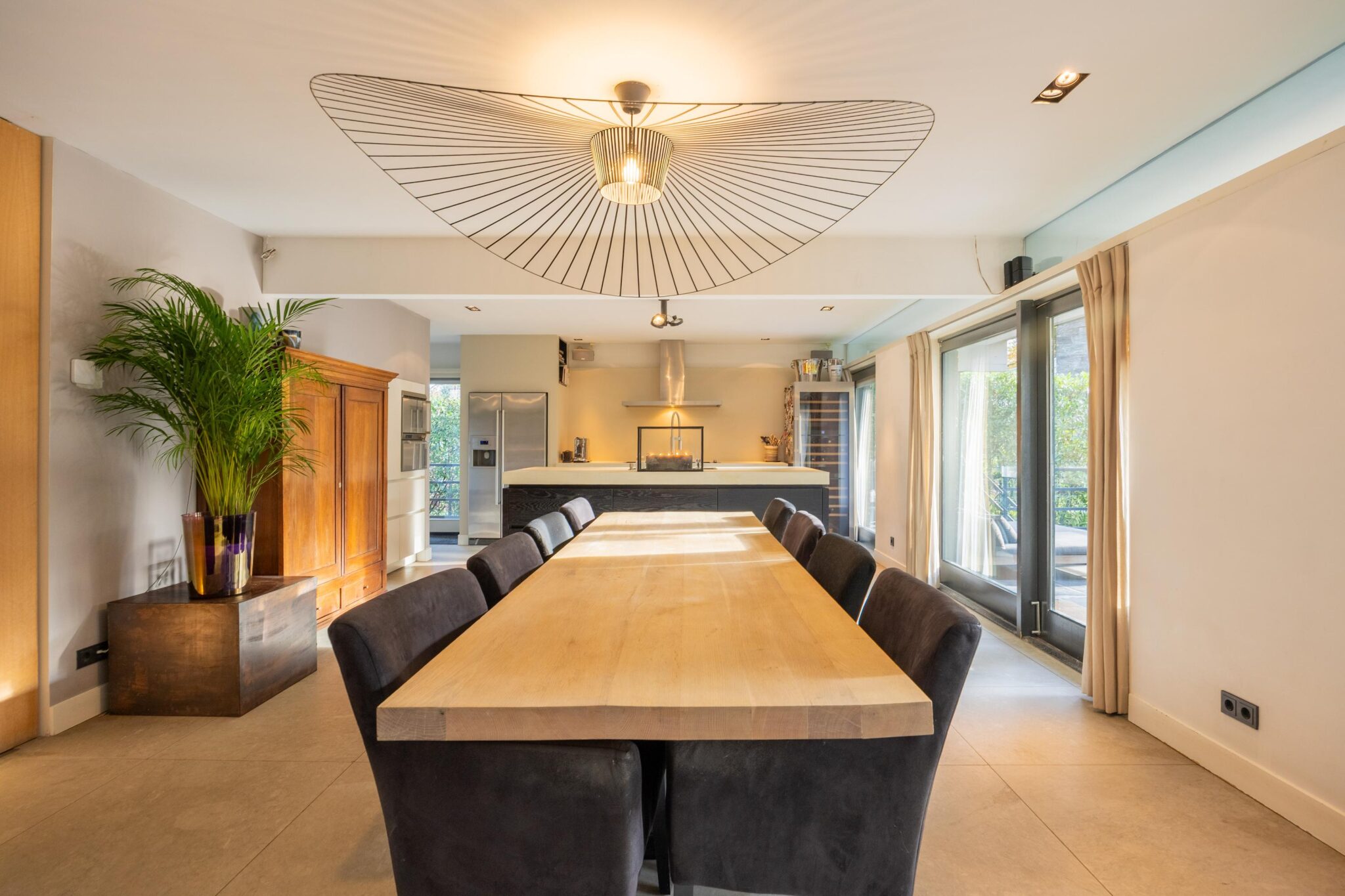 Meerdere schuifpuien verbinden de ruimte met het brede balkon en de tuin. De moderne keukenopstelling is uitgevoerd in een stijlvol kleurenpalet en voorzien van hoogwaardige apparatuur waaronder een stoomoven, gaskookplaat met oven, afzuigkap, vaatwasser en een Amerikaanse koelkast. Het royale stenen werkblad maakt het geheel compleet. Aangrenzend bevindt zich de praktische bijkeuken.