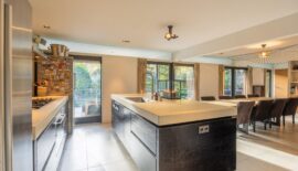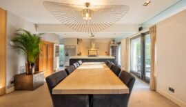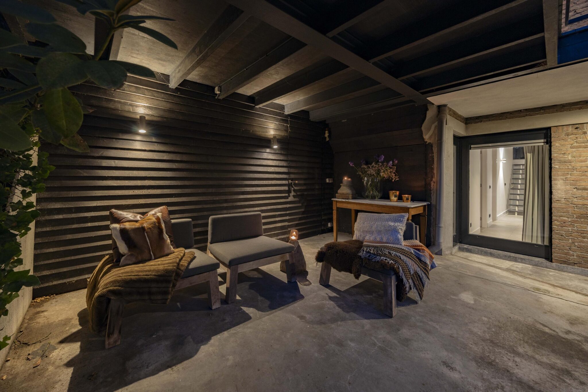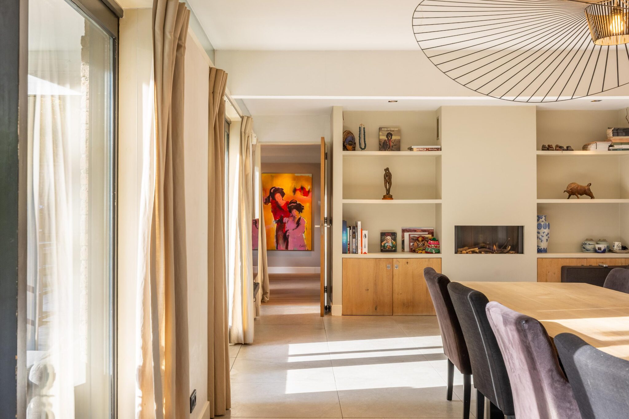 Dubbele houten taatsdeuren leiden naar de royale woonkeuken: een lichte, open ruimte waar wonen, koken en samenzijn op een vanzelfsprekende manier samenkomen. De keuken biedt plaats aan een grote eettafel en een zithoek bij de ingebouwde gashaard.