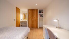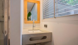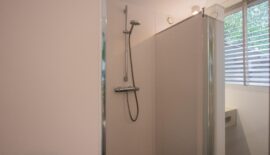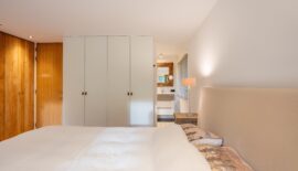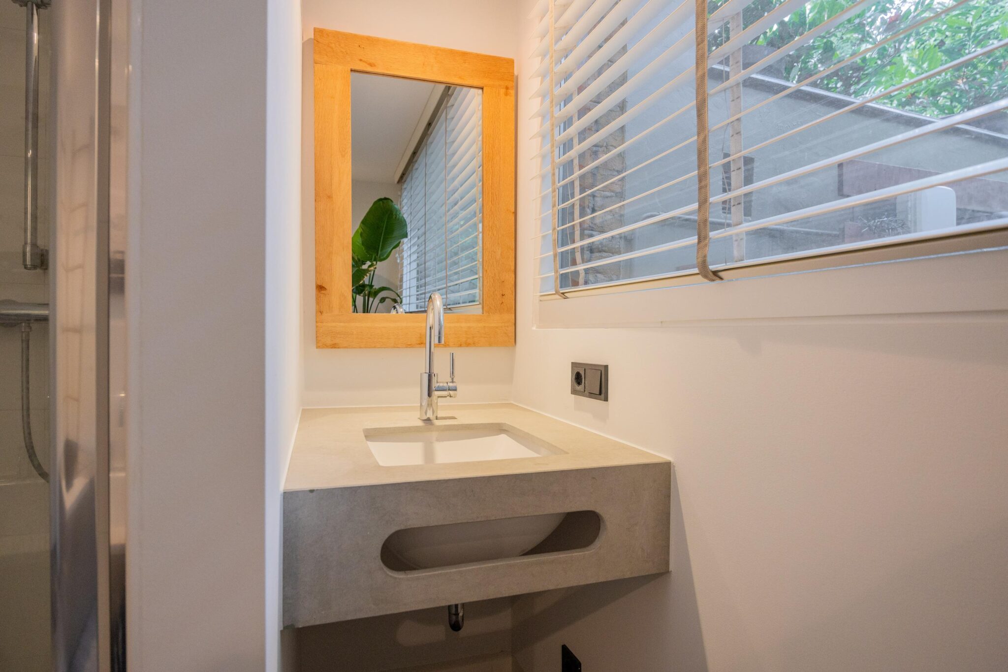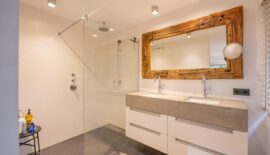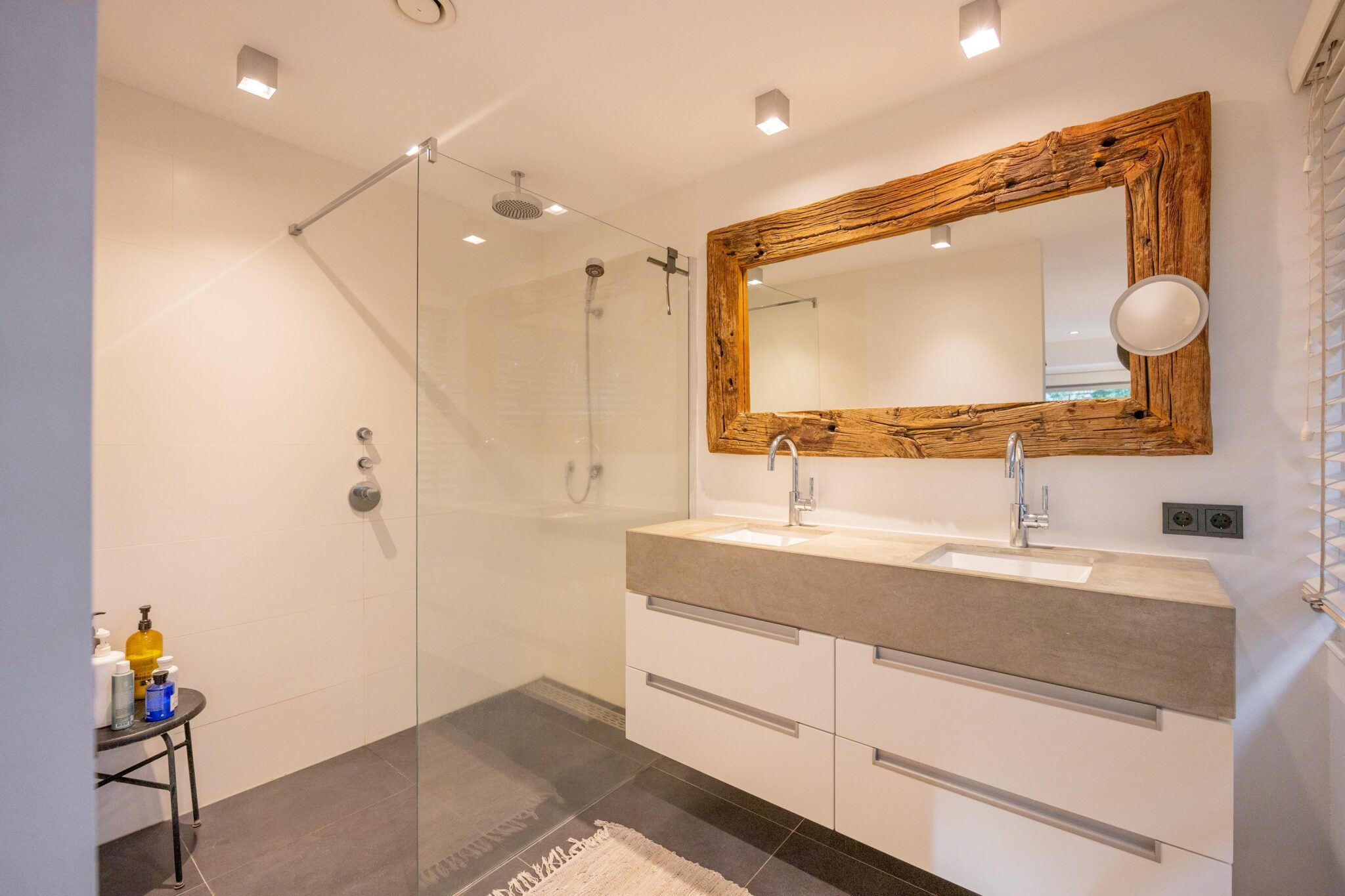 De ouderslaapkamer heeft een eigen badkamer met dubbele wastafel en een elegante inloopdouche met regendouchekop en ingebouwde kranen.