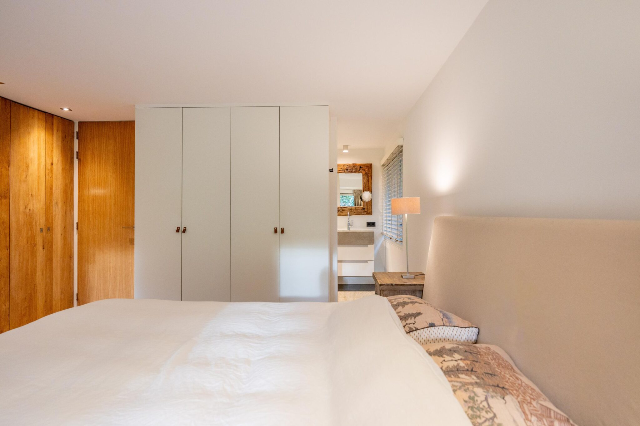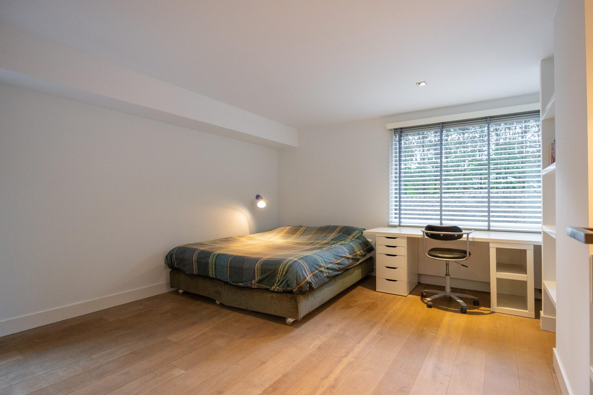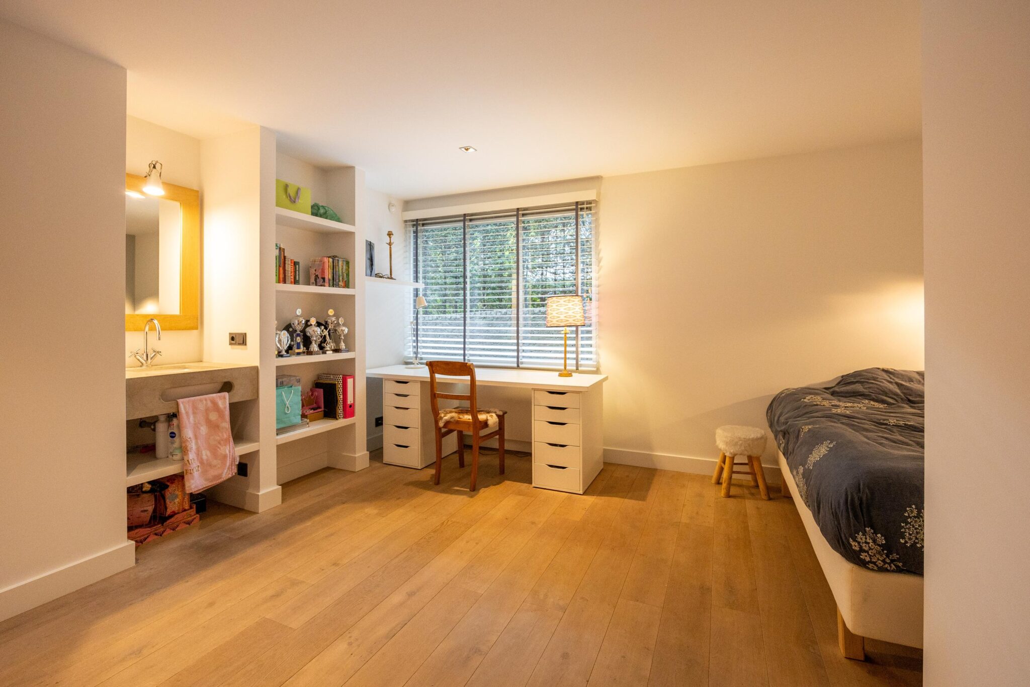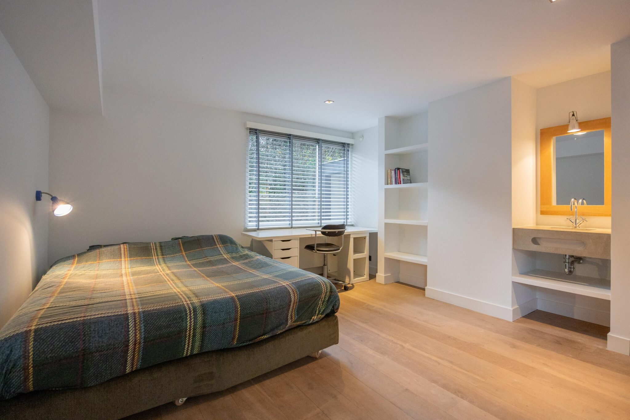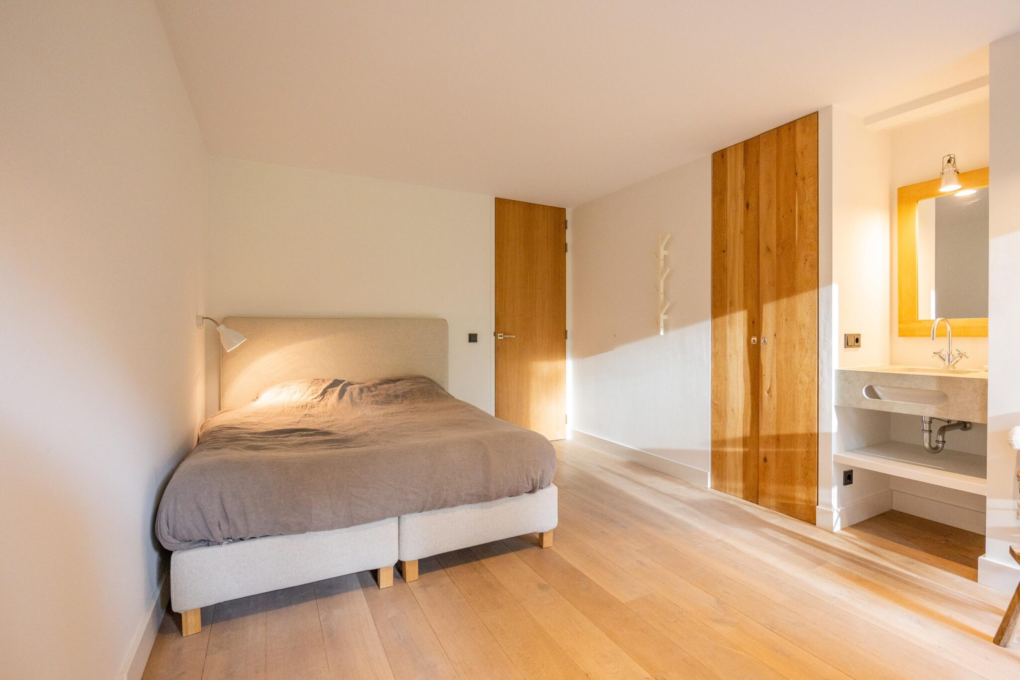 De slaapverdieping ligt deels onder peil, wat zorgt voor een unieke en intieme sfeer. Hier bevinden zich vijf ruime slaapkamers, elk voorzien van een houten vloer, een moderne wastafel en ruime inloop- of inbouwkasten.