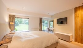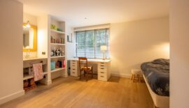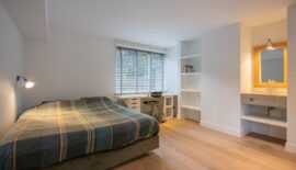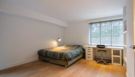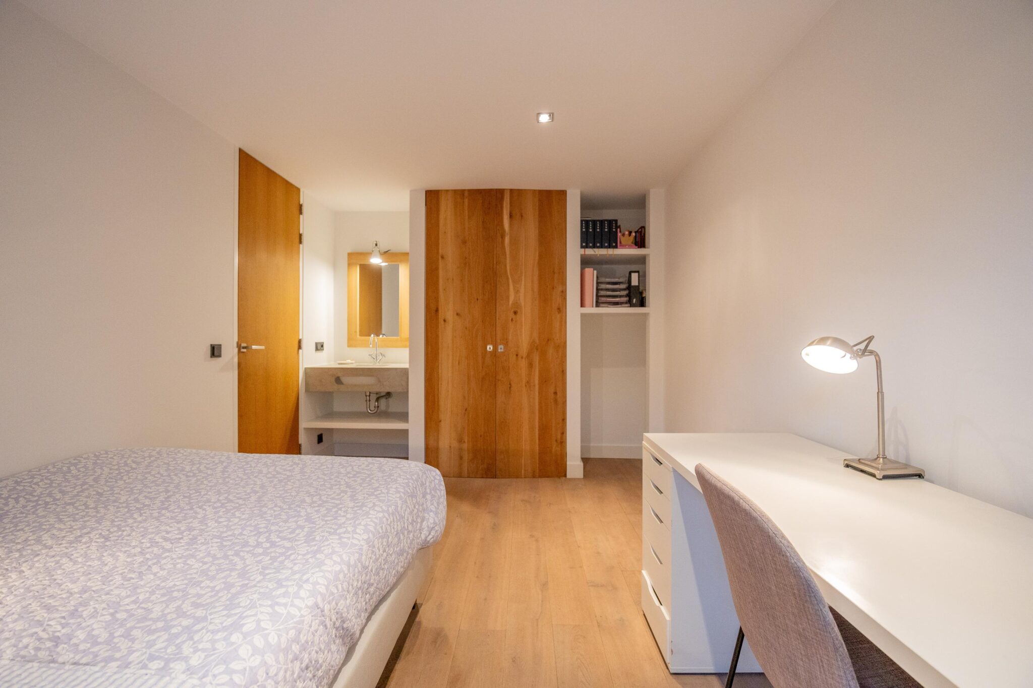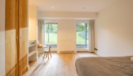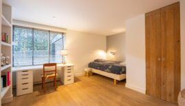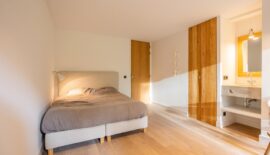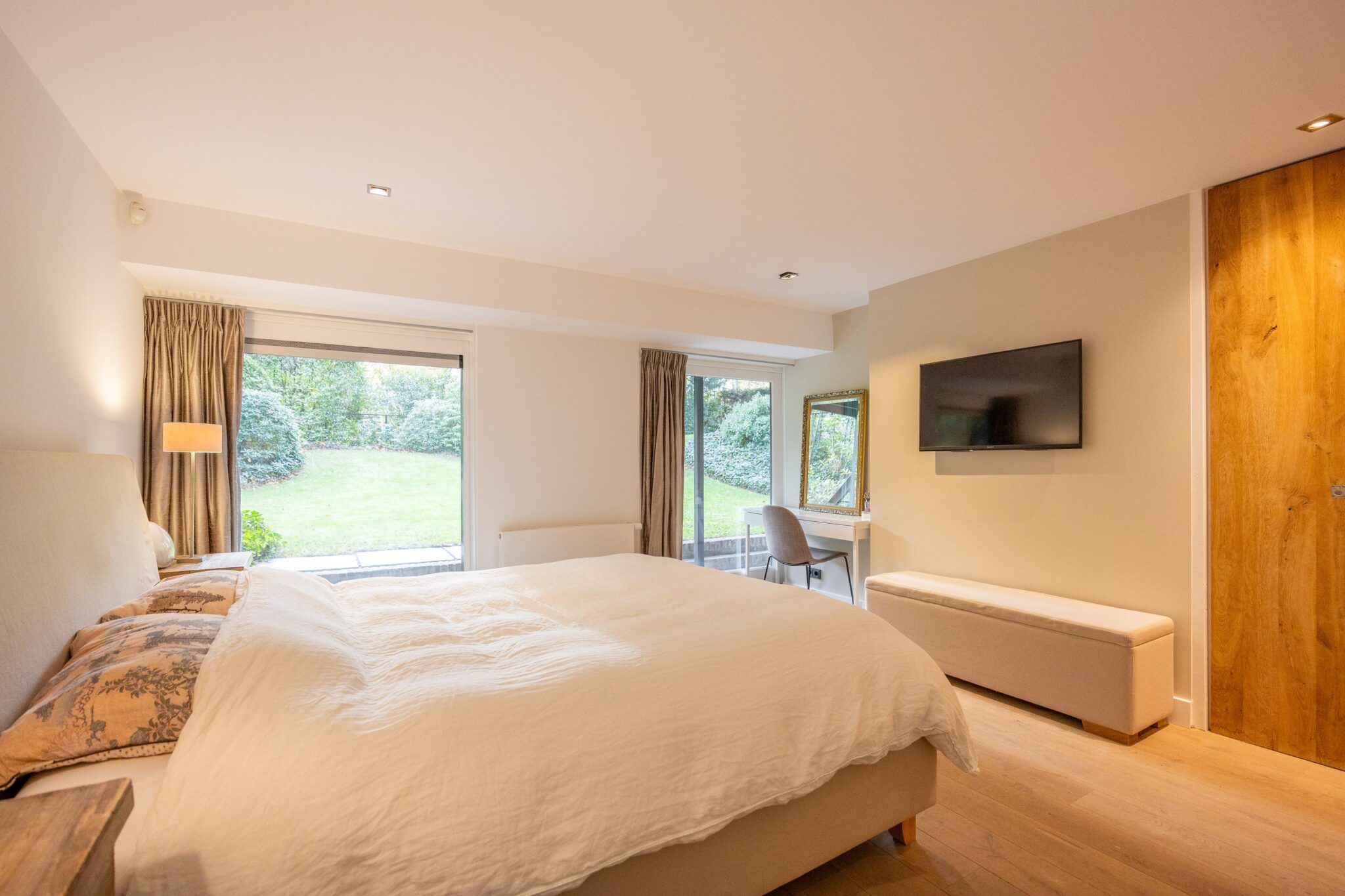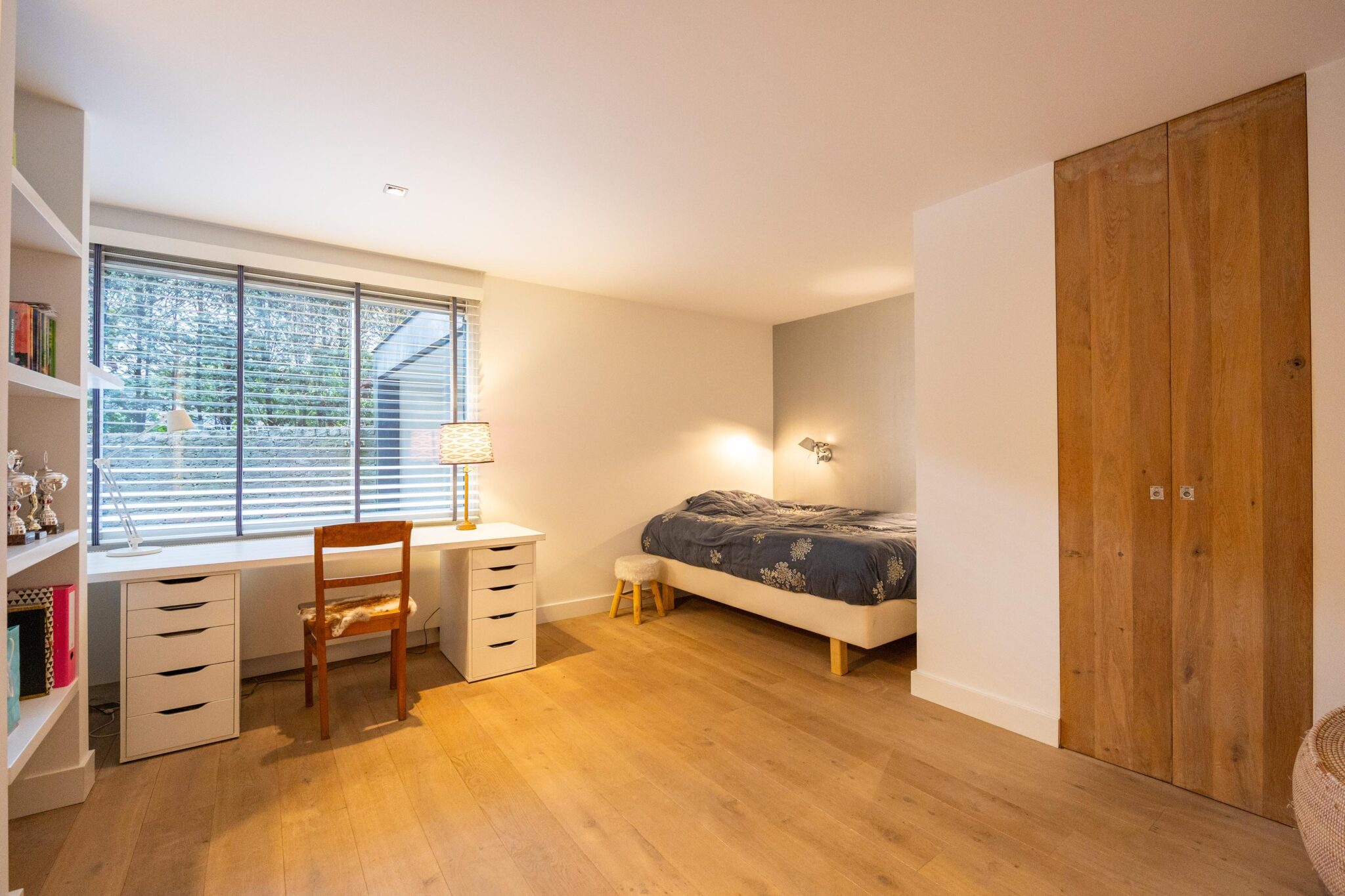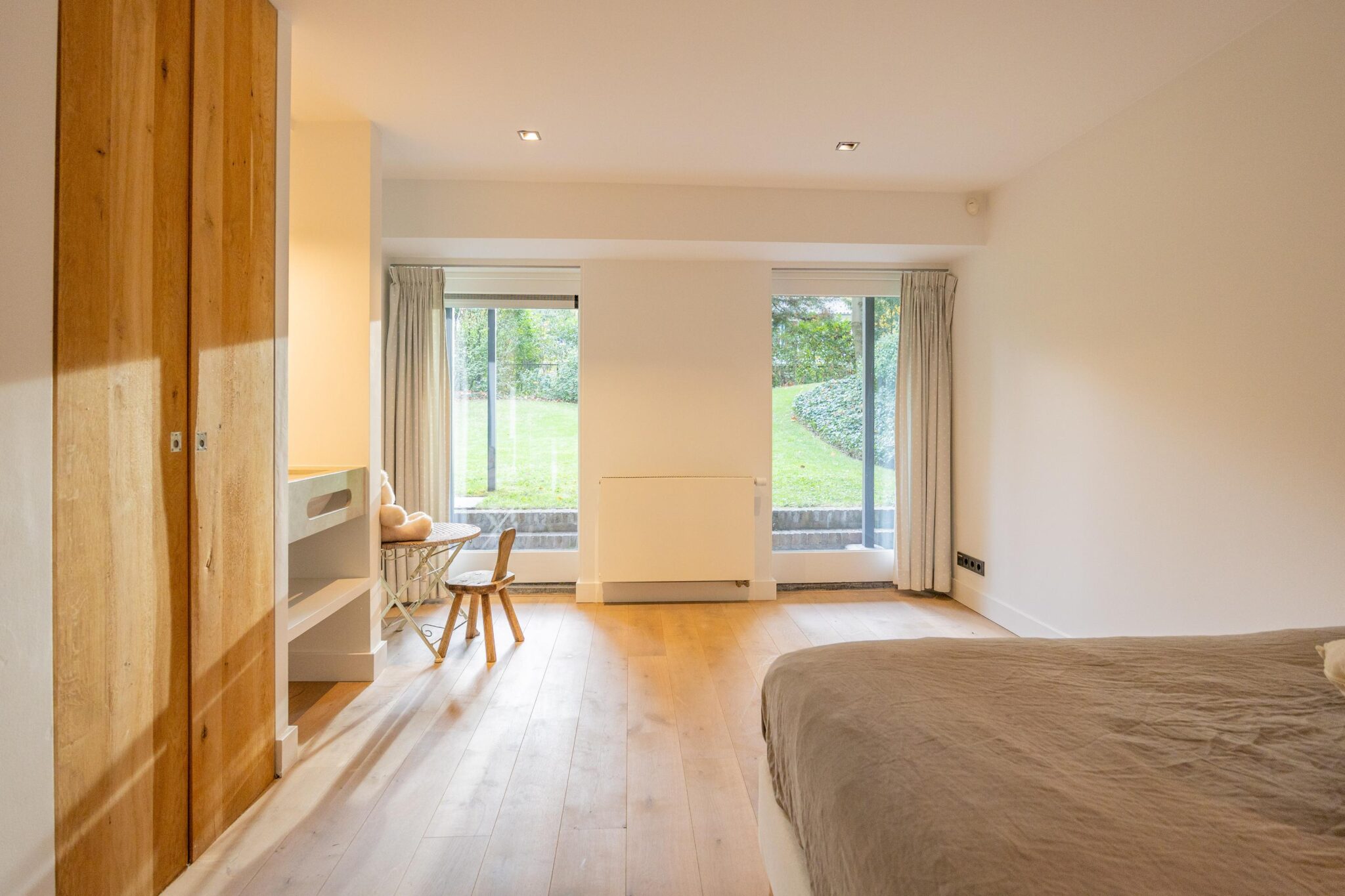 De slaapverdieping ligt deels onder peil, wat zorgt voor een unieke en intieme sfeer. Hier bevinden zich vijf ruime slaapkamers, elk voorzien van een houten vloer, een moderne wastafel en ruime inloop- of inbouwkasten.