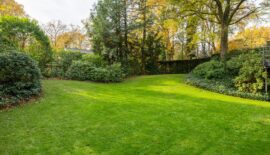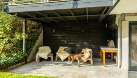 De tuin beschikt over een gazon, volwassen beplanting en een looppad richting de brede oprit. De oprit biedt plaats aan meerdere auto’s en is voorzien van een royale carport met elektrische autopoort. Ook de installatie voor tuinberegening bevindt zich hier.