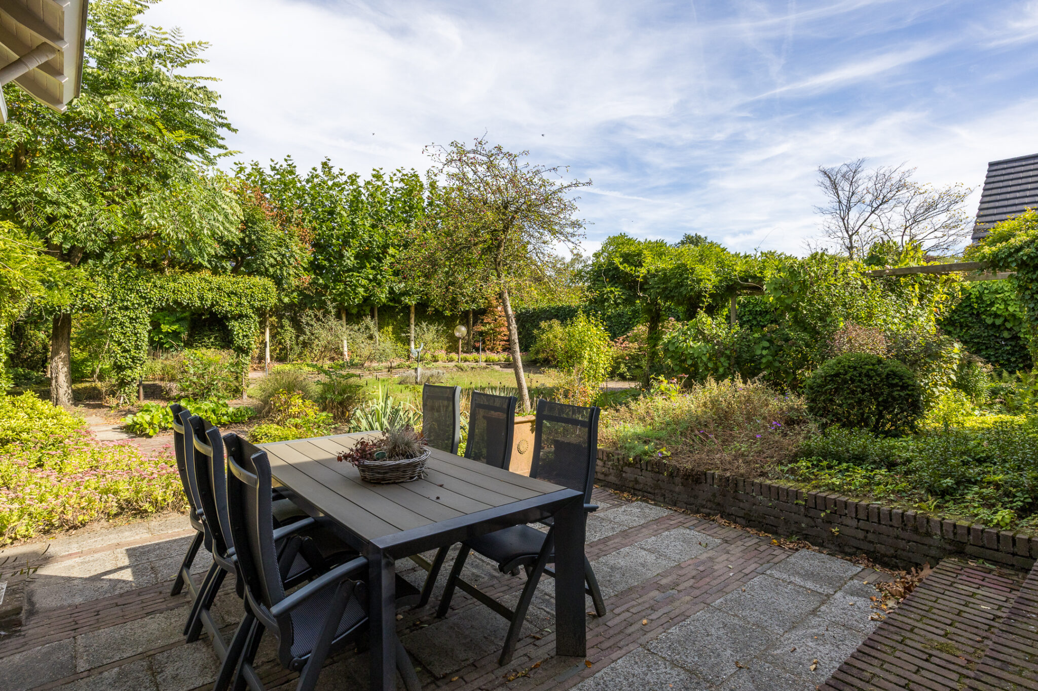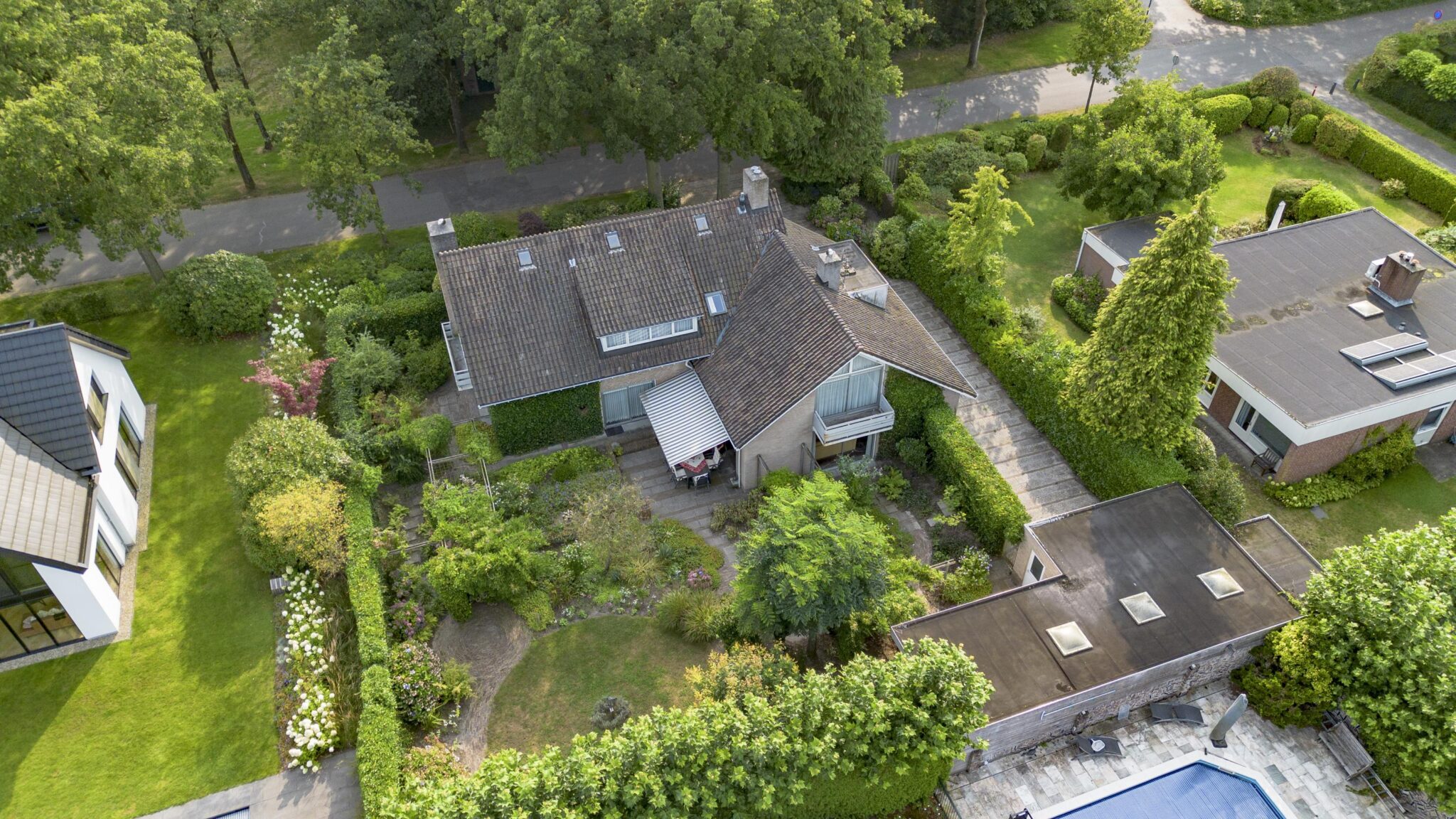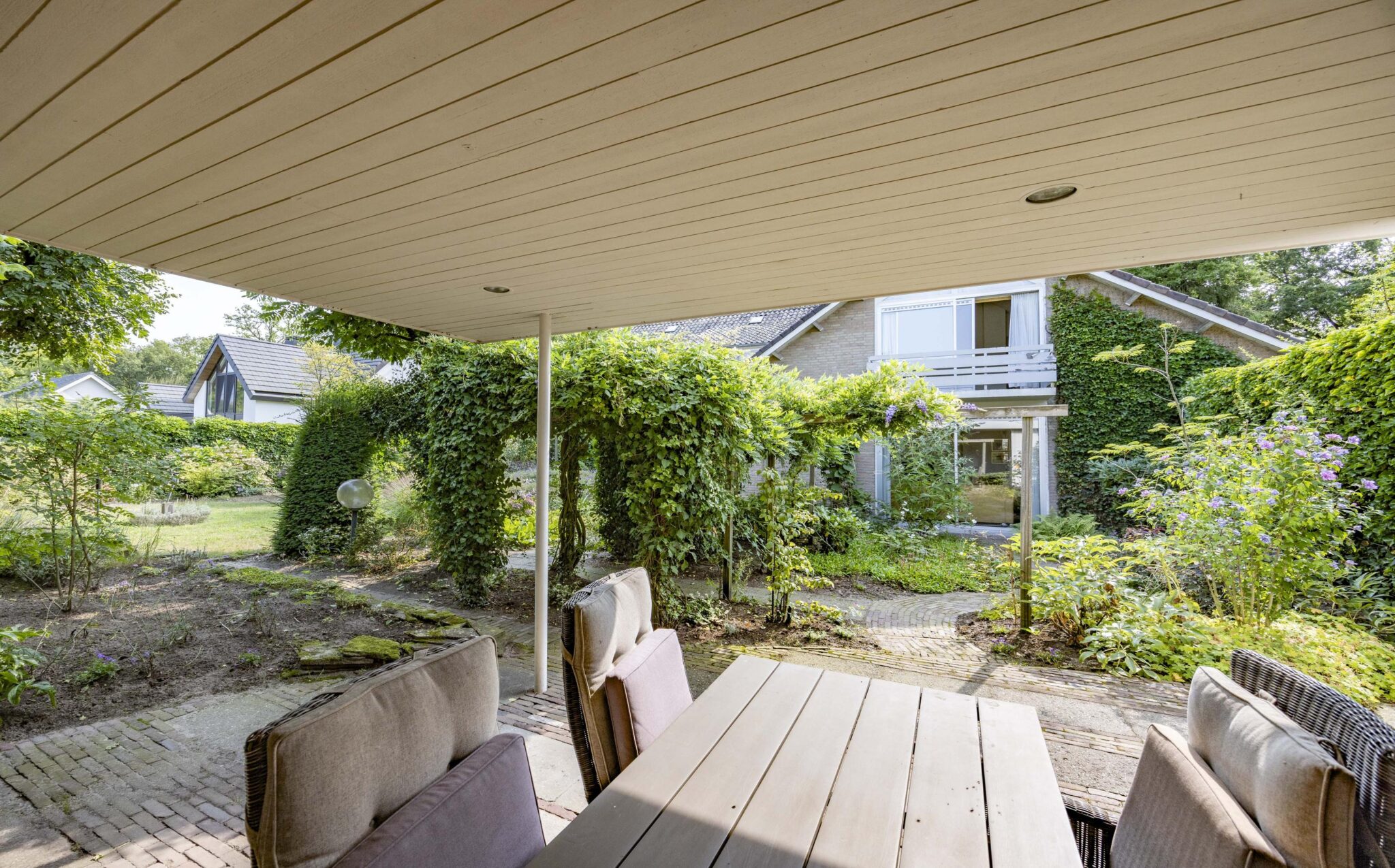 De prachtige grote bomen langs de brede laan zorgen voor een statige uitstraling. De voortuin is royaal aangelegd, met een grote oprit die ruimte biedt aan meerdere auto’s, en leidt naar de ruime dubbele garage. Daarnaast is er een fietsenberging en een overdekt terras .