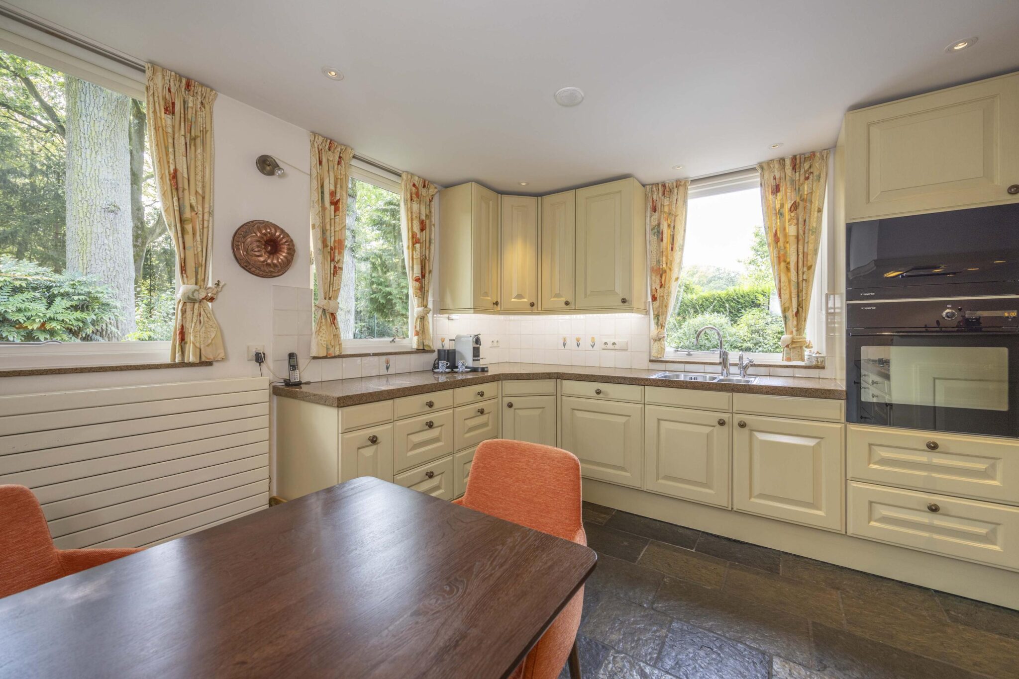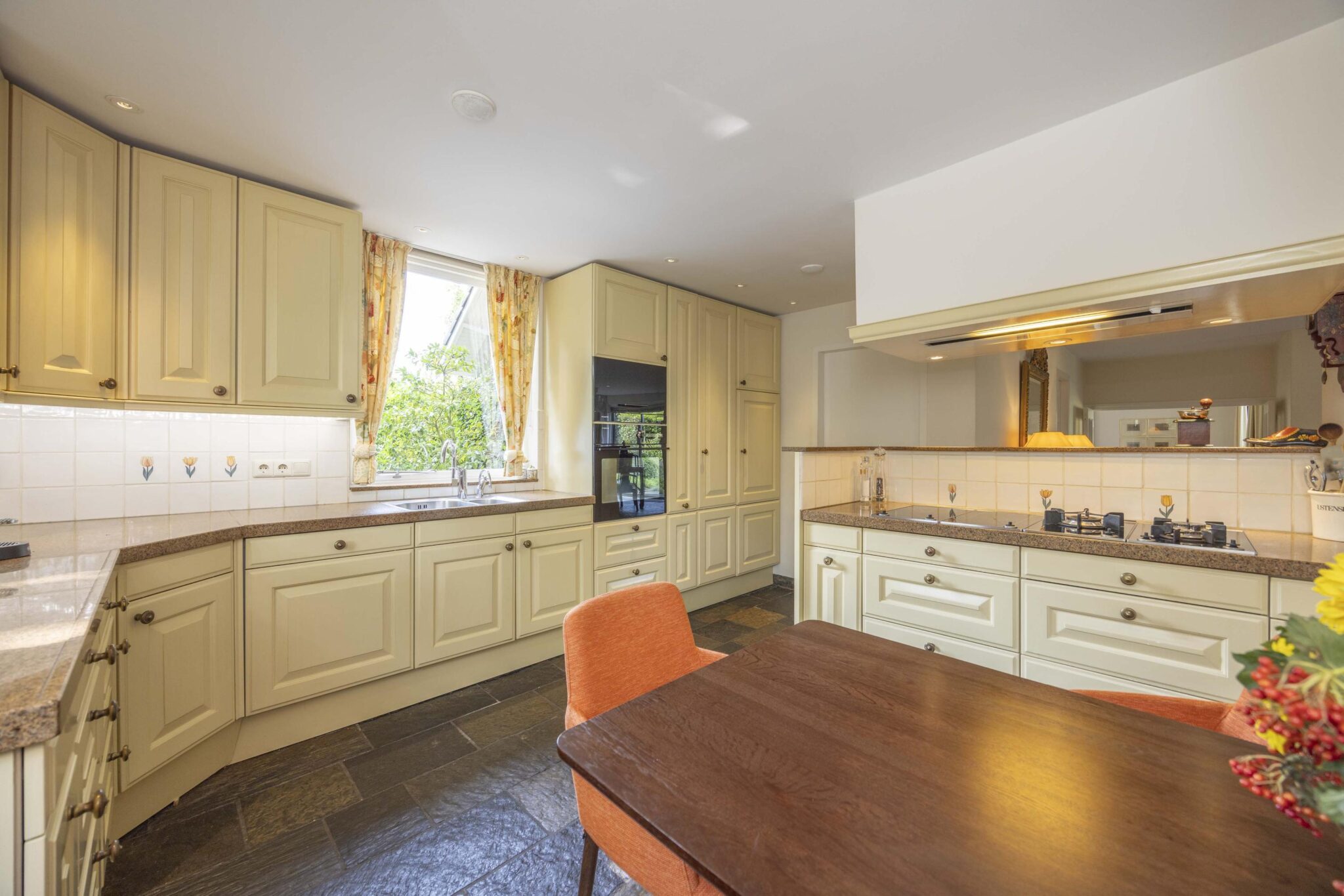 De semi-open keuken is voorzien van een hoekopstelling, extra aanrecht met kookplaat (gas en elektrisch), afzuigkap, stoomoven, magnetron en vaatwasser, de keuken is daarnaast voorzien van een natuurstenen aanrechtblad. Vanuit de keuken heeft u toegang tot de bijkeuken met aansluitingen voor wasmachines en uitstortgootsteen, en een deur naar de oprit.