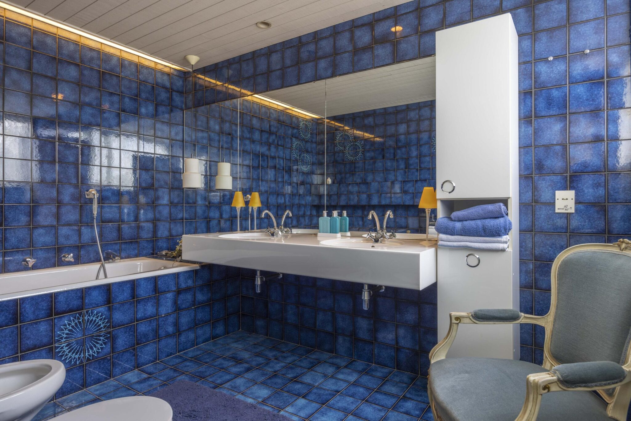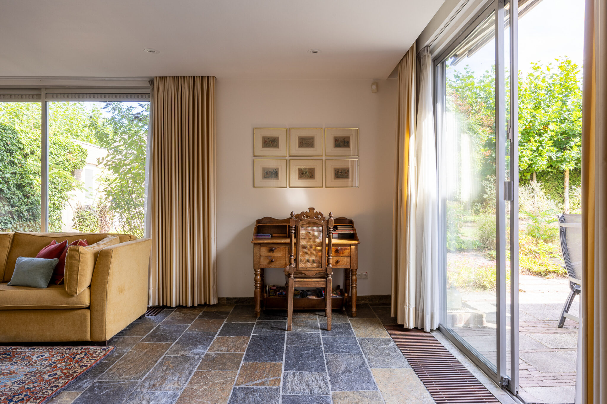 Aansluitend vindt u de tuinkamer, die iets verdiept ligt en eveneens een open haard en schuifpui naar de tuin heeft. De ideale plek voor een atelier, speelkamer of relaxruimte. Aangrenzend bevindt zich de saunakamer met dompel/ijsbad, inloopdouche en vaste kast.
