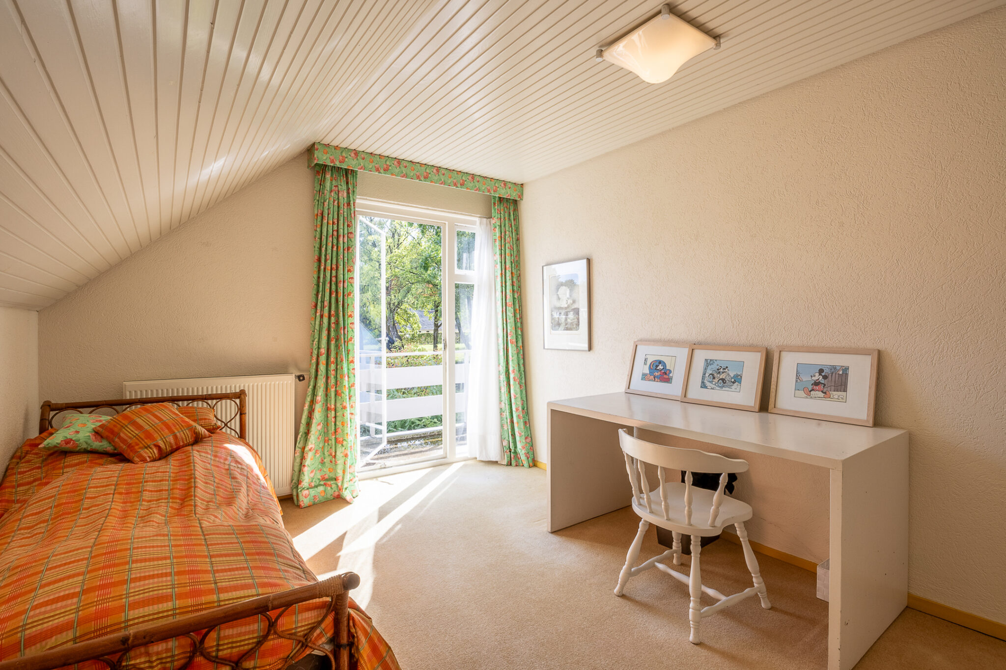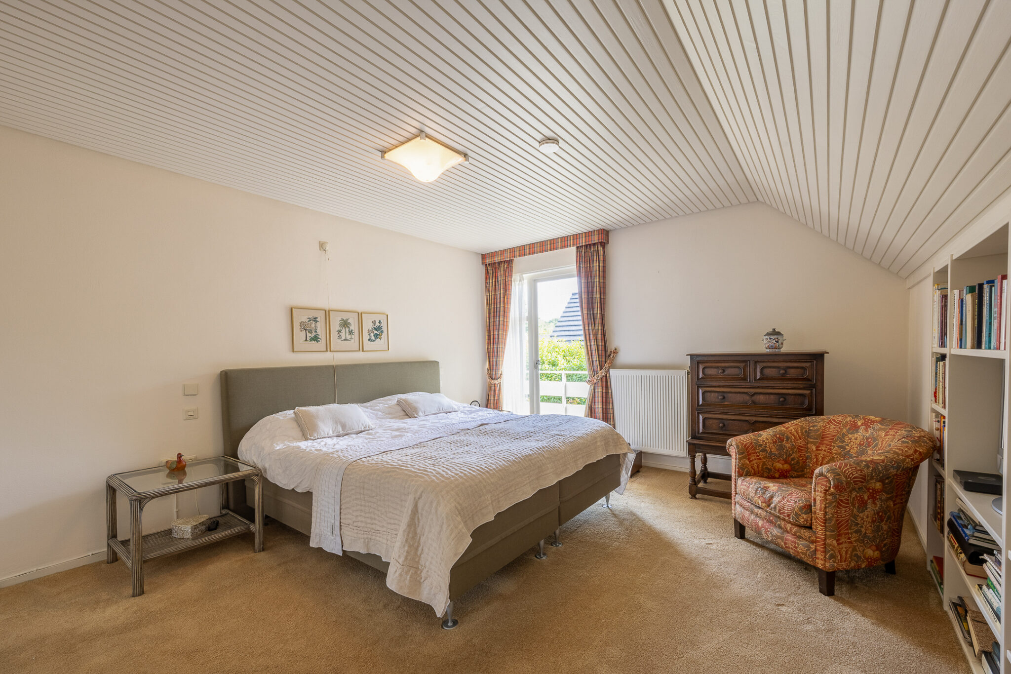 De hoge nok, de grote schuifpui welke toegang biedt tot een balkon, de inbouwkasten (en een verborgen opbergruimte) geven deze slaapkamer een zeer luxe elan.
