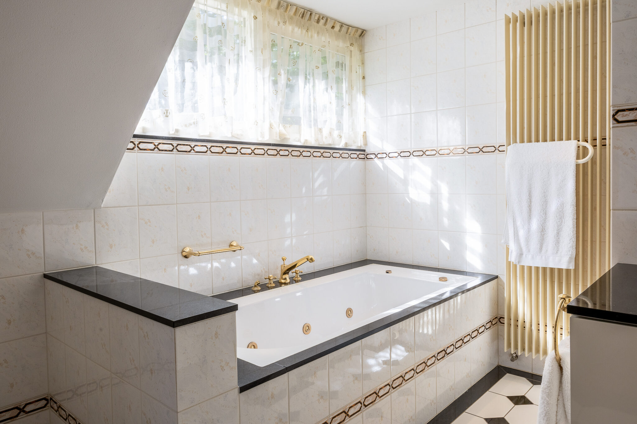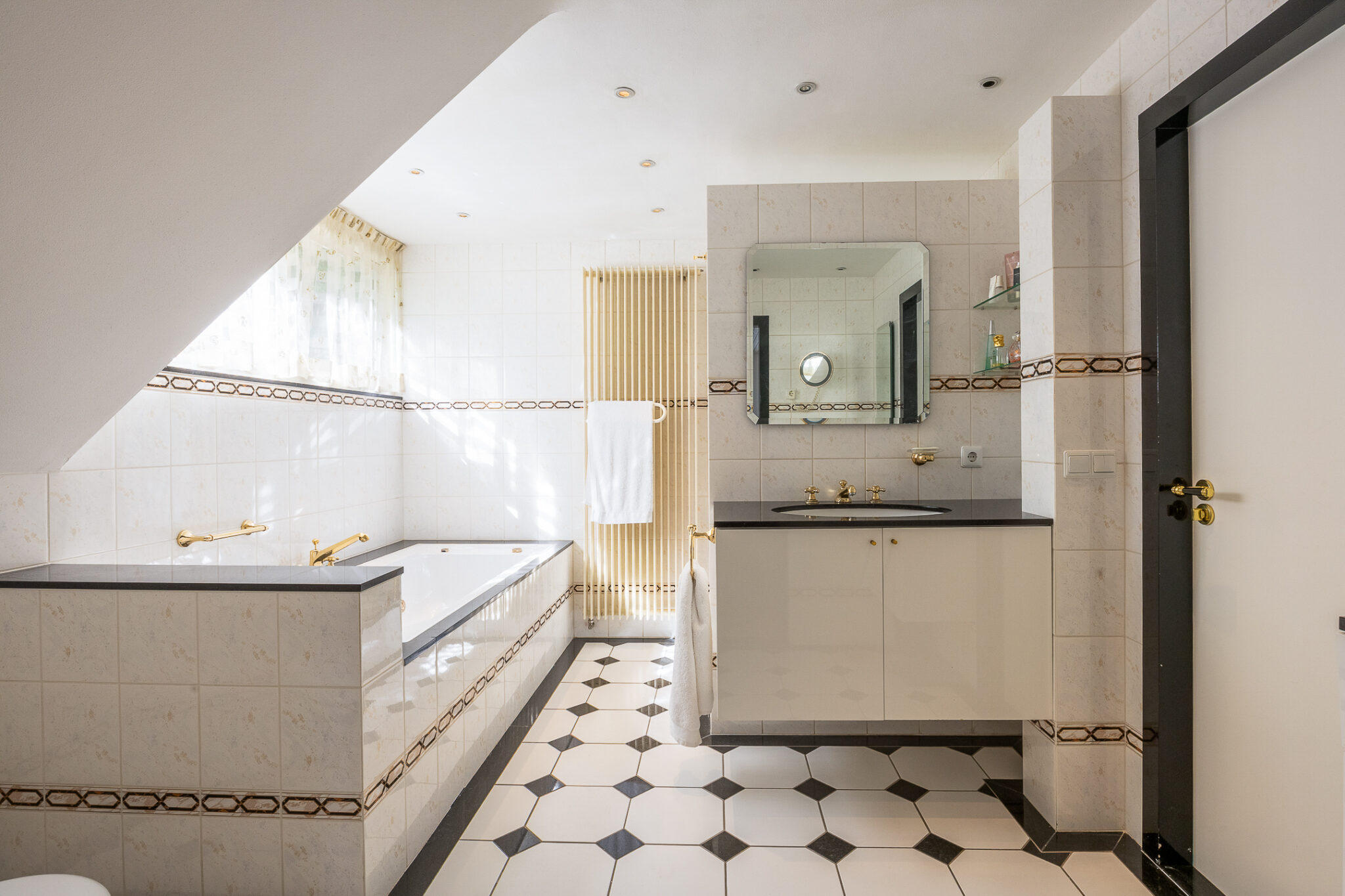 De badkamer heeft een stijlvolle zwart-wit kleurstelling en is volledig uitgerust met een ligbad, douche, toilet en wastafelmeubel.
