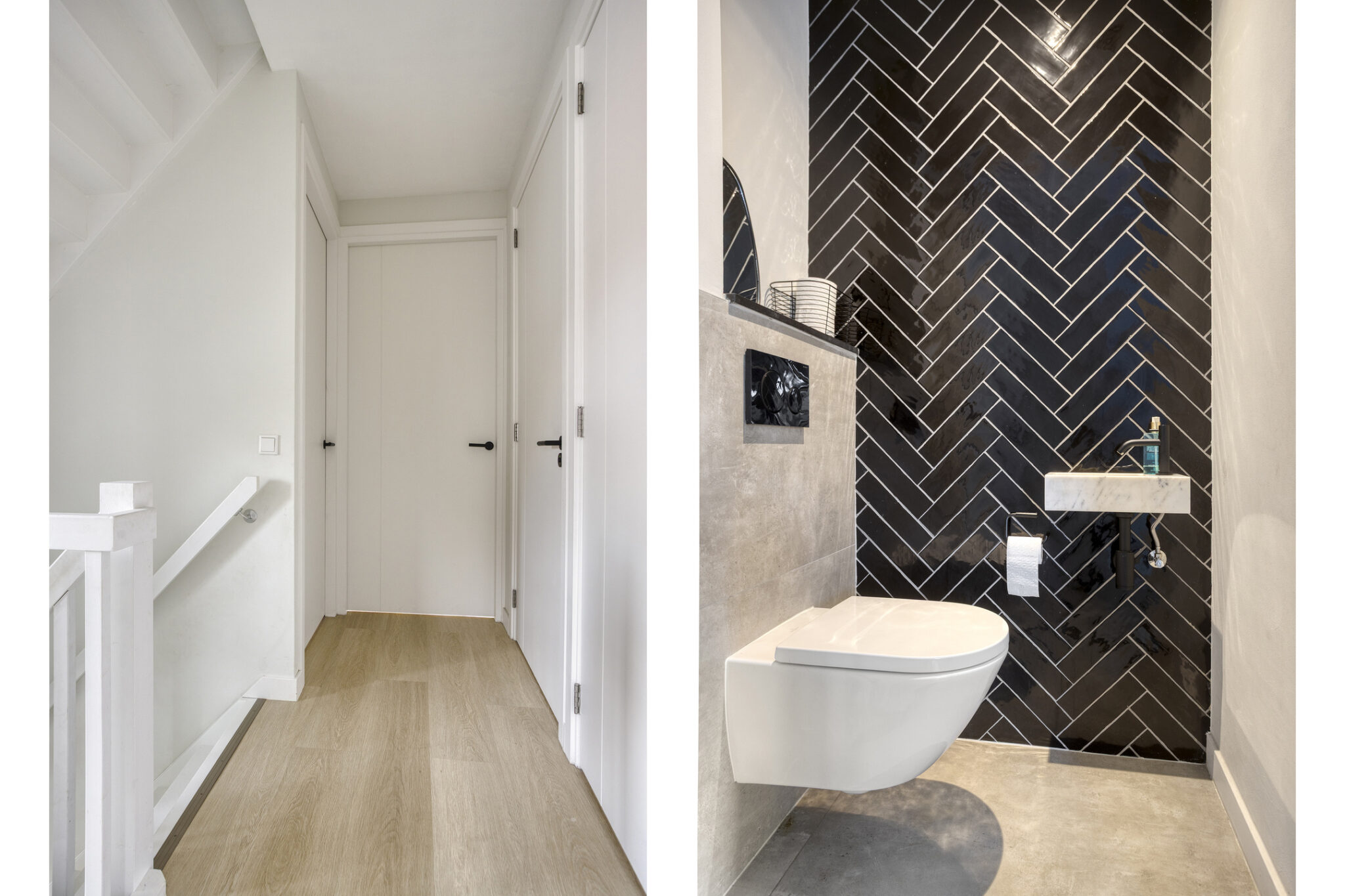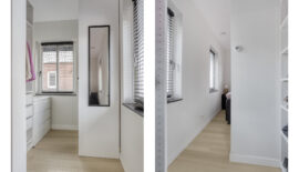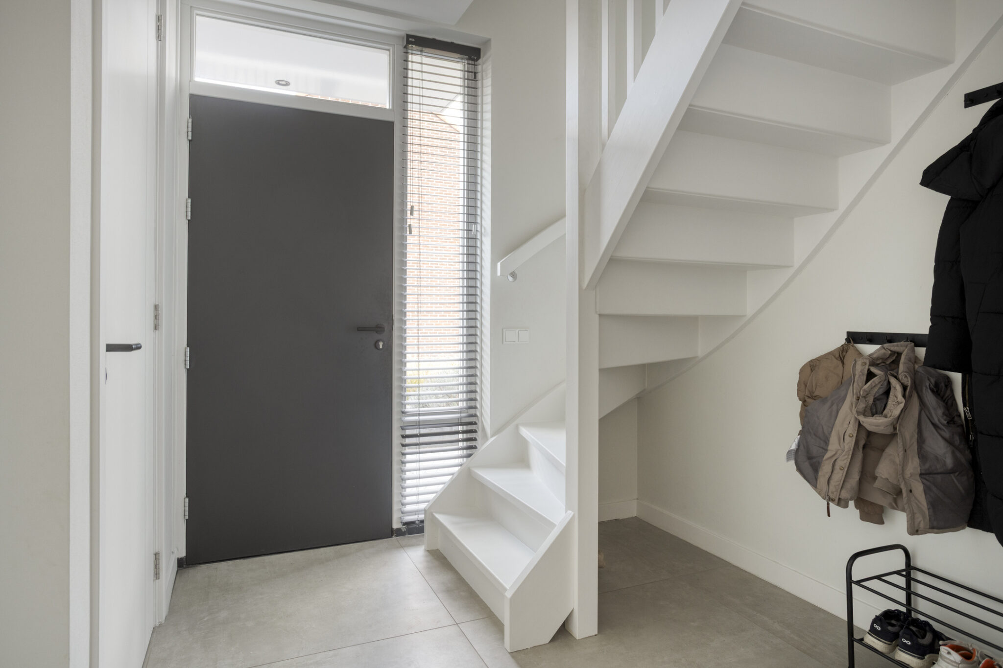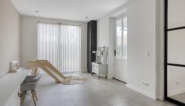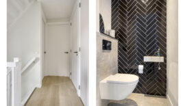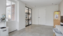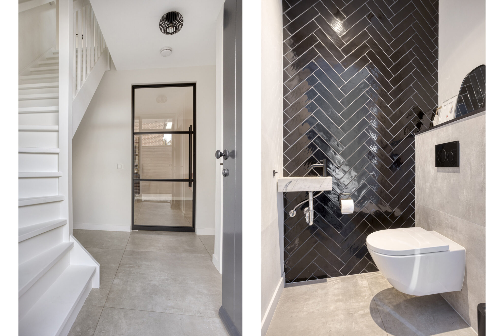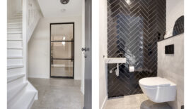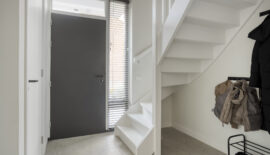 De entree van deze woning bevindt zich aan de zijkant, dit creëert een speelse én praktische indeling in het woongedeelte. Bij binnenkomst is meteen het hoogwaardige afwerkingsniveau van deze woning goed zichtbaar. In de hal is het toilet met fonteintje te vinden, net als de meterkast, en de trapopgang naar de eerste verdieping.
