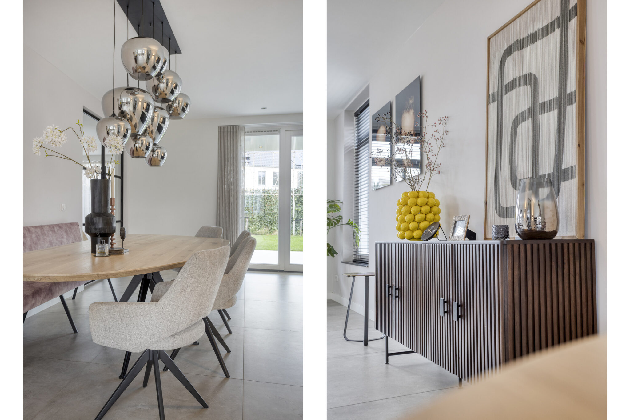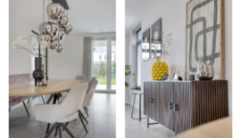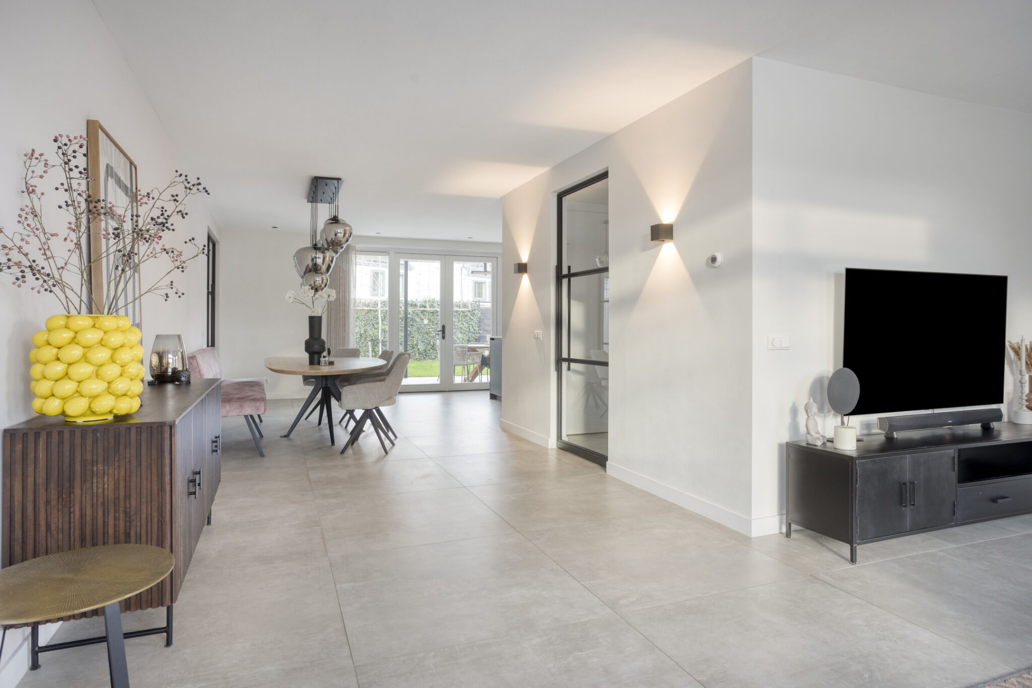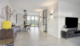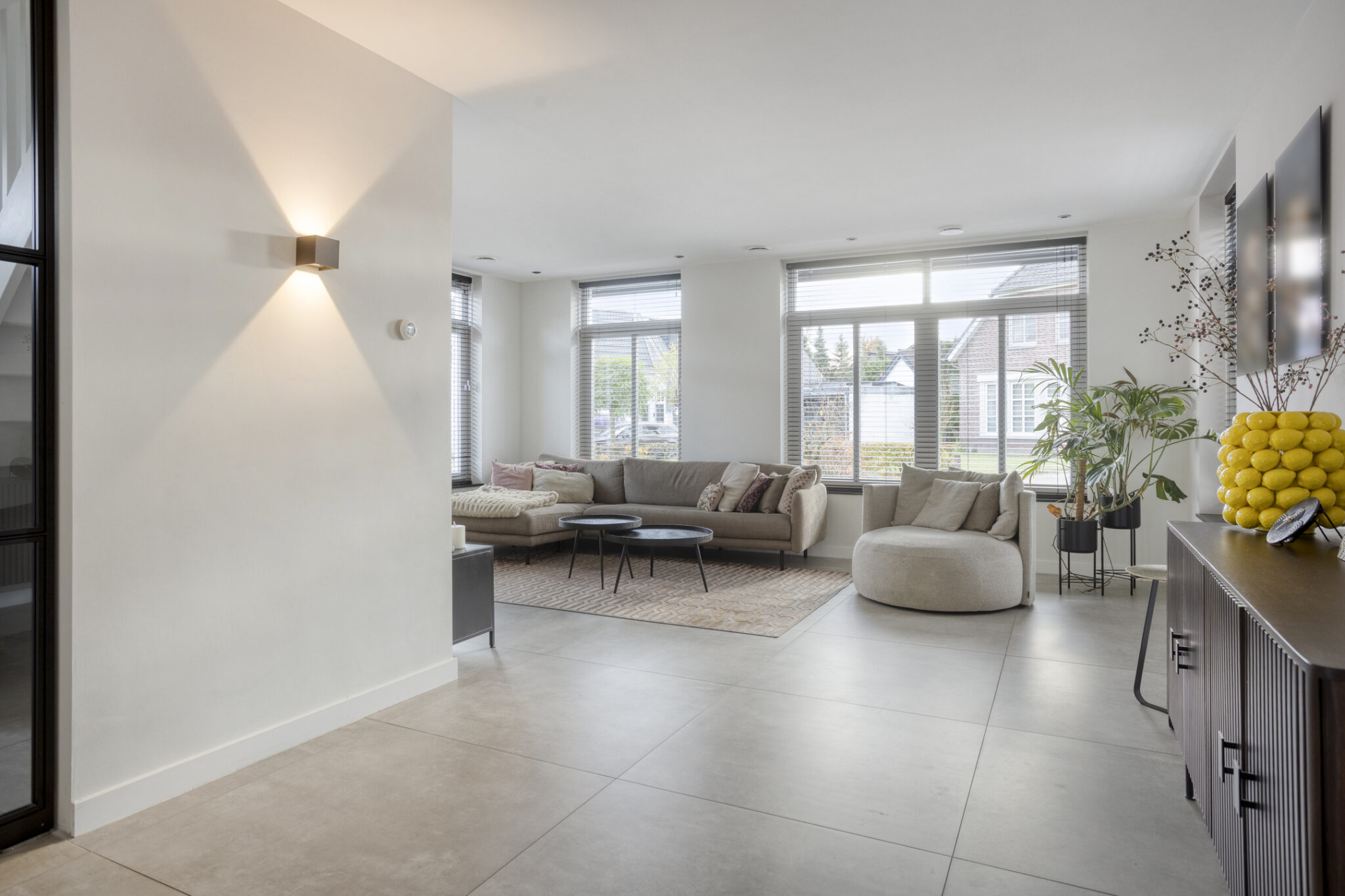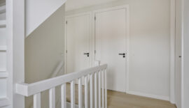 De entree van deze woning bevindt zich aan de zijkant, dit creëert een speelse én praktische indeling in het woongedeelte. Bij binnenkomst is meteen het hoogwaardige afwerkingsniveau van deze woning goed zichtbaar. In de hal is het toilet met fonteintje te vinden, net als de meterkast, en de trapopgang naar de eerste verdieping.