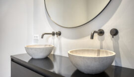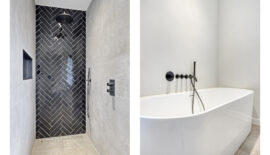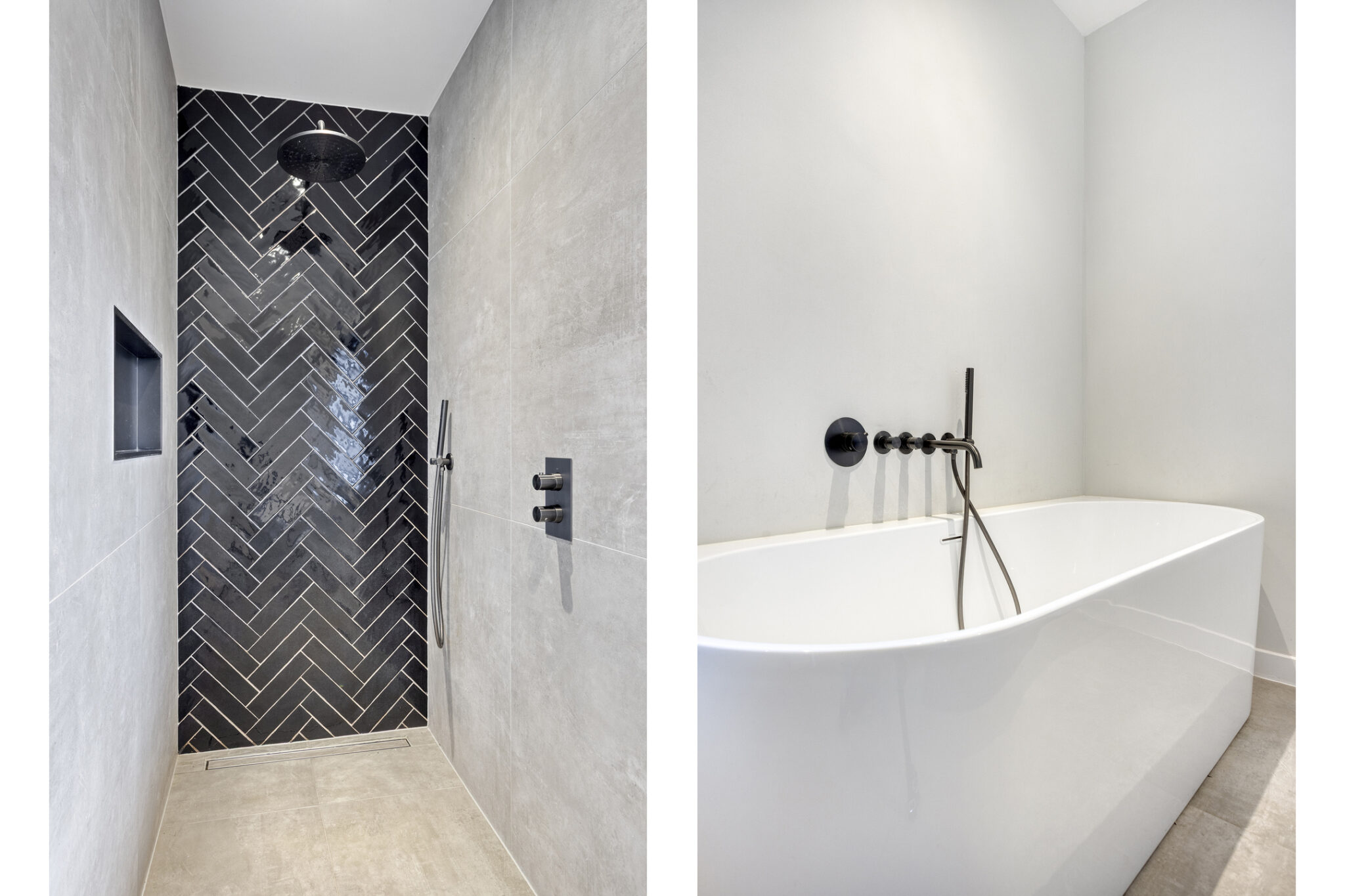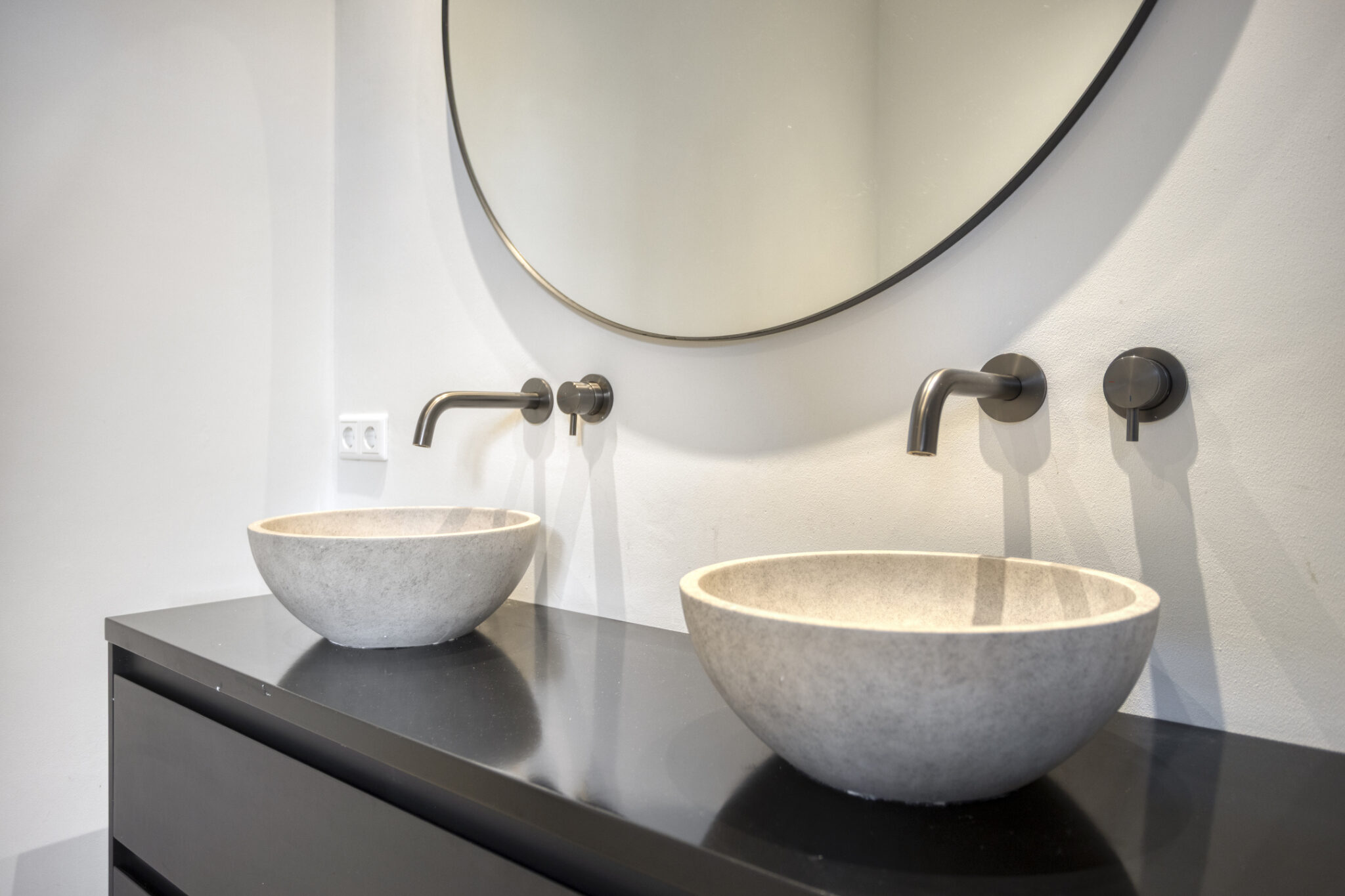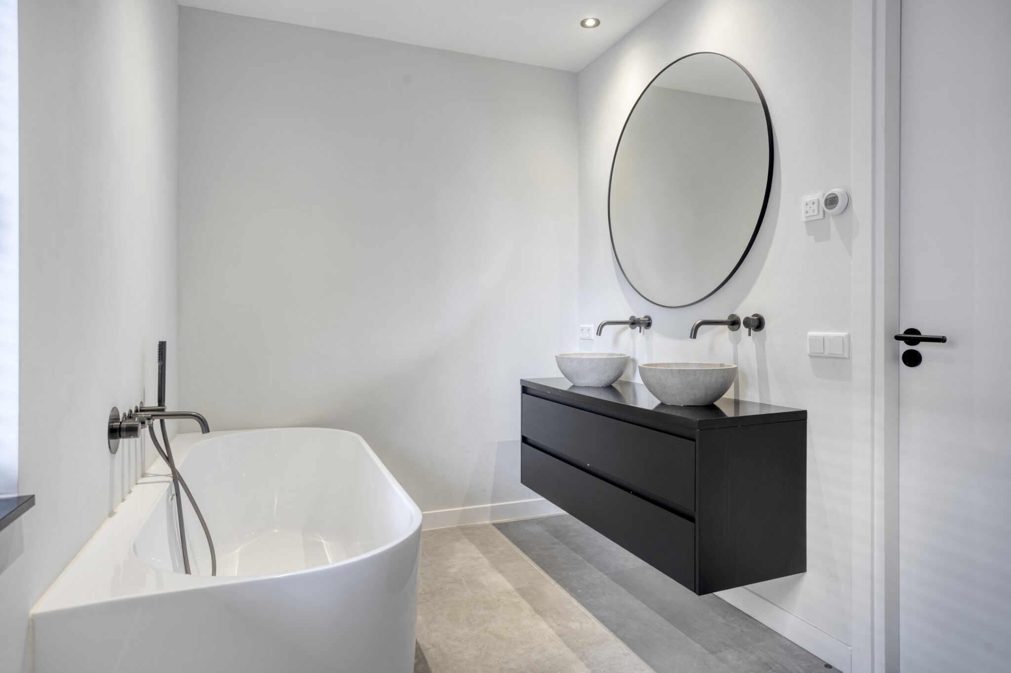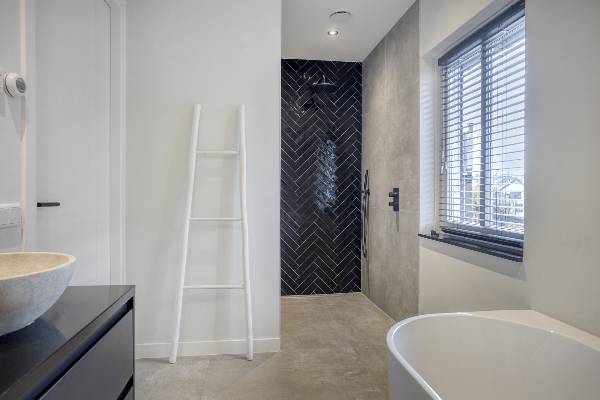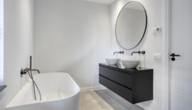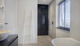 De luxe badkamer is niet alleen modern maar ook van alle gemakken voorzien waarbij het semi-vrijstaande ligbad toch wel de eye-catcher is. Naast dit ligbad biedt de badkamer ook een riante inloopdouche en een dubbele wastafel met waskommen en ingebouwde kranen. Het toilet met fonteintje bevindt zich separaat op de overloop.
