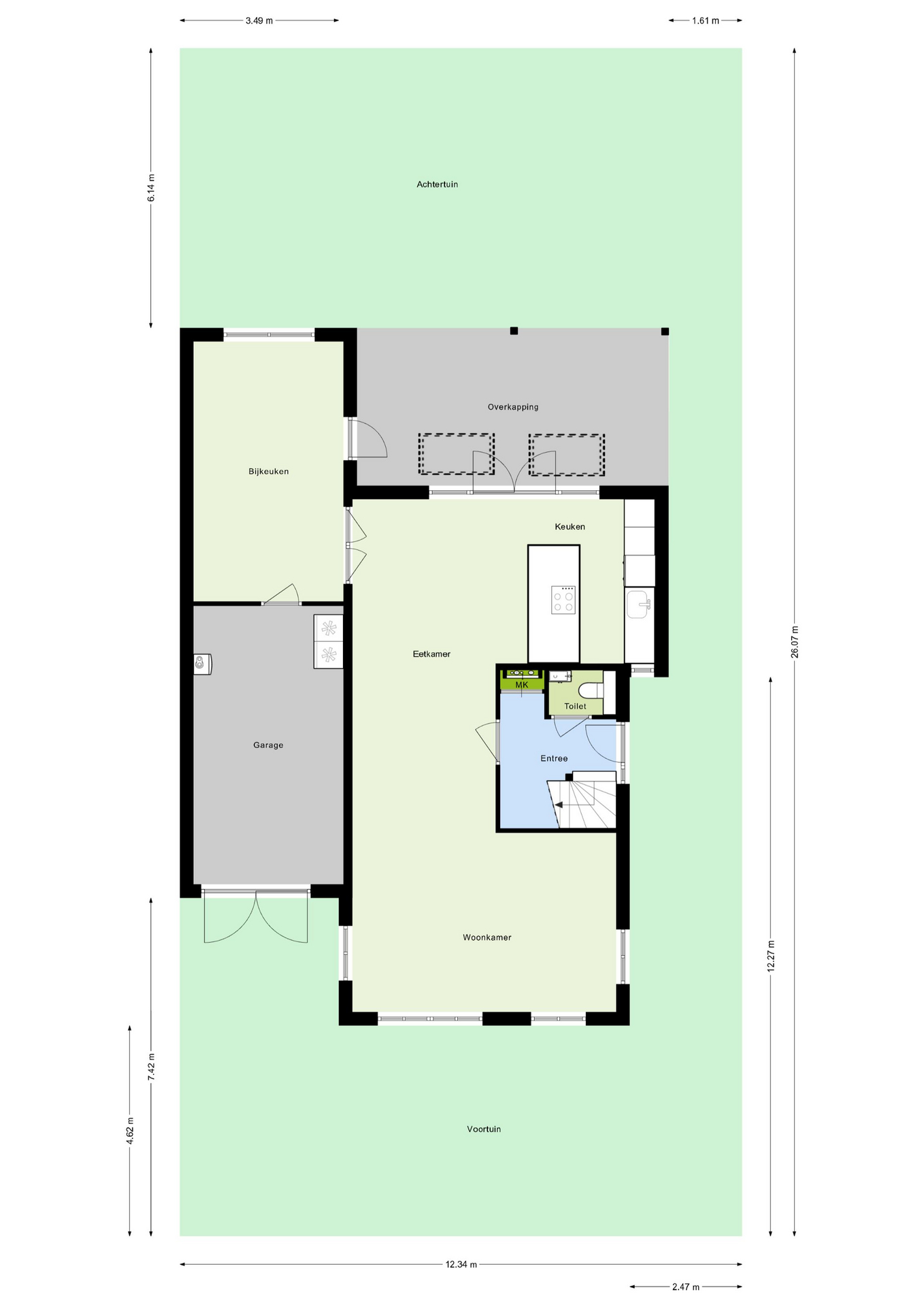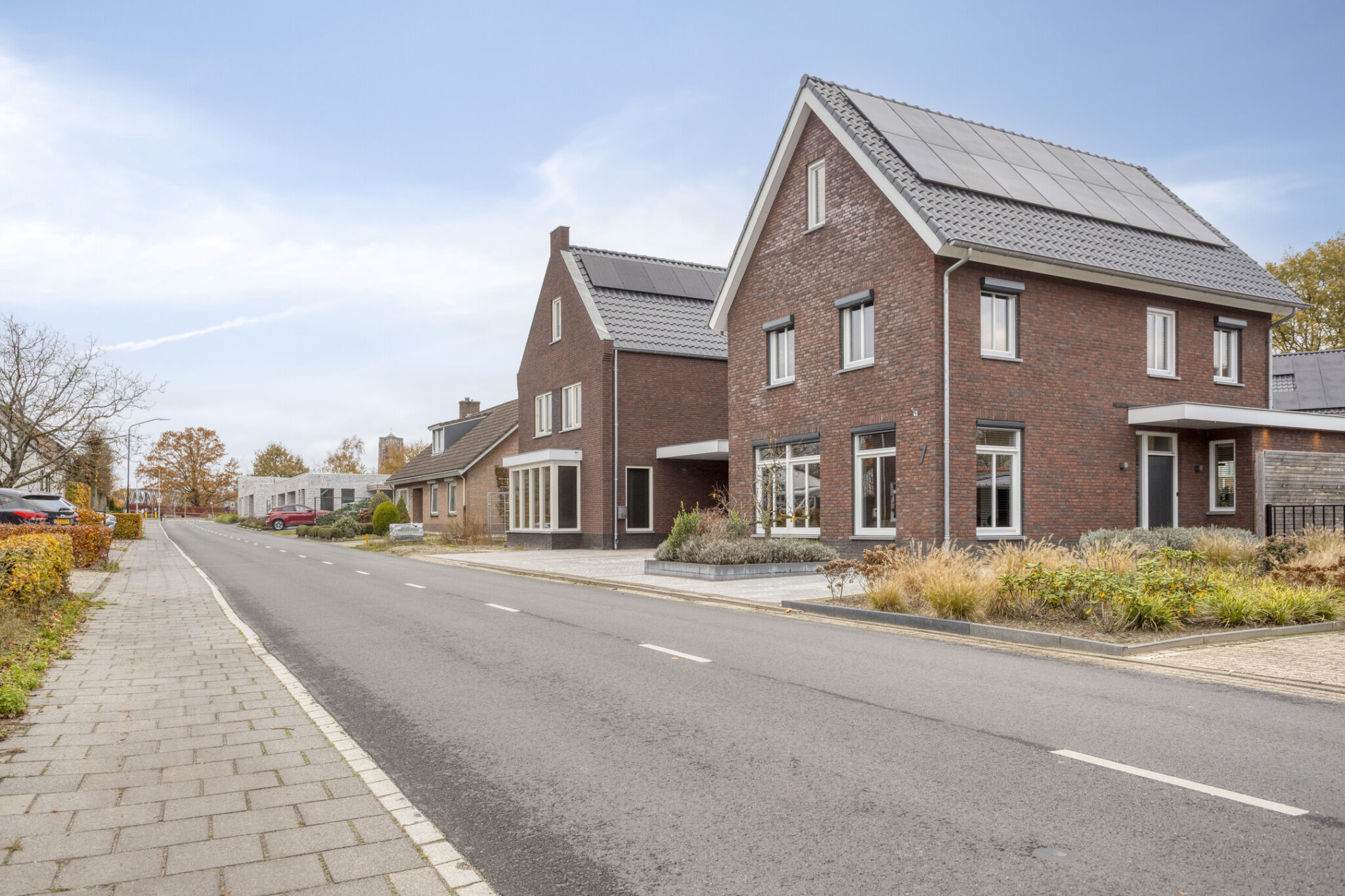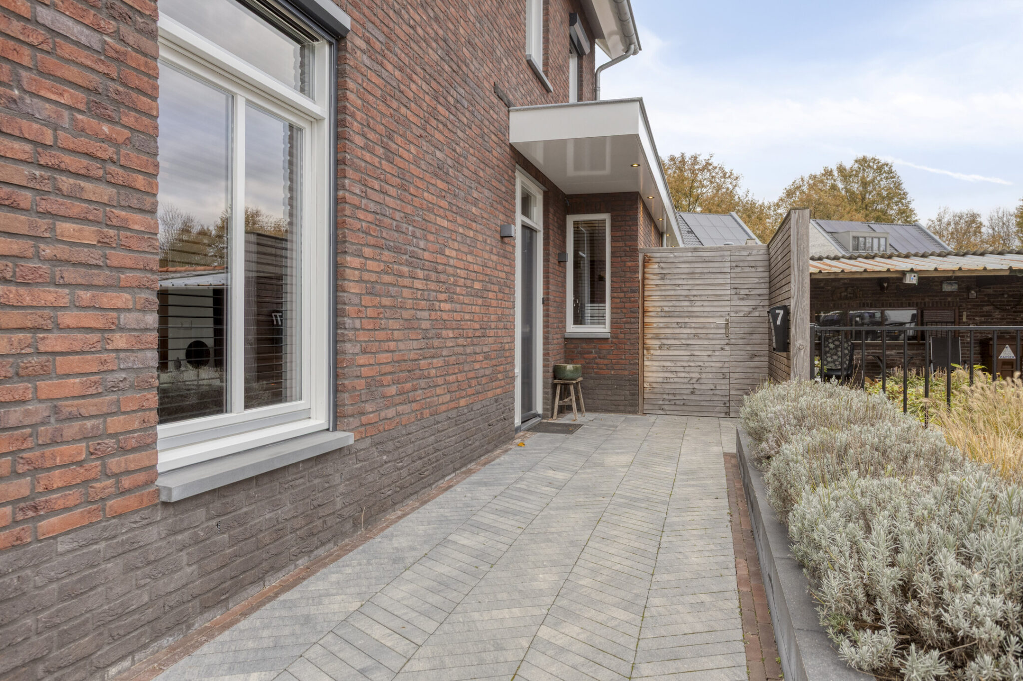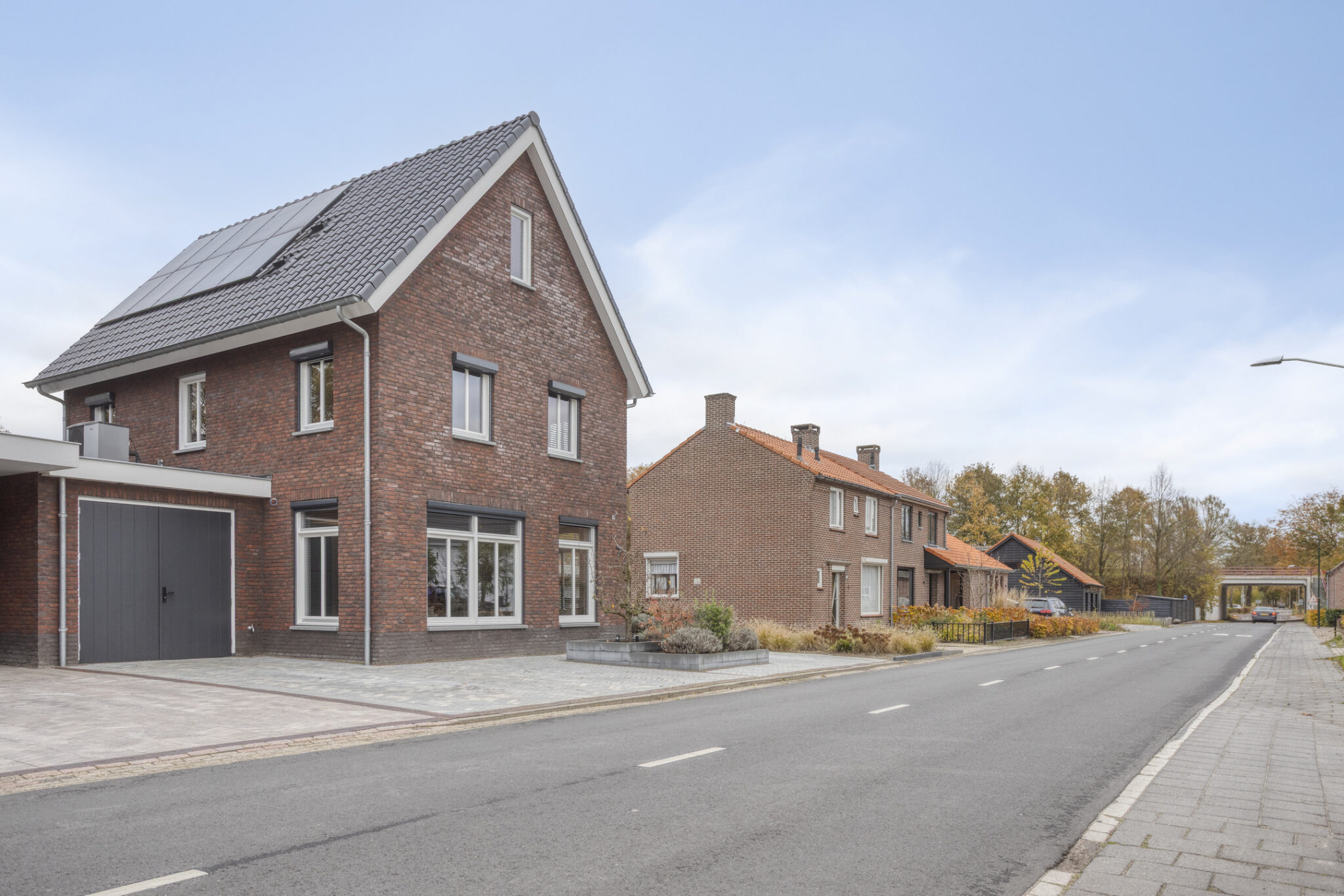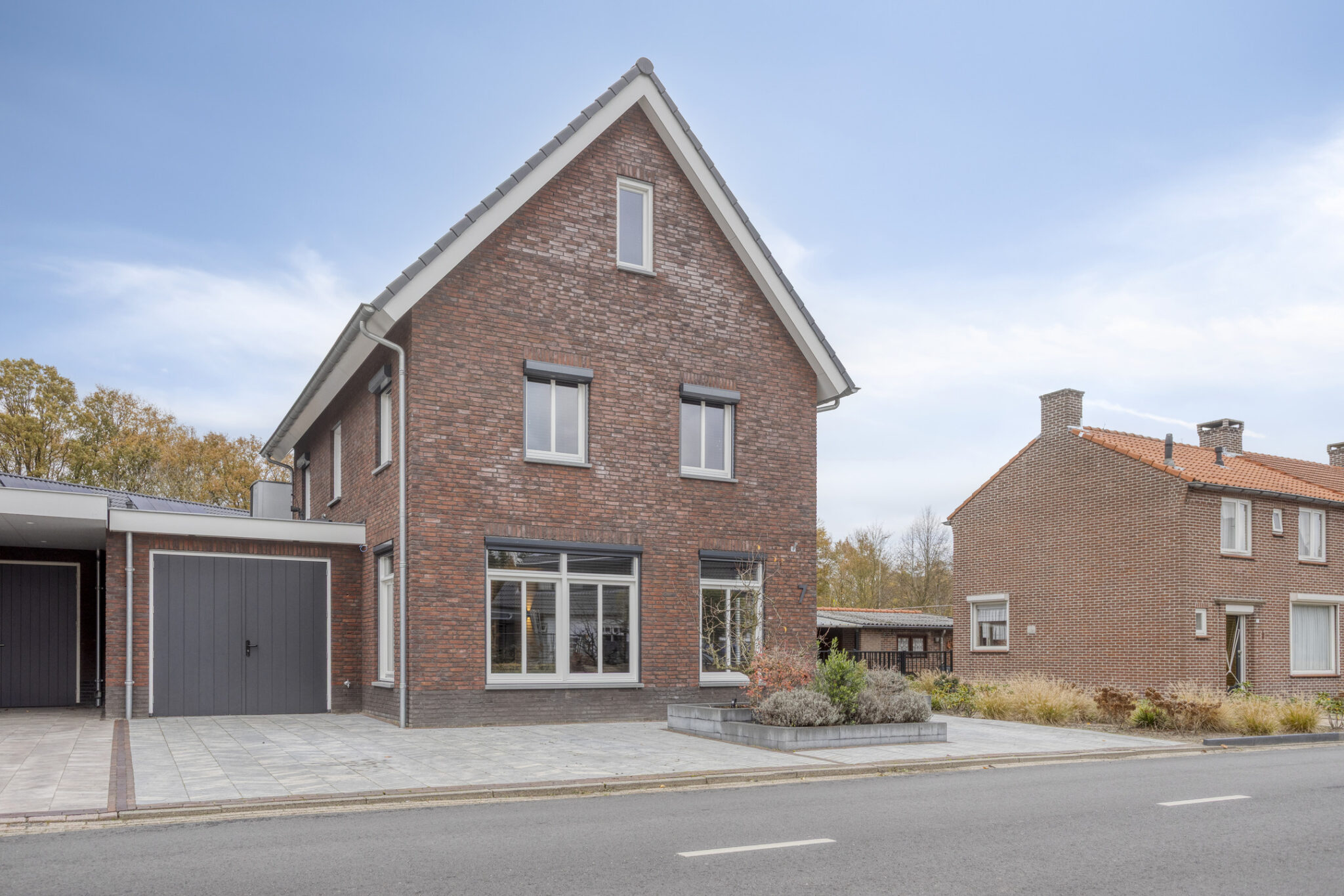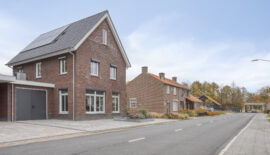 De woning beschikt aan de voorzijde over een dubbele inrit. Via de linkse inrit is de inpandige garage te bereiken. Hier is de warmtepomp met een 300 liter boilervat te vinden.