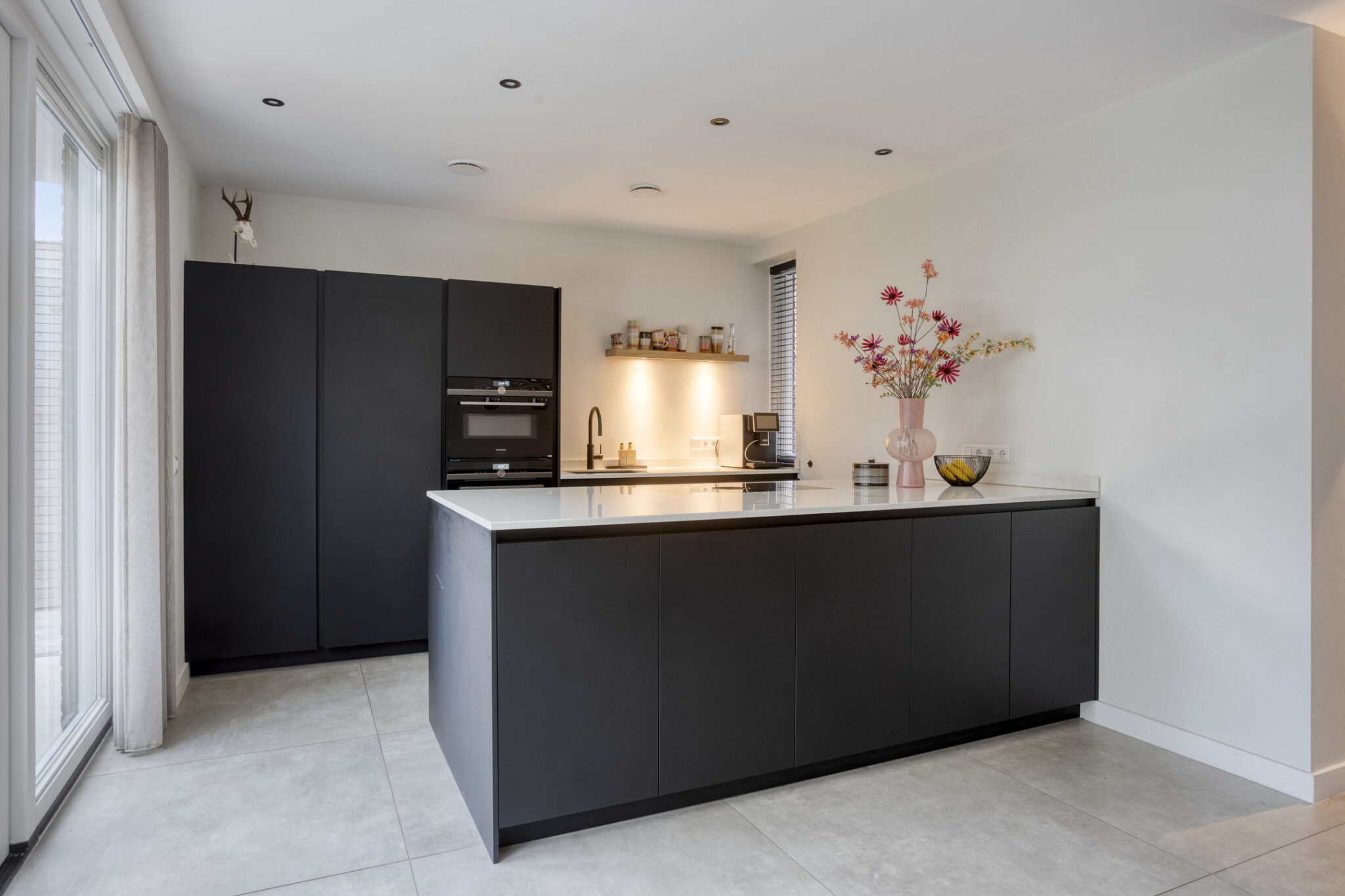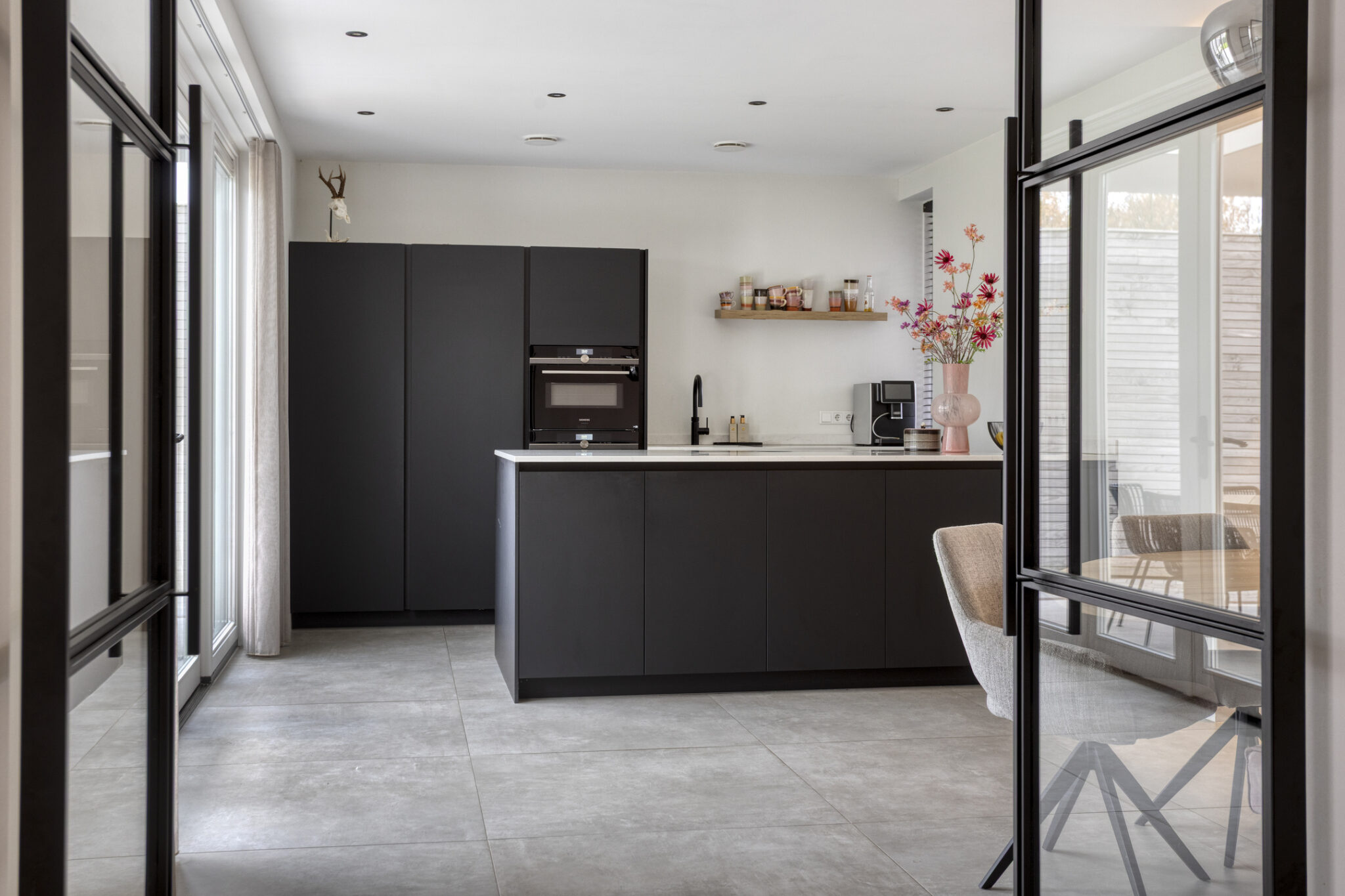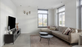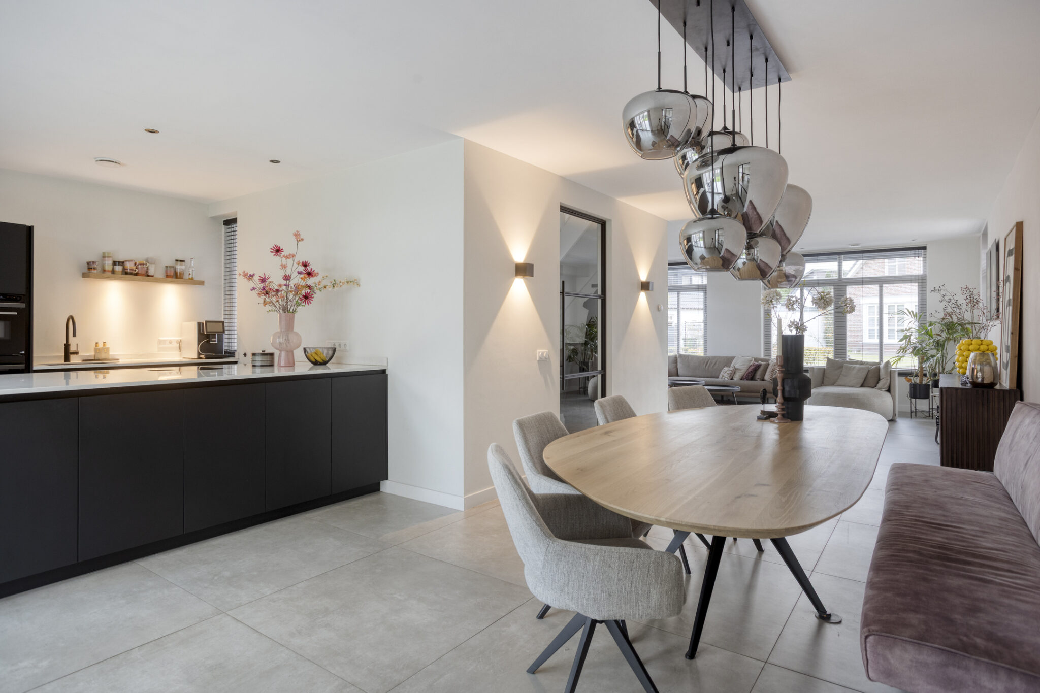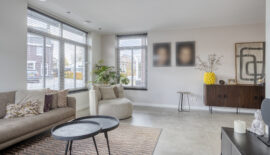 Het woongedeelte is bereikbaar middels een zwarte stalen deur en onder te verdelen in een woonkamer aan de voorzijde en een eetgedeelte met leefkeuken aan de achterzijde. De gehele begane grond is voorzien van een strakke en moderne tegelvloer met zowel vloerverwarming- als koeling. Door de vele raampartijen is het woongedeelte zeer licht.