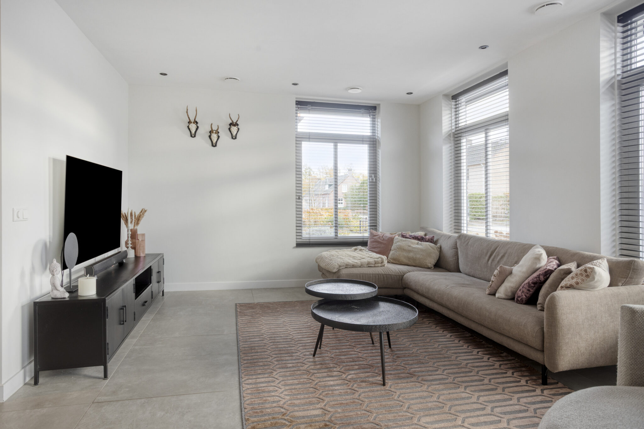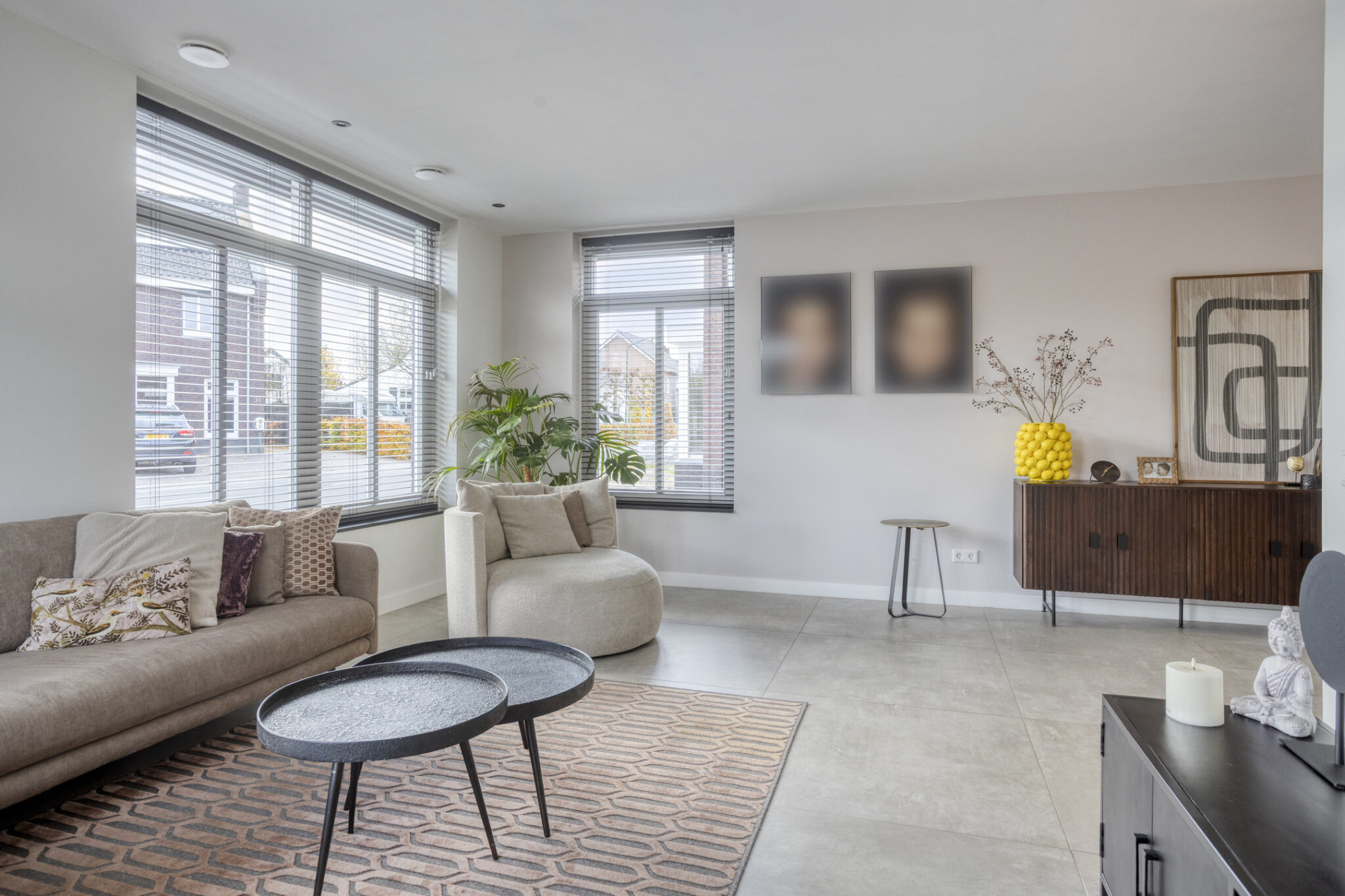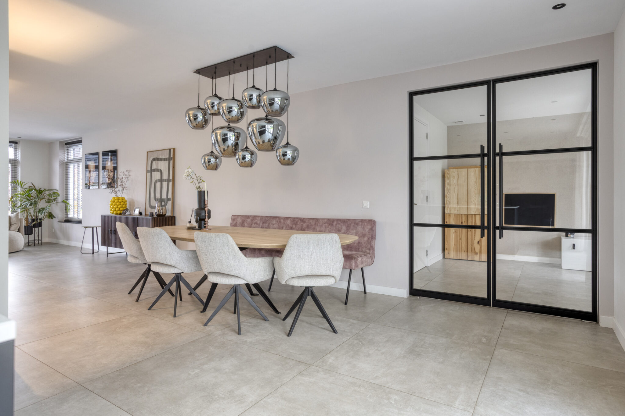 Het woongedeelte is bereikbaar middels een zwarte stalen deur en onder te verdelen in een woonkamer aan de voorzijde en een eetgedeelte met leefkeuken aan de achterzijde. De gehele begane grond is voorzien van een strakke en moderne tegelvloer met zowel vloerverwarming- als koeling. Door de vele raampartijen is het woongedeelte zeer licht.