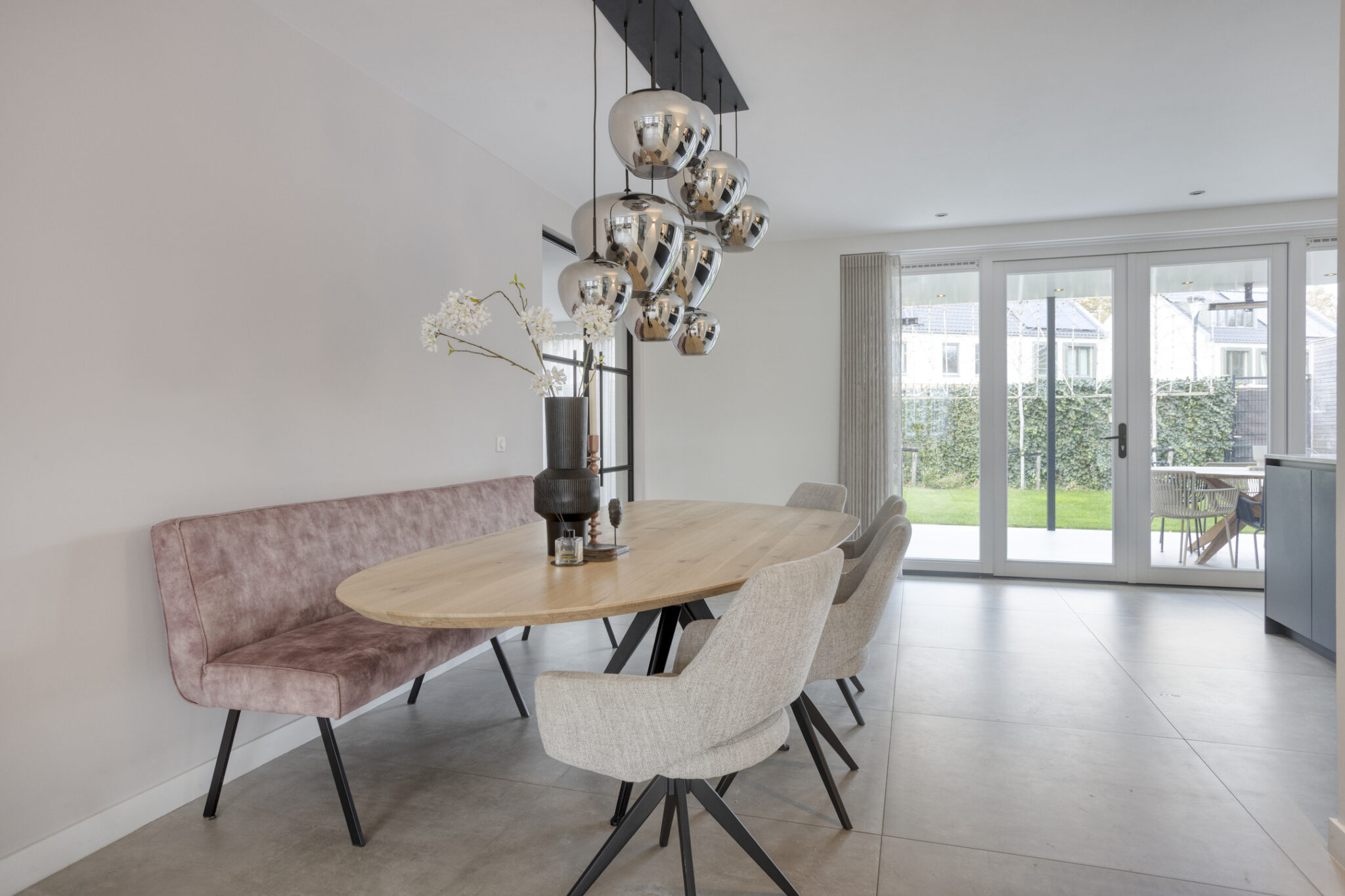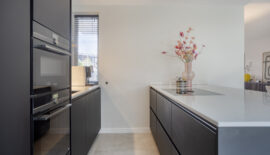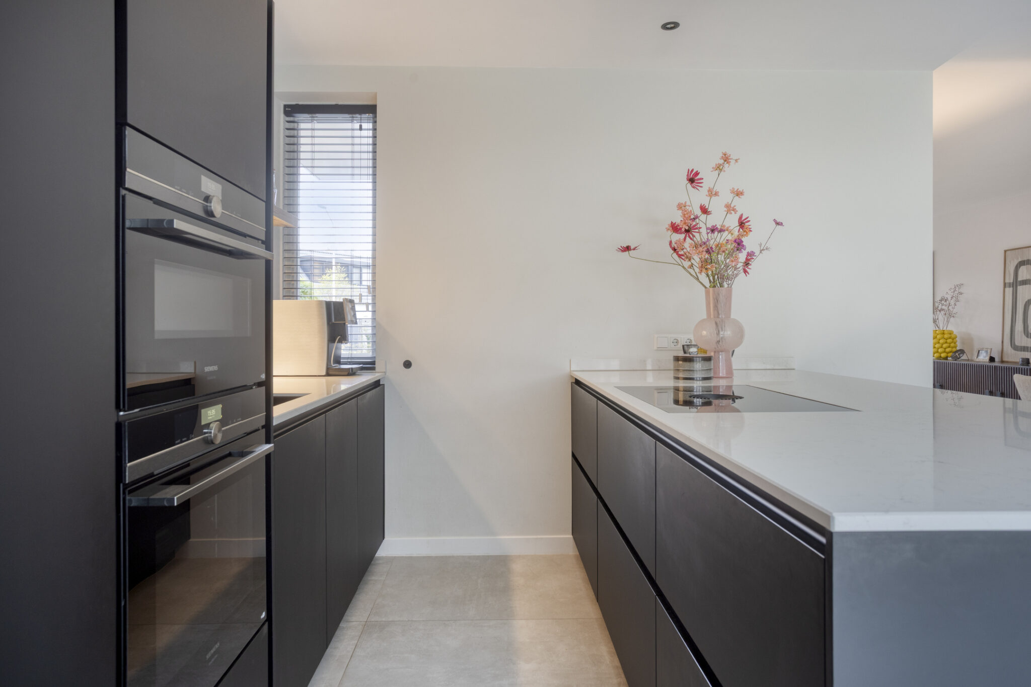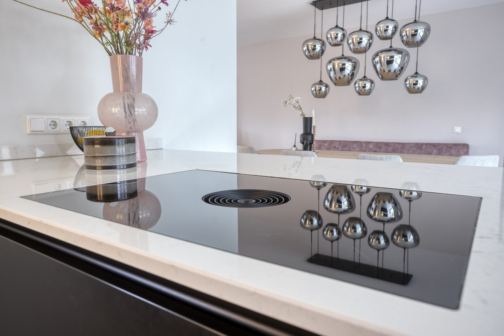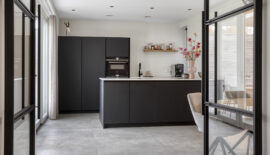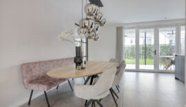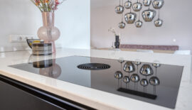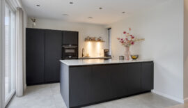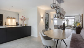 Aan de achterzijde is ruimte voor een eettafel en bevindt zich de keuken. De moderne keuken is geplaatst in een wandopstelling en een schiereiland. Qua apparatuur voorziet de keuken in een koelkast, vriezer, magnetron, oven, vaatwasser en Quooker. De kookplaat is van BORA met geïntegreerde afzuiging.